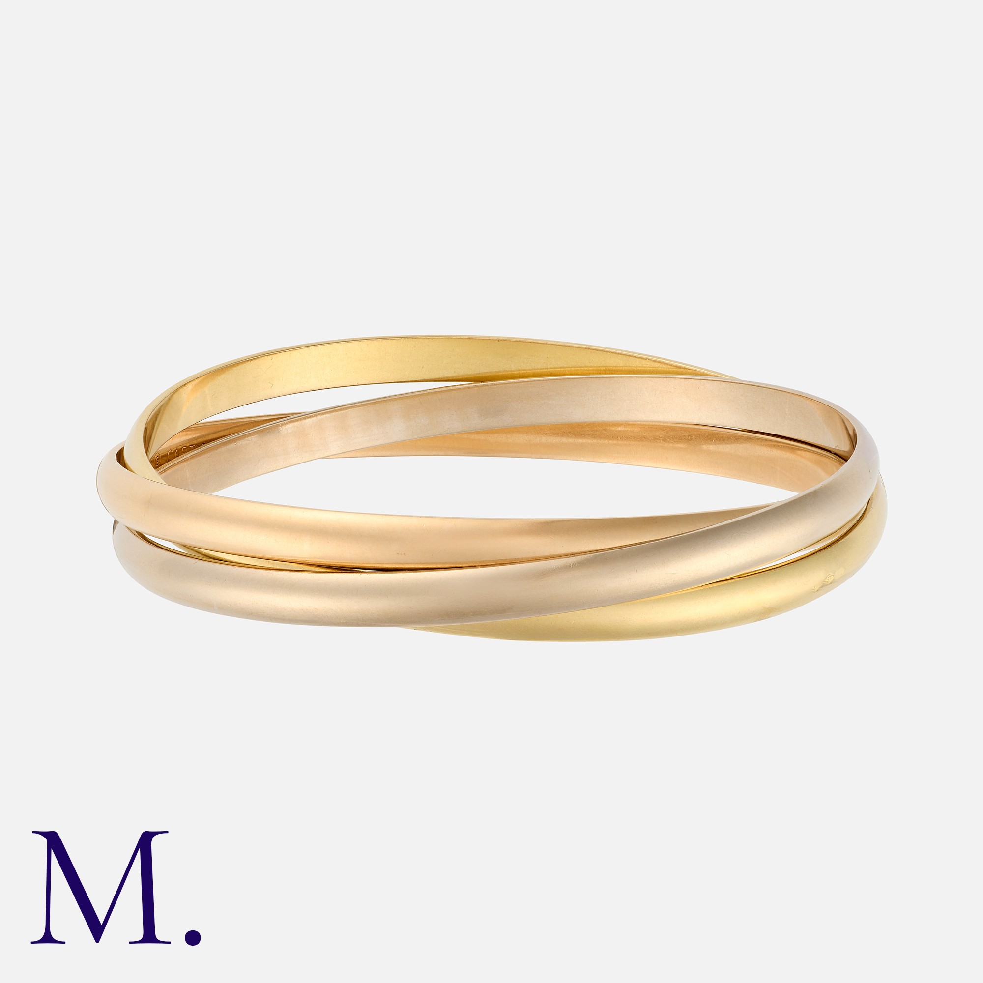CARTIER. A Trinity Bangle in 18K yellow, white and rose gold of interlocking bangle design (each approx. 4mm wide). Signed Cartier and serial numbered. French marks for 18ct gold.