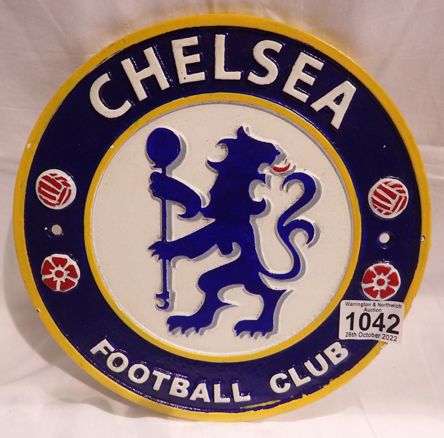 Chelsea football club sign, D: 25 cm. P&P Group 2 (£18+VAT for the first lot and £3+VAT for subsequent lots)