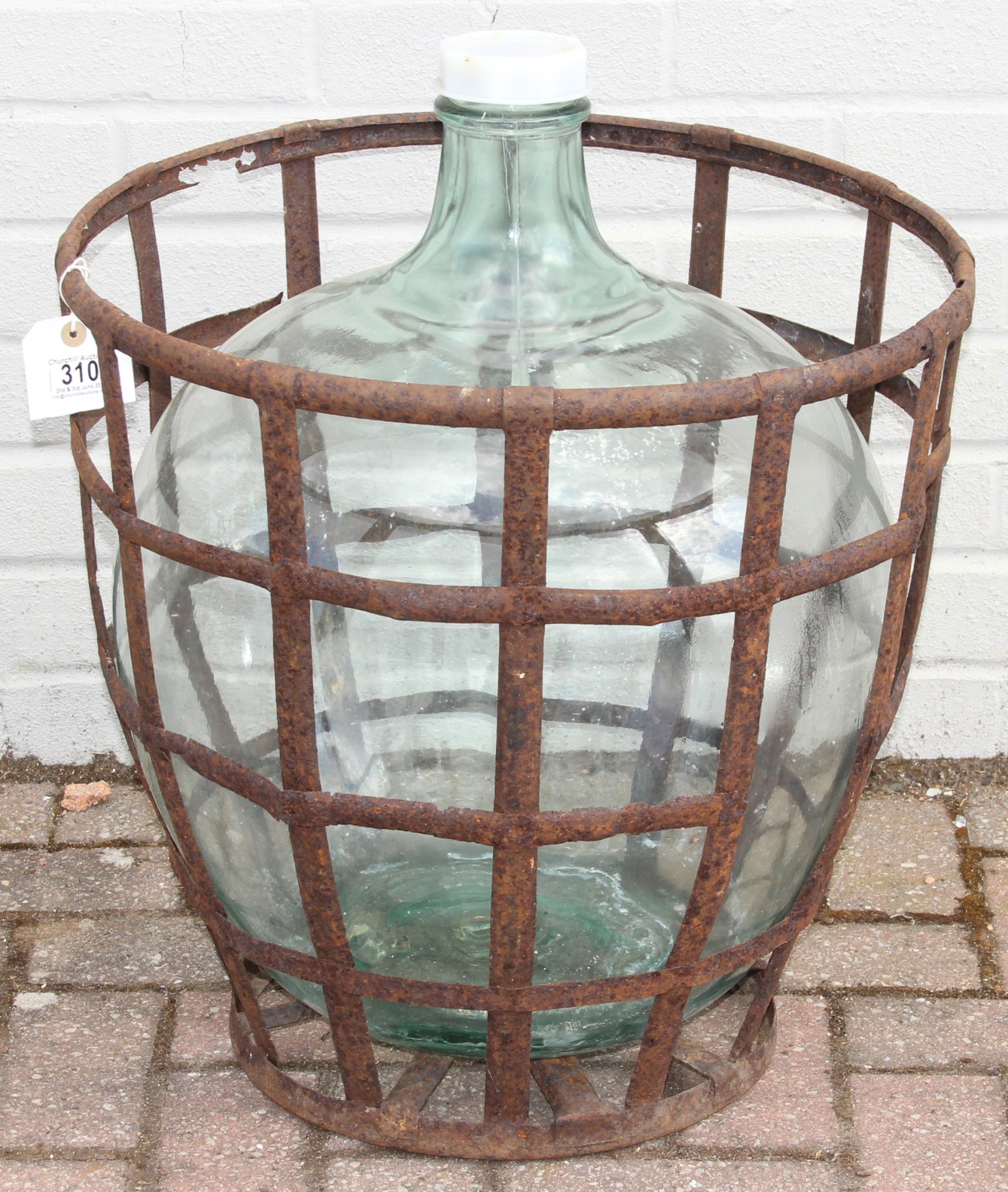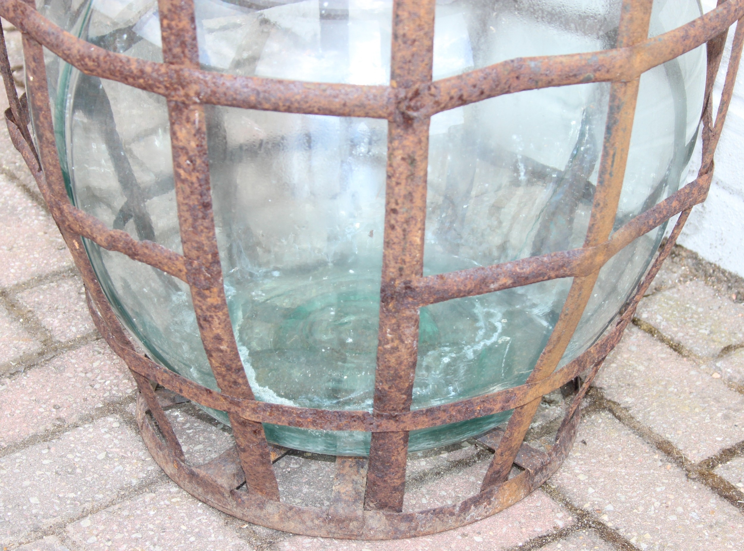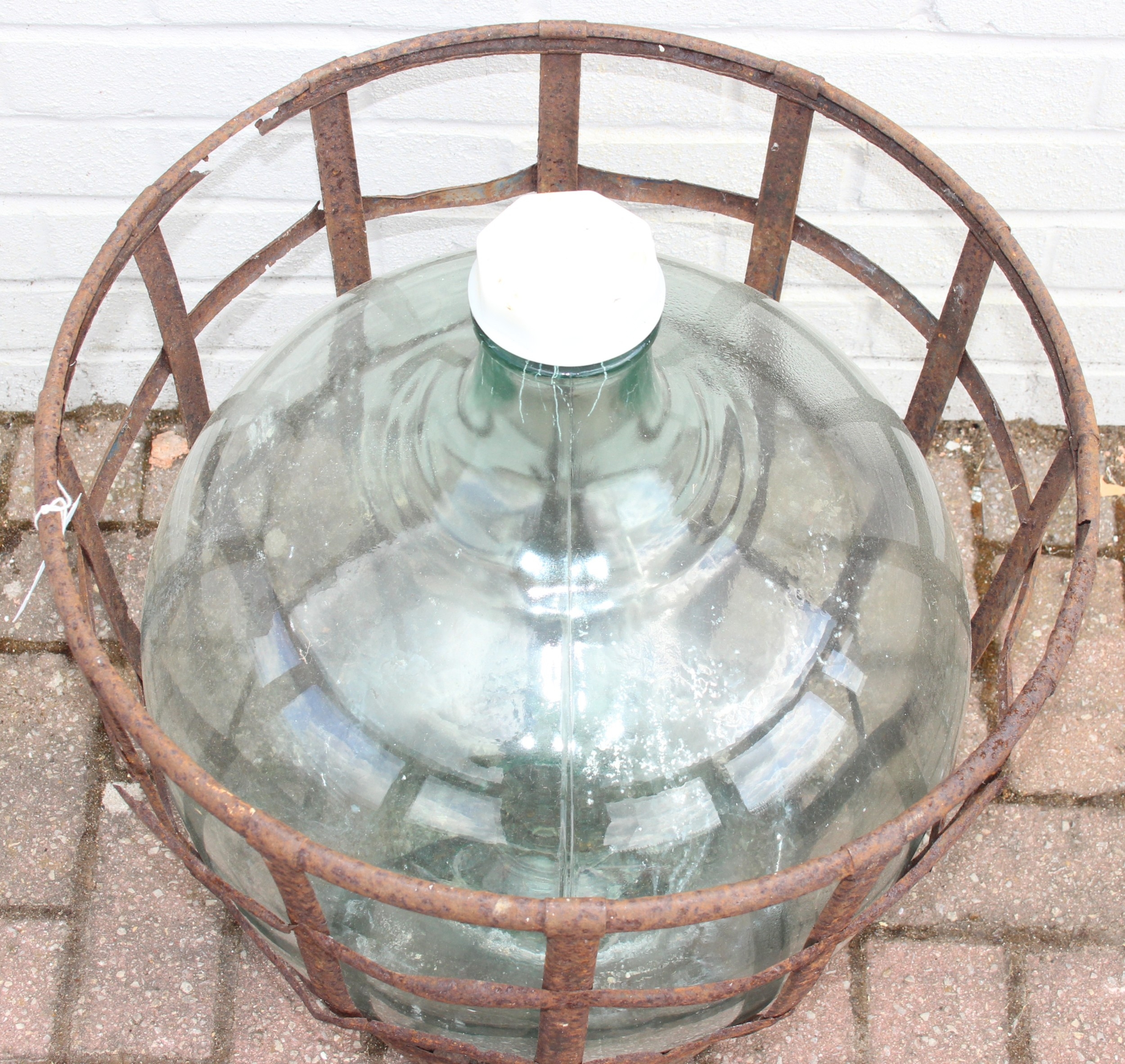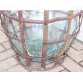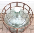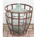 A large vintage glass carboy in iron basket, 52cm in diameter x 62cm tall