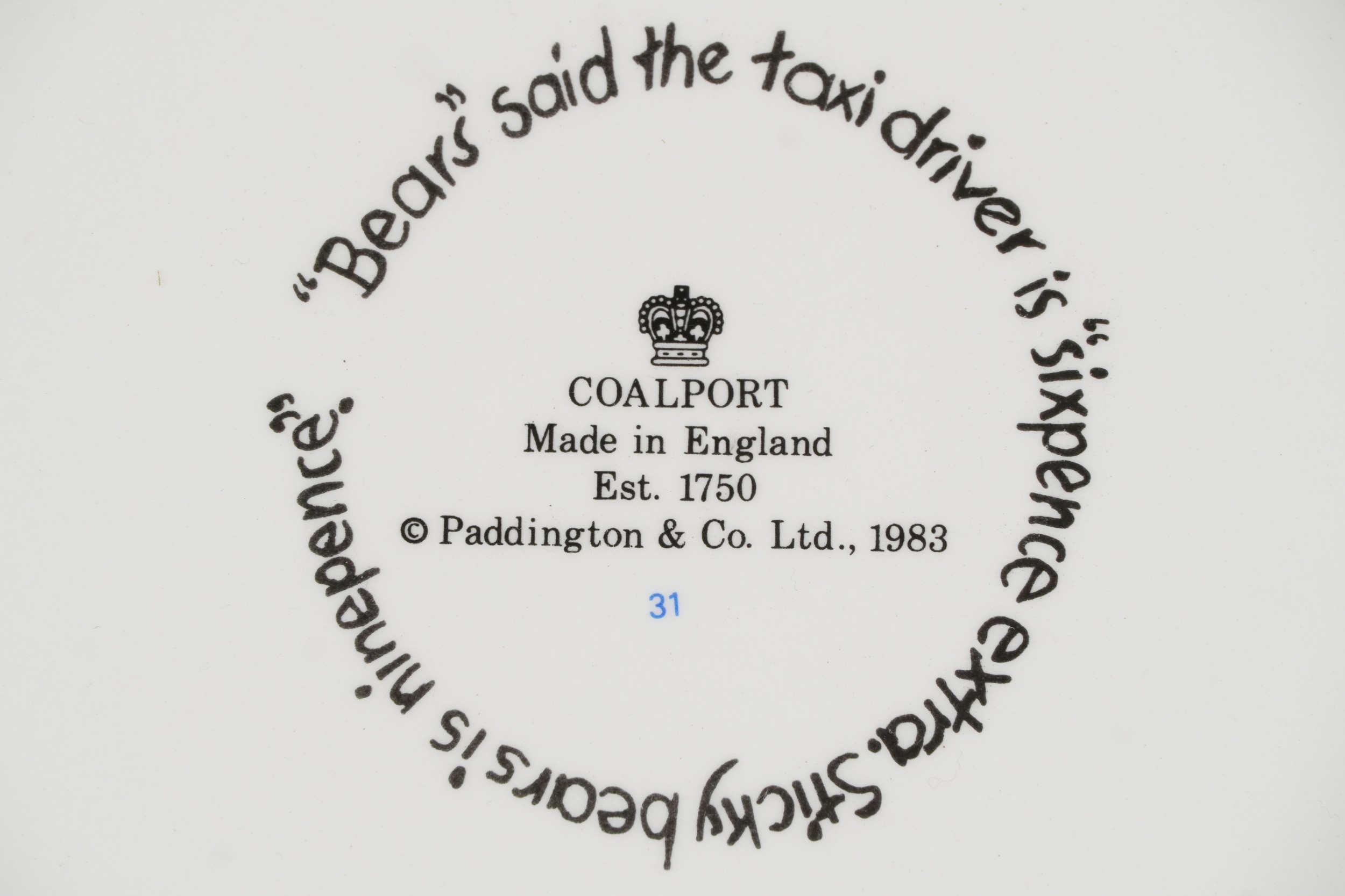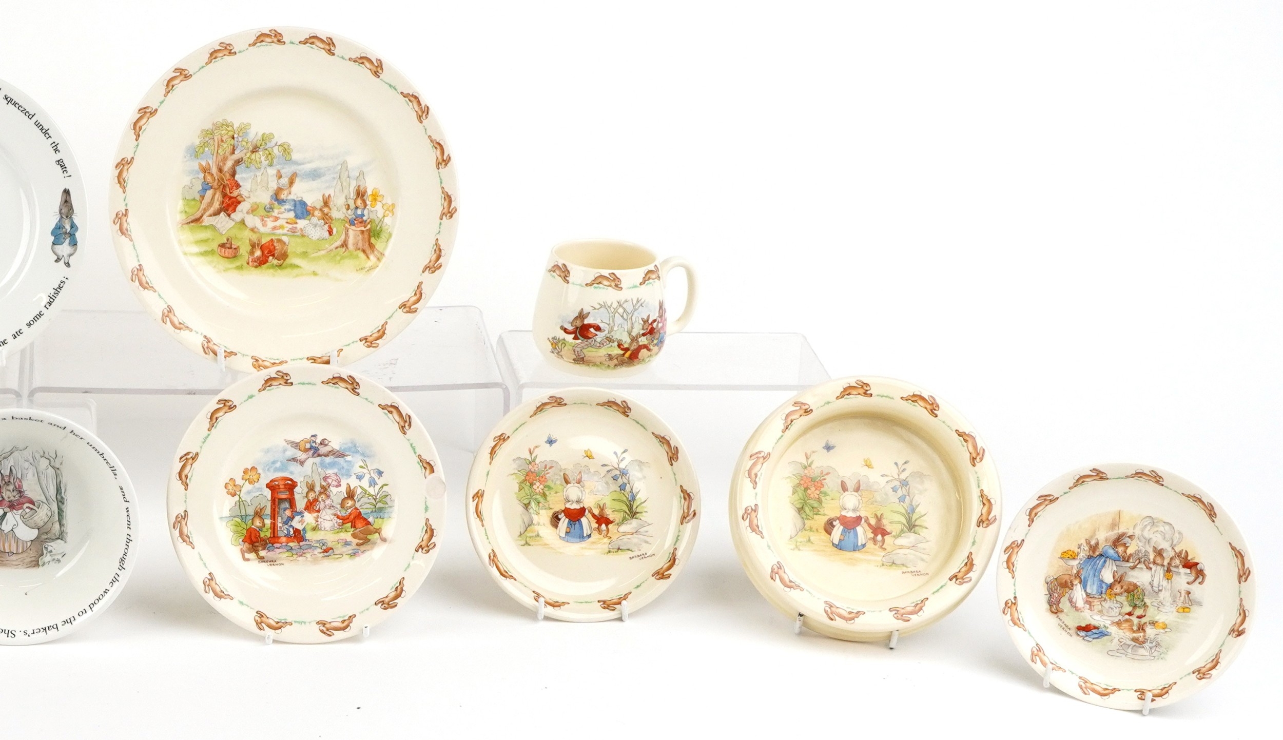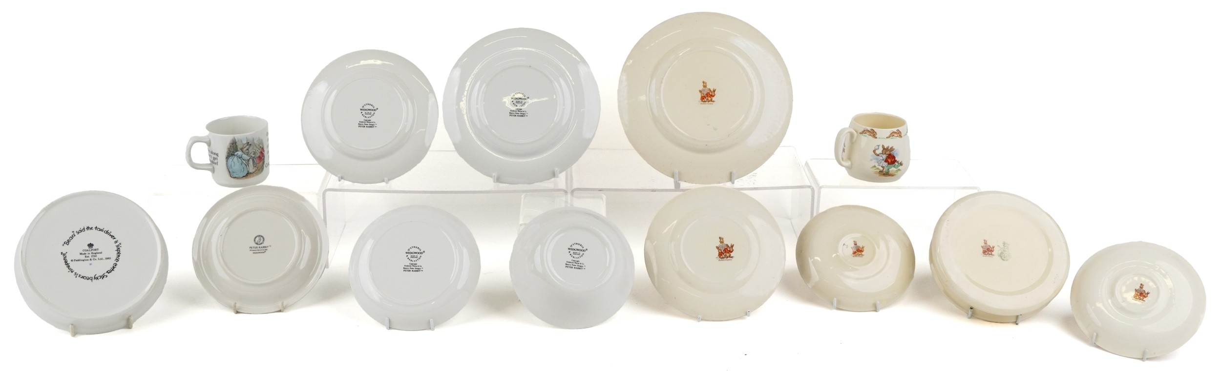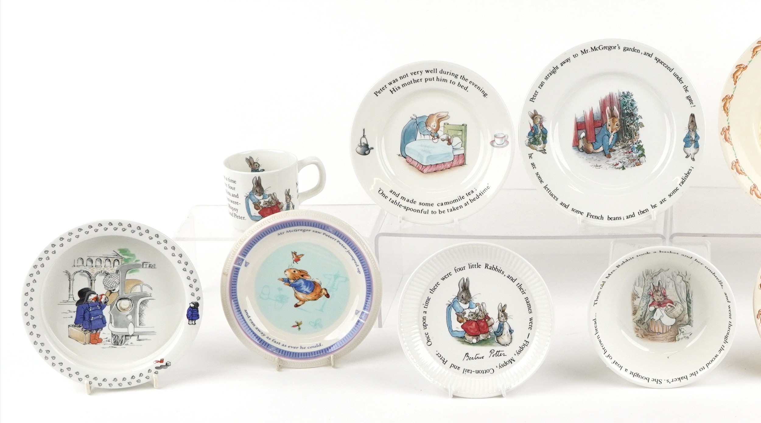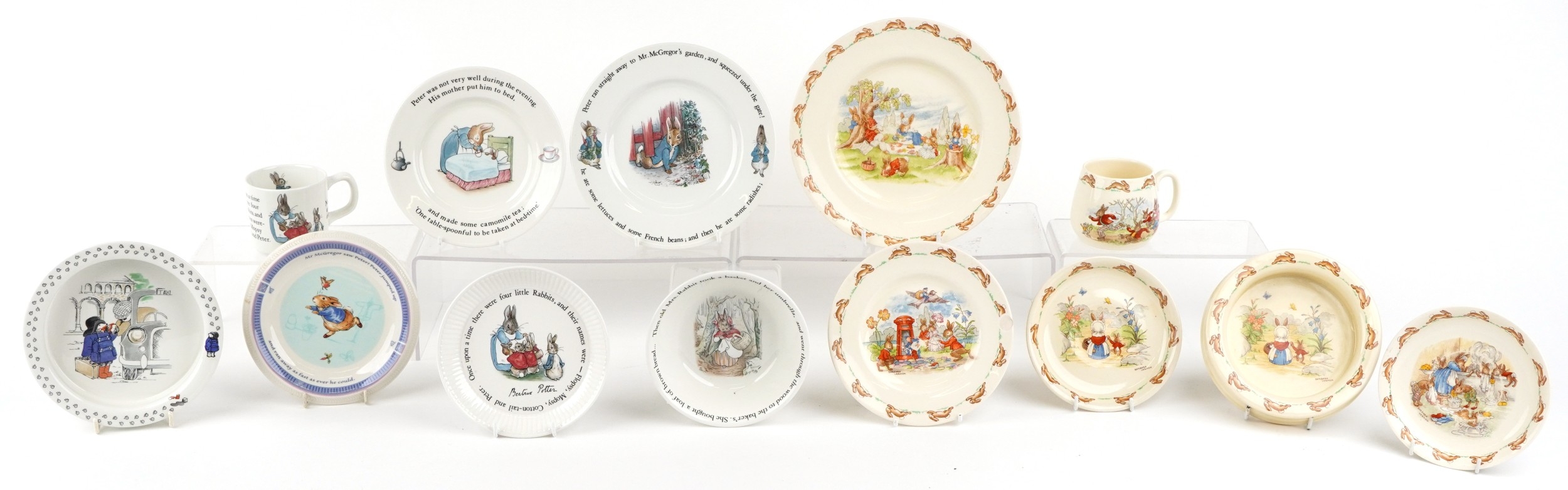 Vintage and later nursery teaware including Royal Doulton Bunnykins, Coalport Paddington Bear and Wedgwood Peter Rabbit, the largest 20cm in diameter.