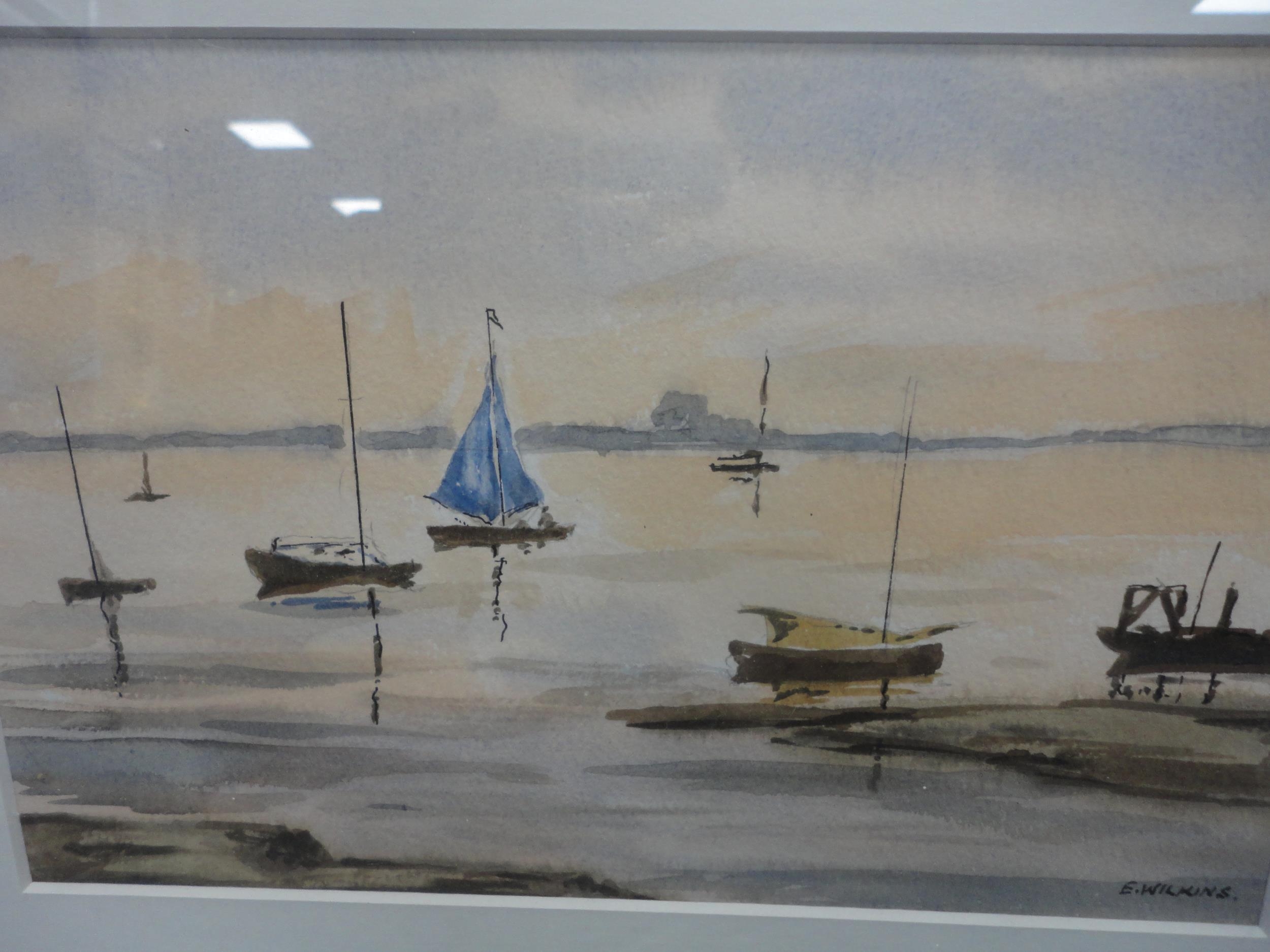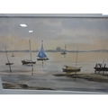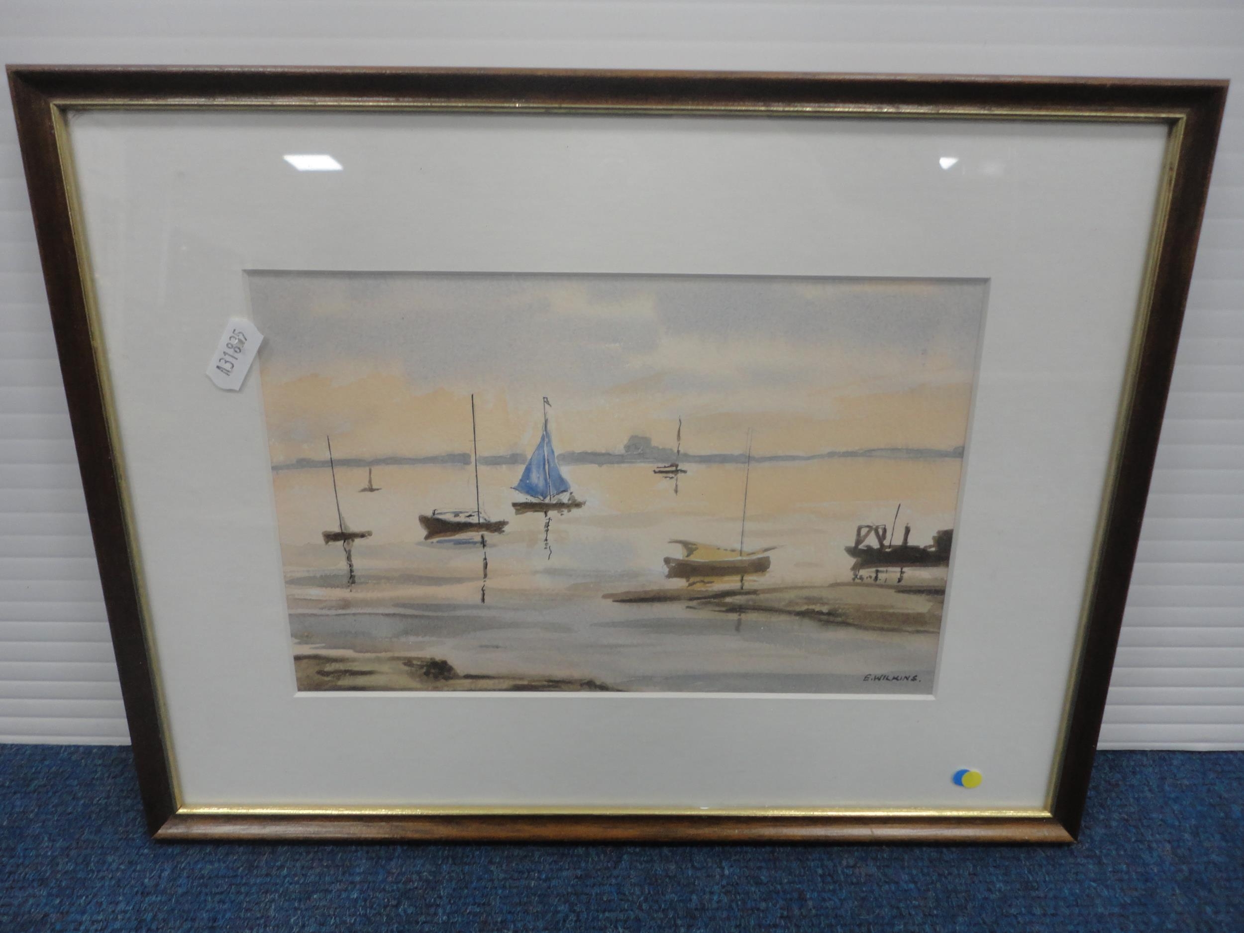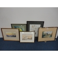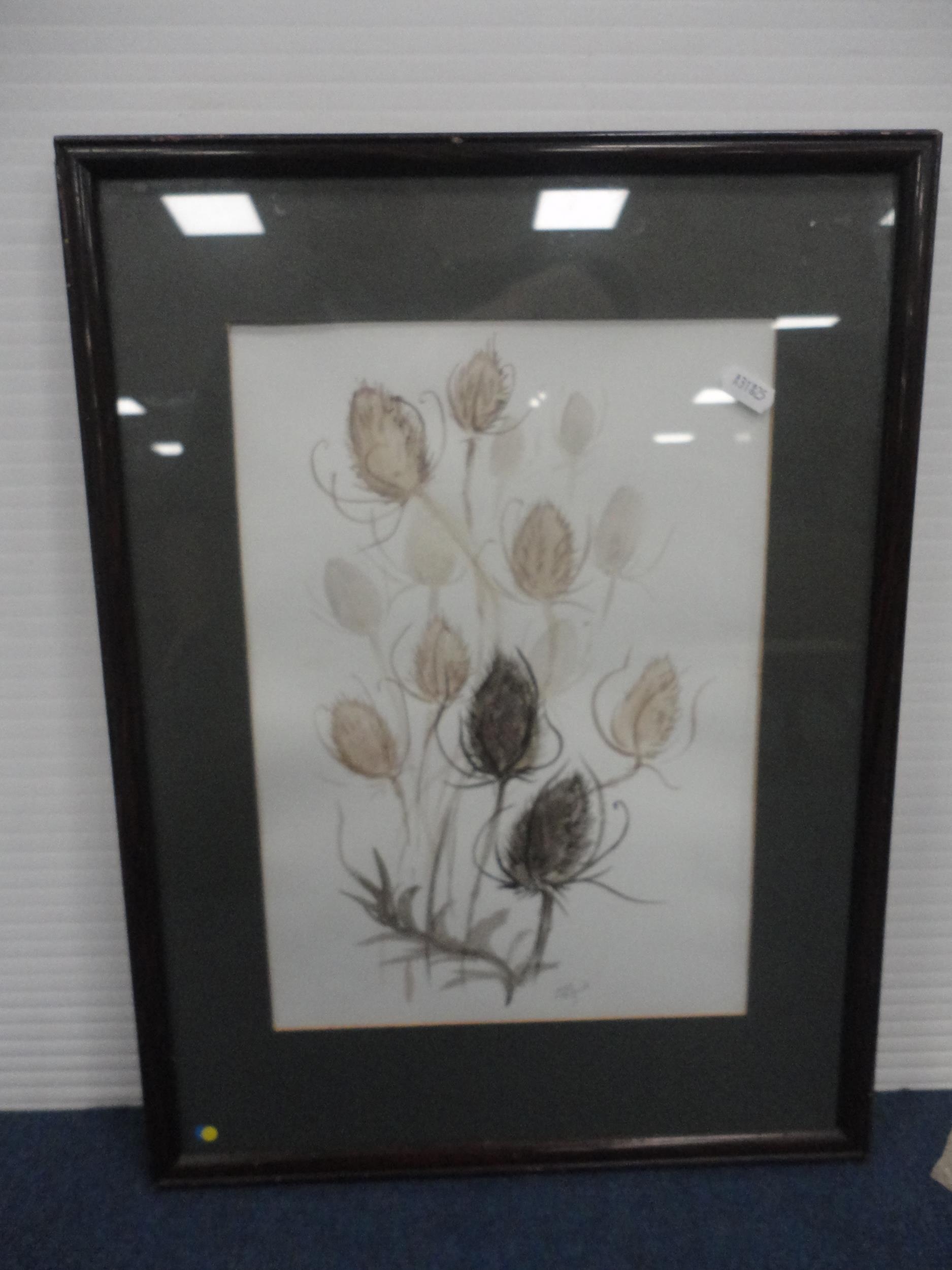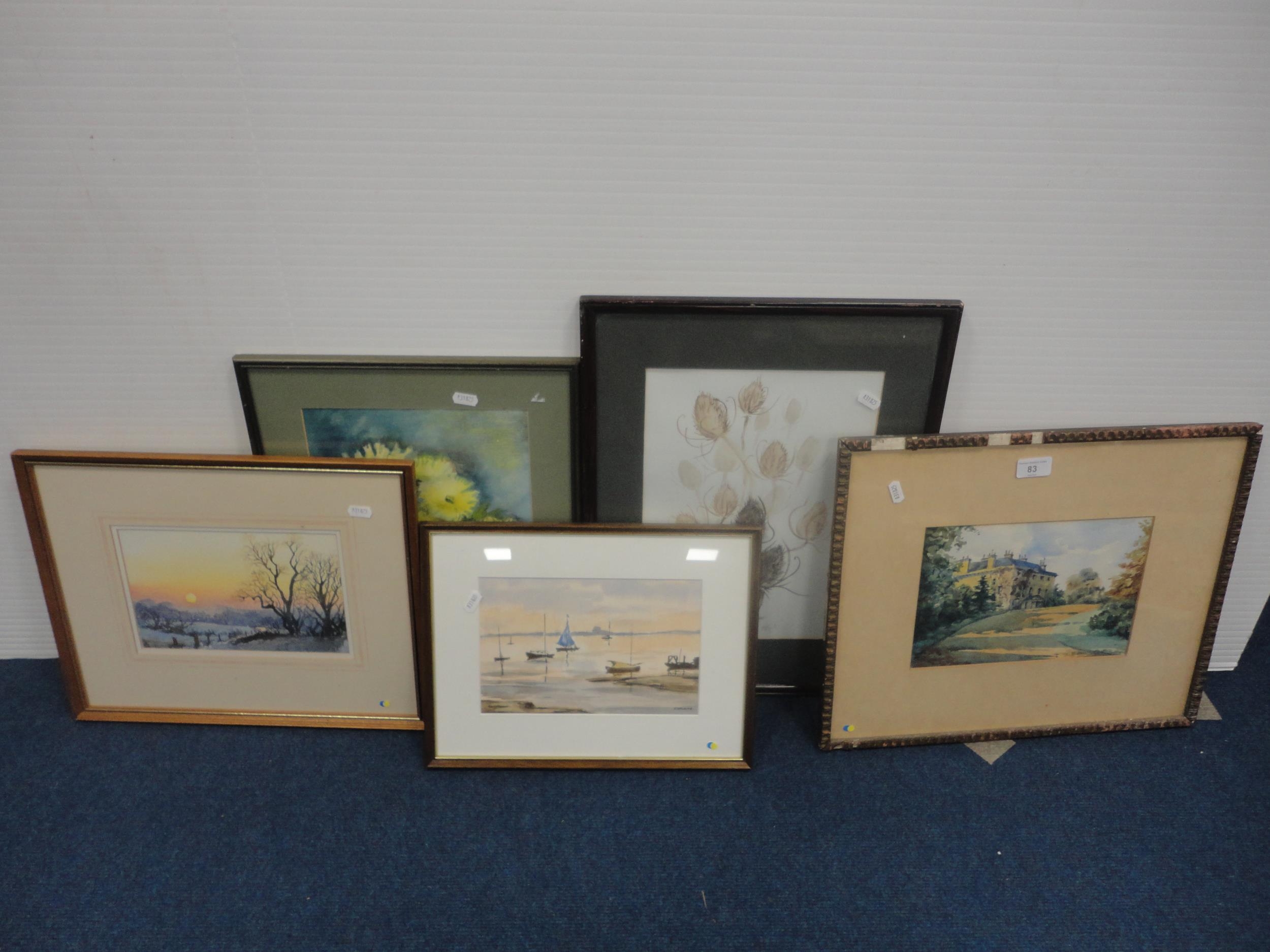 Watercolour, also a watercolour by Myra Talford depicting teasels, E Wilkins fishing boats, Mrs Cunningham still life, and a sunset landscape by Jan Reed.