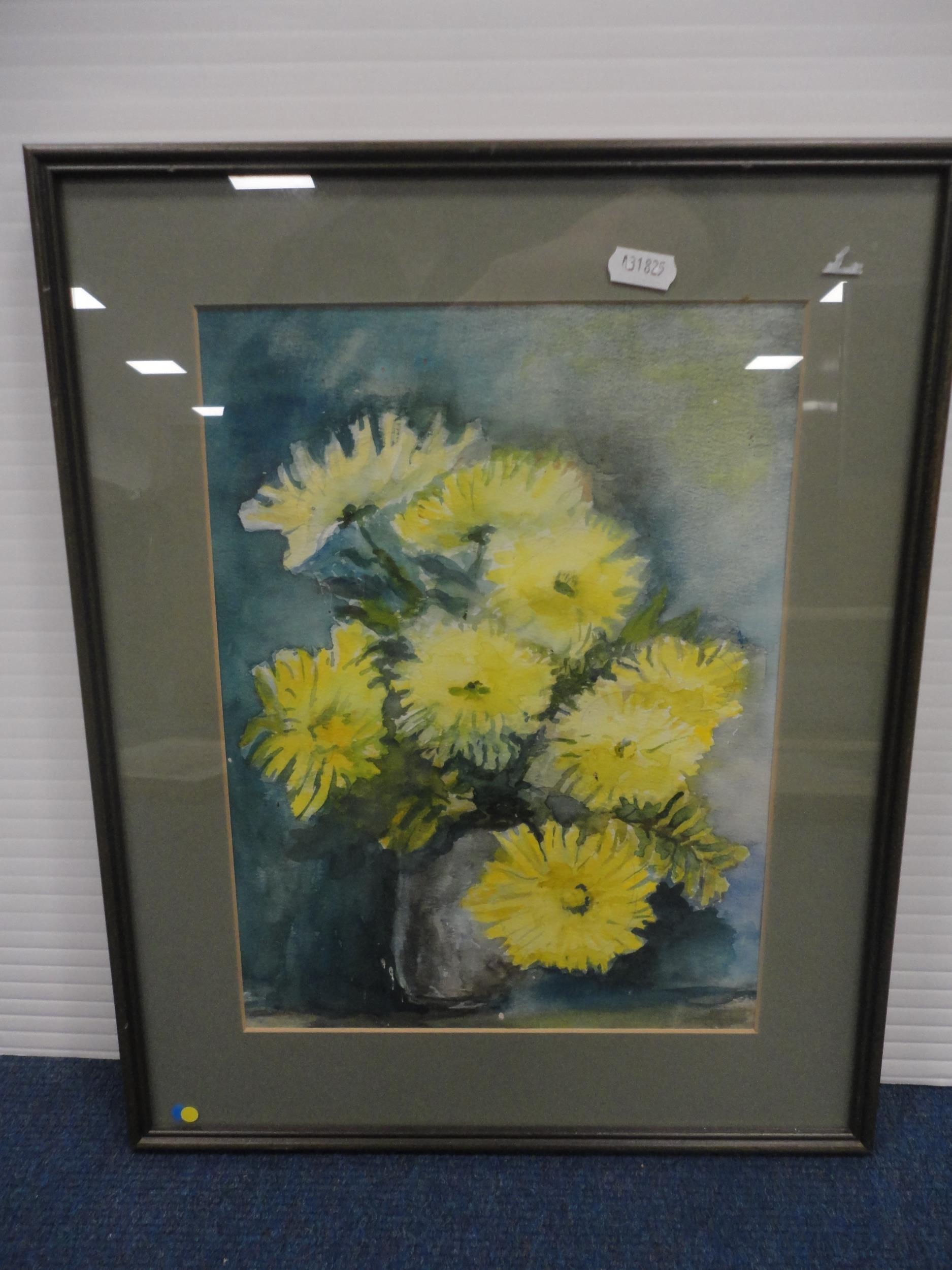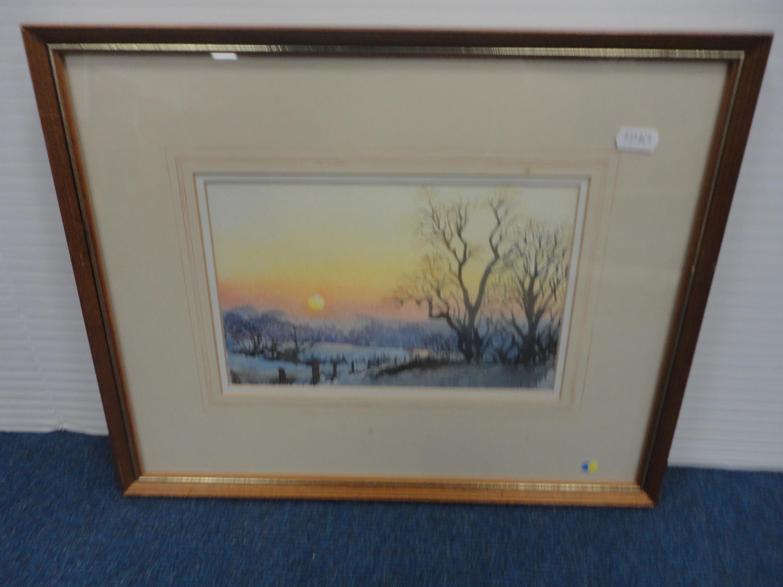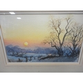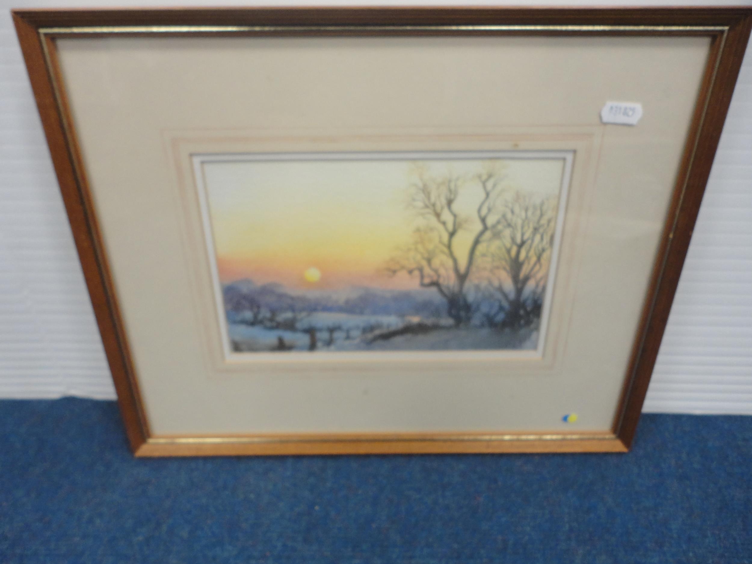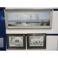 Watercolour, also a watercolour by Myra Talford depicting teasels, E Wilkins fishing boats, Mrs Cunningham still life, and a sunset landscape by Jan Reed.