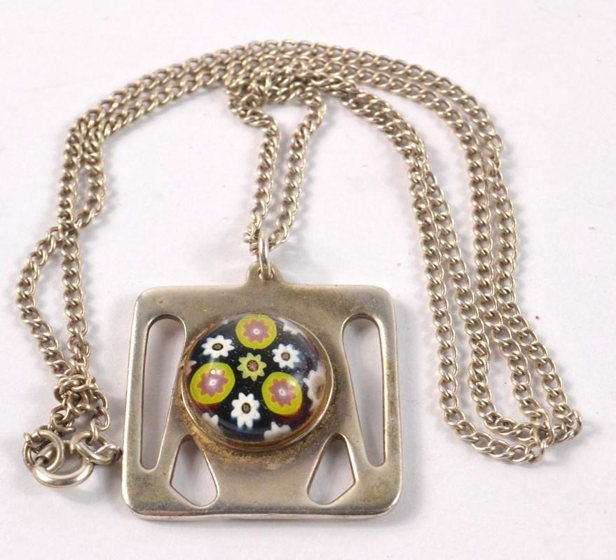 Trendy Scottish Edinburgh Selkirk glass style hallmarked silver square pendant with circular centre setting and chain (48cm)