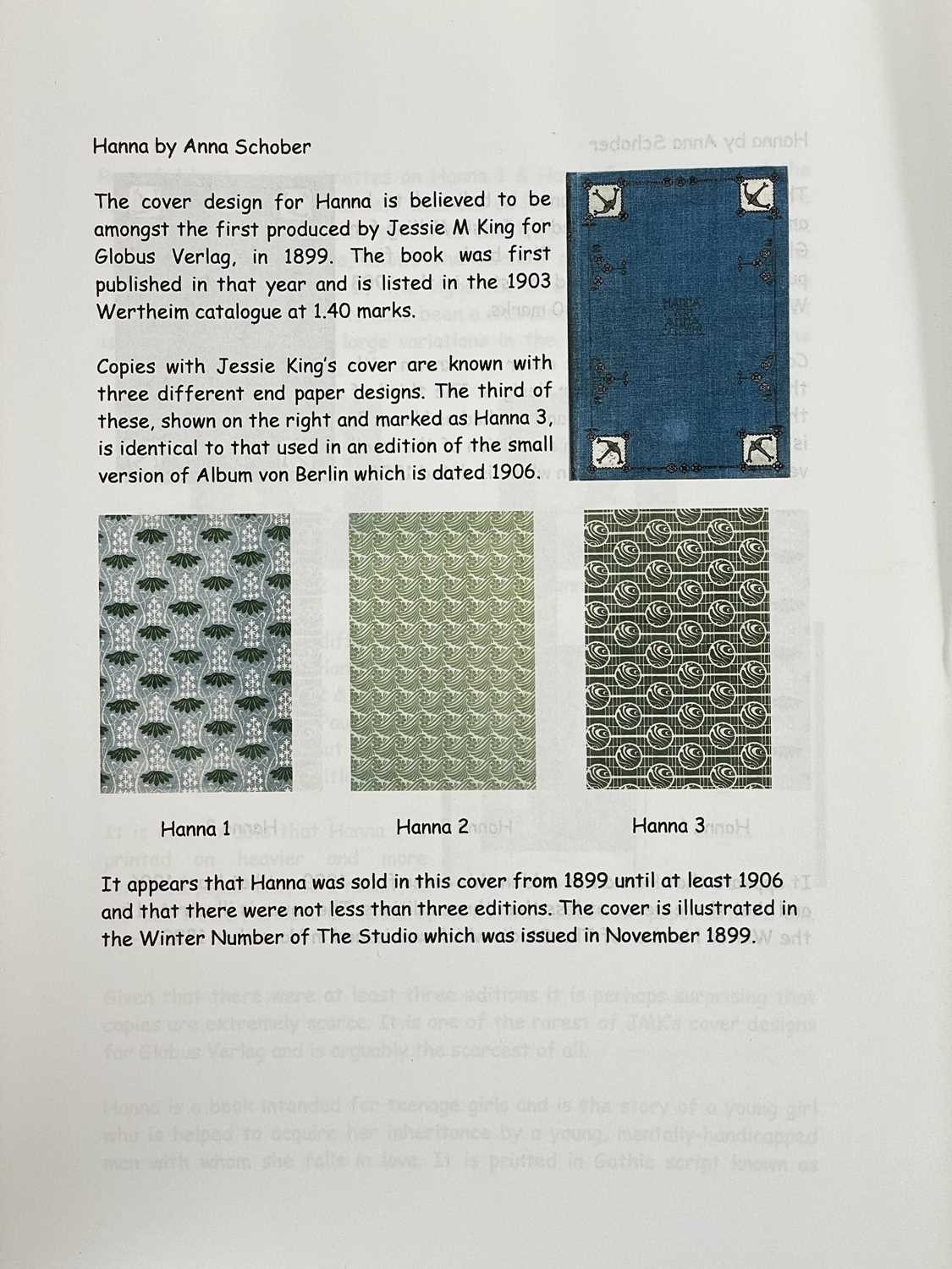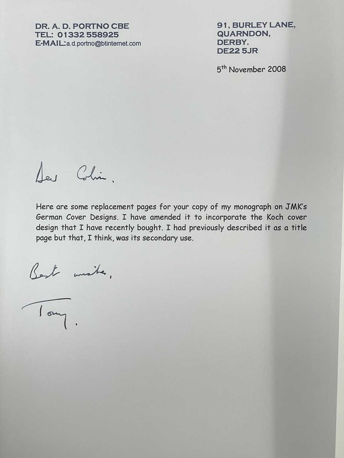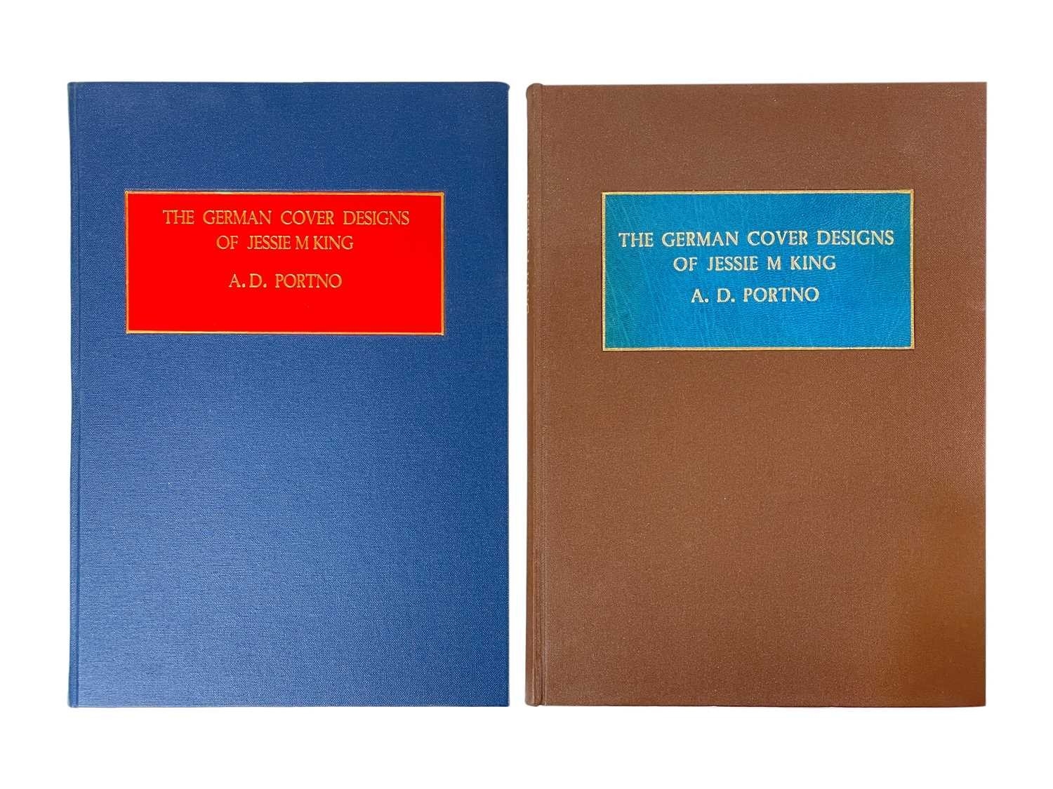 A. D. Portino The German Cover Designs of Jessie M. King Two copies, limited editions, both copy number 2 from a maximum of twenty, full cloth with marocco title labels to front boards, brown cloth work being signed by Portino and presented to Colin White, a.l.s letter and printed material loosley inserted, illustrated throughout, vg to fine, privately printed, 2003. (2) Provenance From the collection of Colin White (1927–2022) (see lot 1 for more information)
