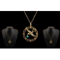 Victorian Period Attractive and Petite 9ct Gold Circular Pendant with flying swallow figure to centre, set with turquoise and seed pearls; attached to later 9ct gold chain, marked for 9.375; pendant size 1.25 inches (3.1cms), excellent condition