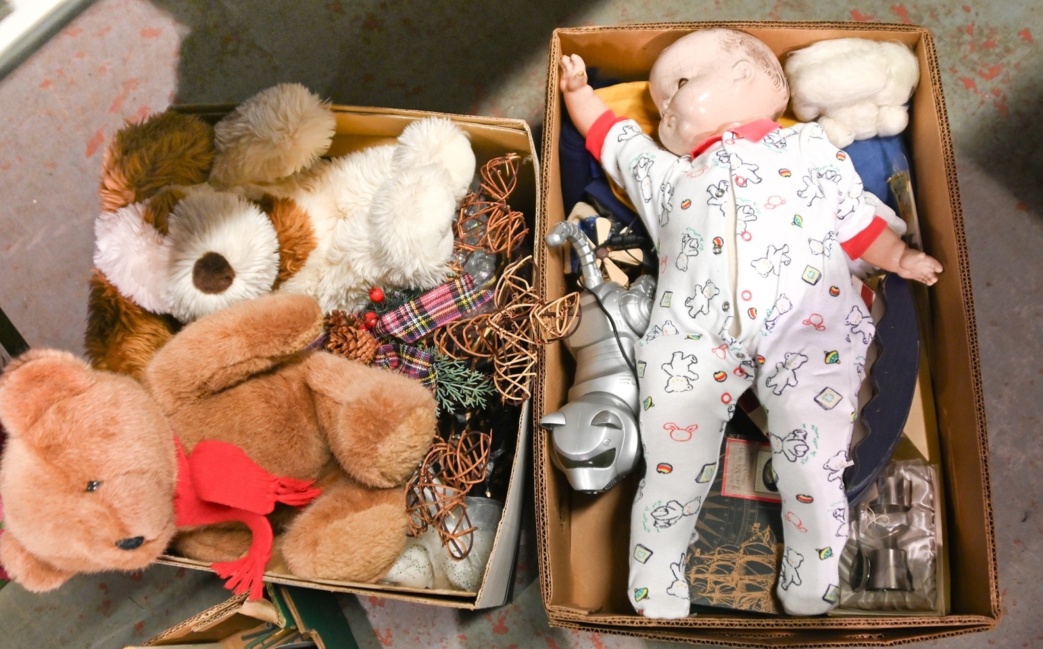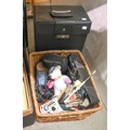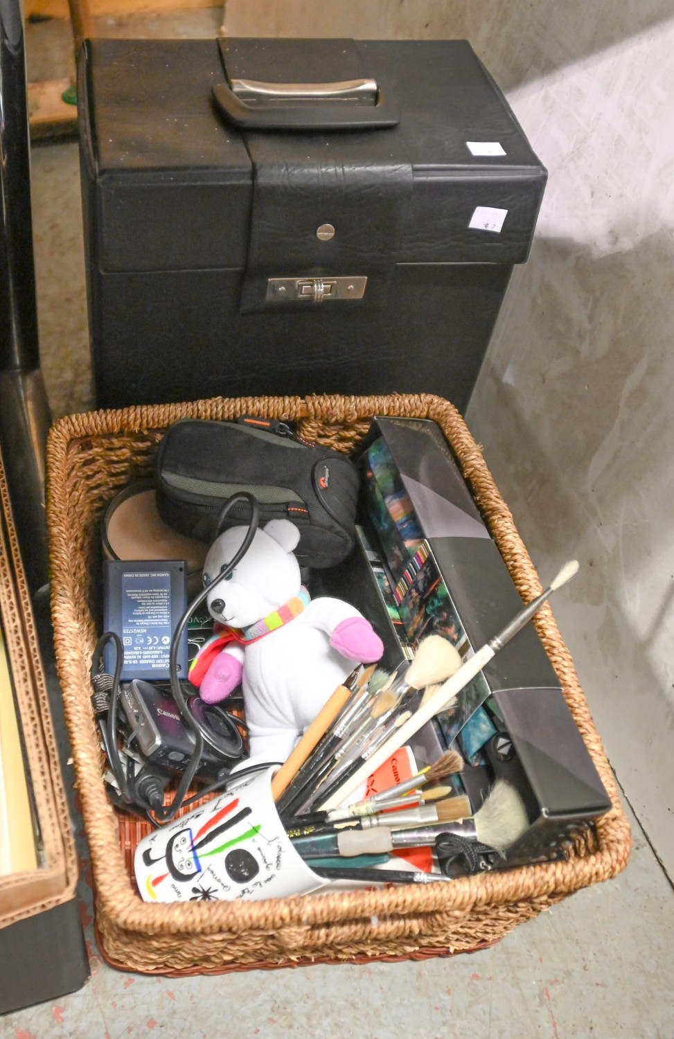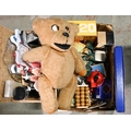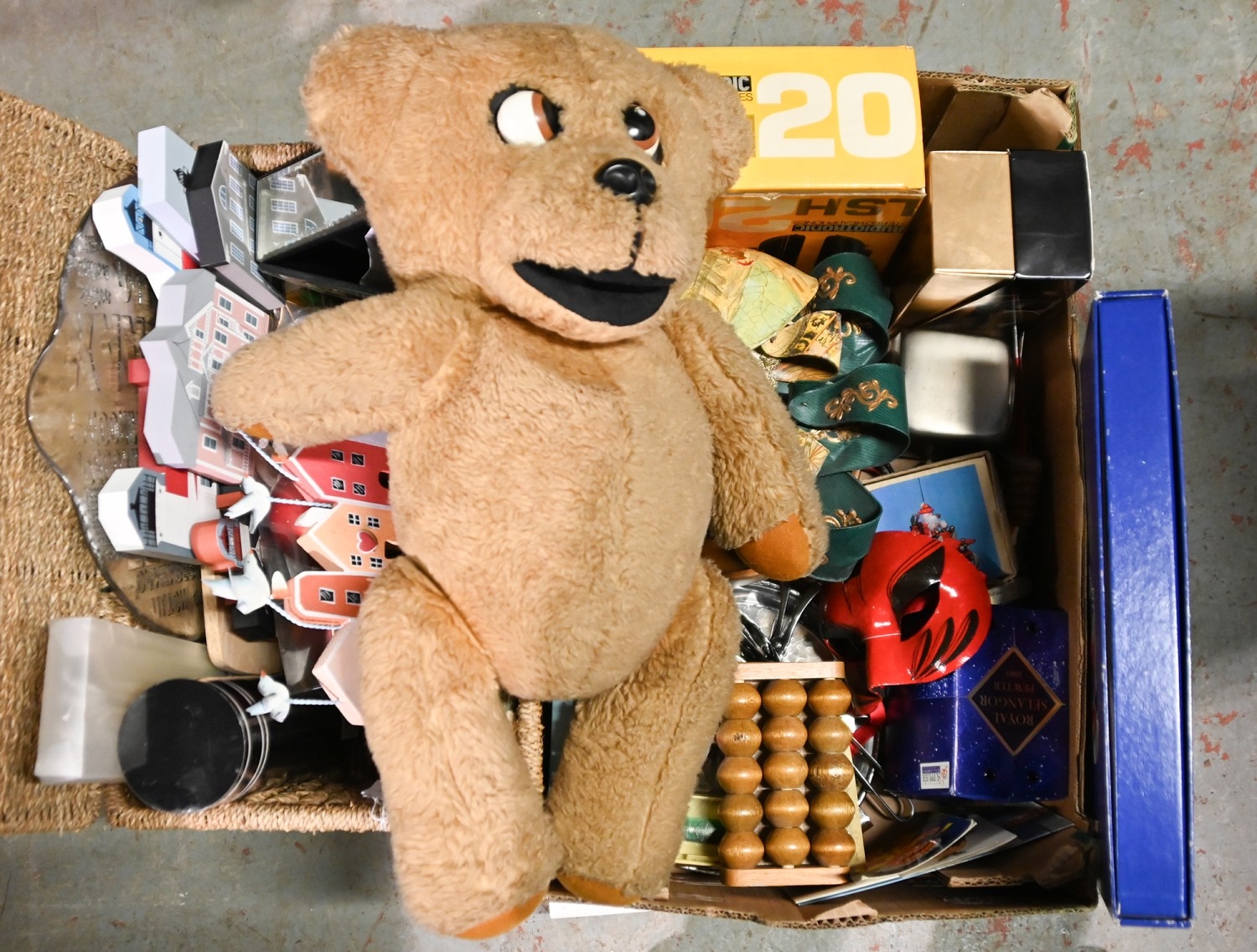 Miscellaneous items, including Venetian masks, soft toys, headphones, Canon camera, a Kodak CAROUSEL S-AV 1030 slide projector, etc