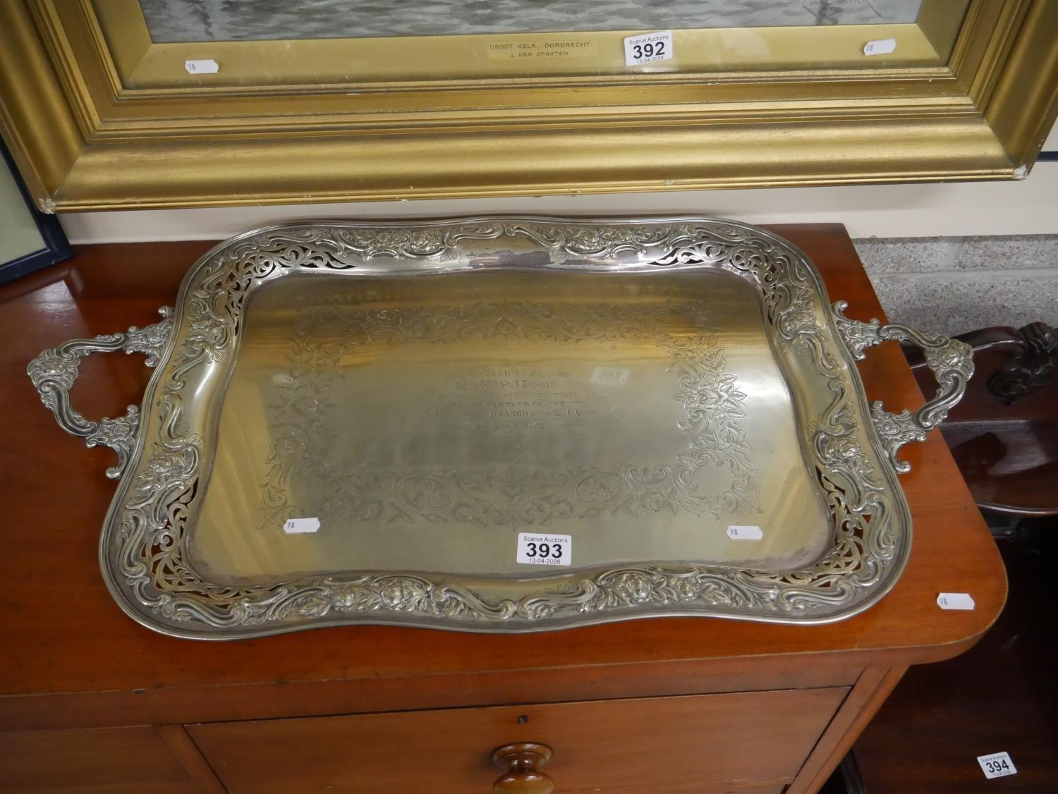 LARGE ENGRAVED SILVER PLATED TRAY