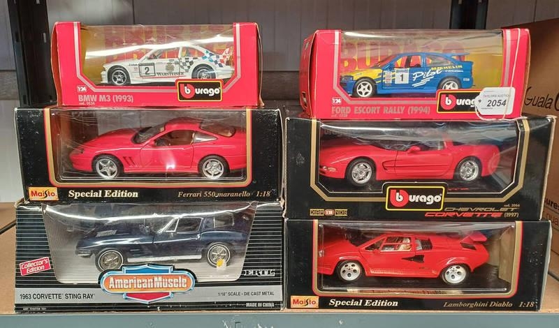 SIX 1:18/24 SCALE MODEL VEHICLES FRM MAISTO, BURAGO & AMERICAN MUSCLE INCLUDING LAMBORGHINI DIABLO, CHEVOLET CORVETTE (1977) FERRARI 550 MARANELLO, CORVETTE STING RAY (1963), BMW M3 (1993) AND FORD ESCORT RALLY (1994). ALL BOXED