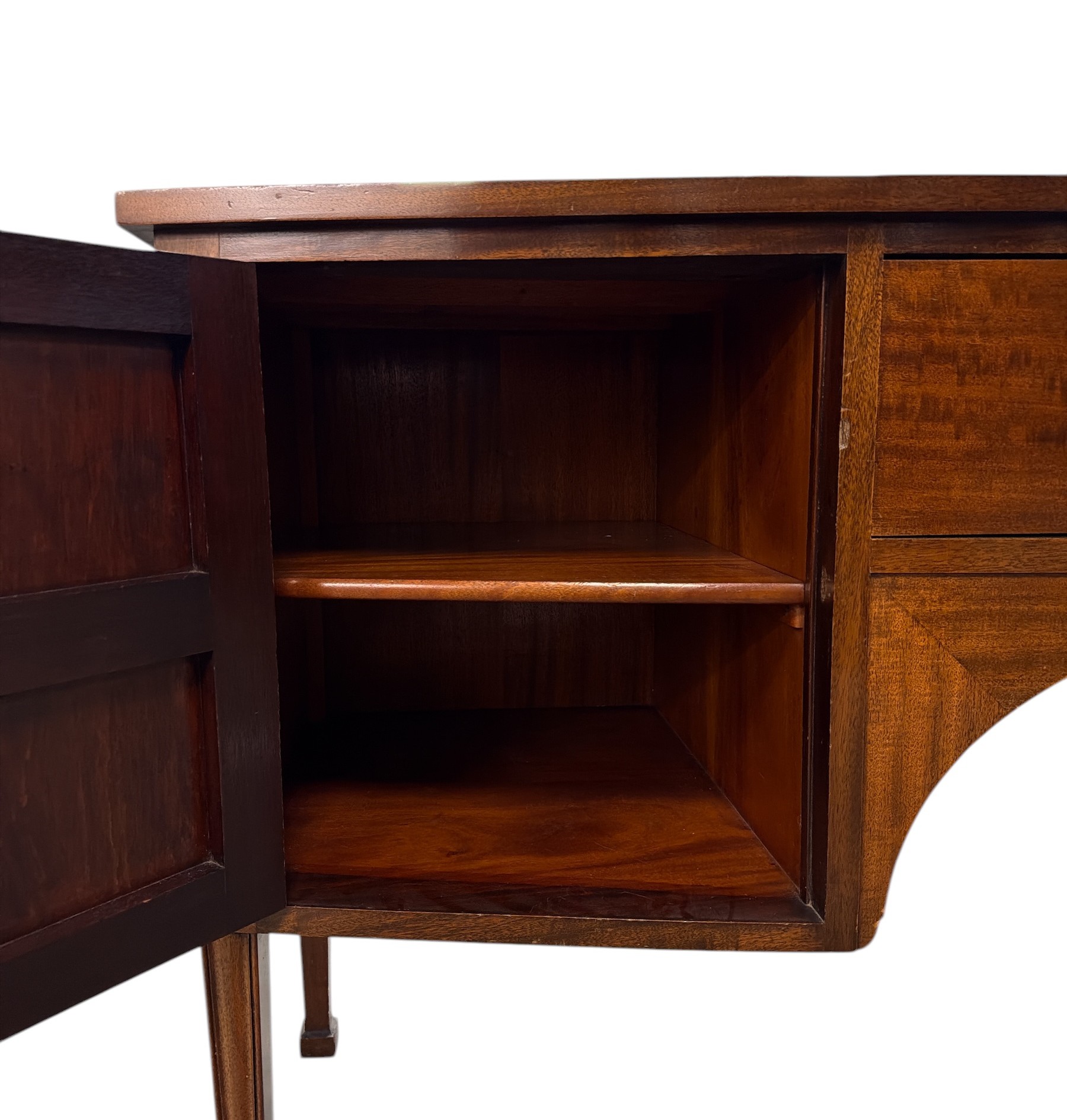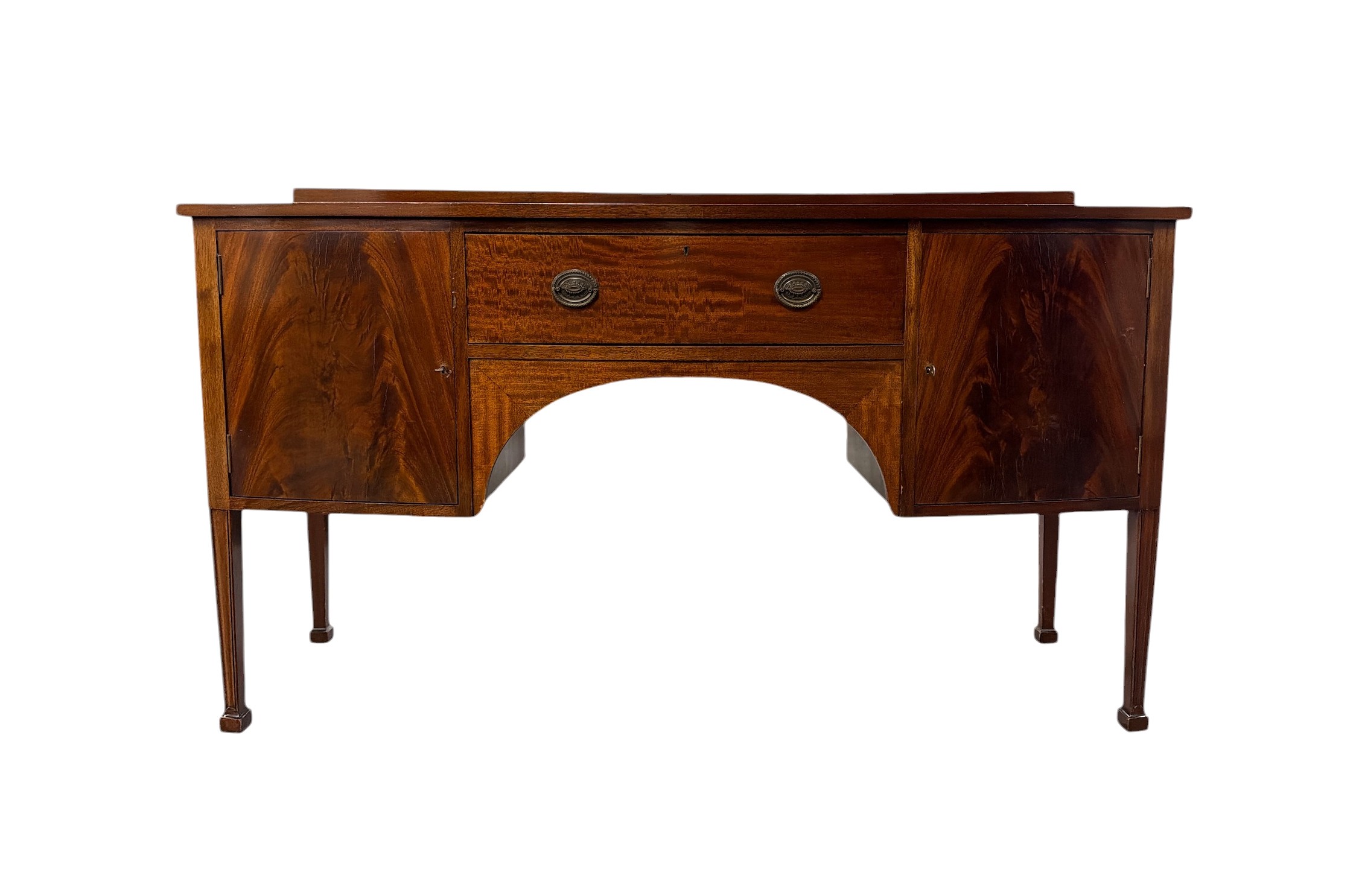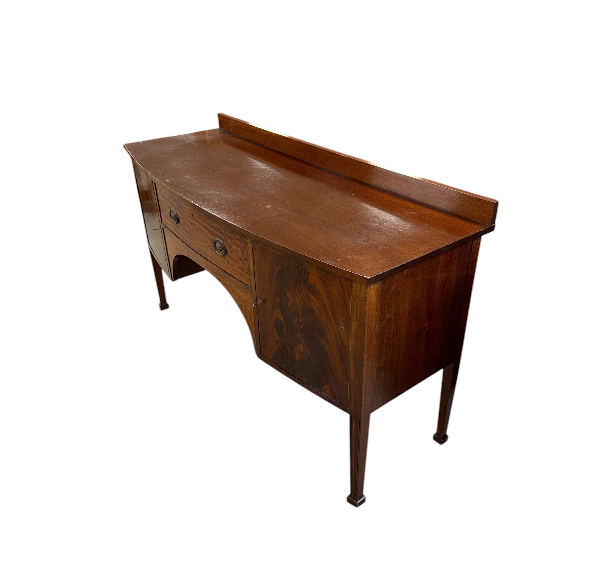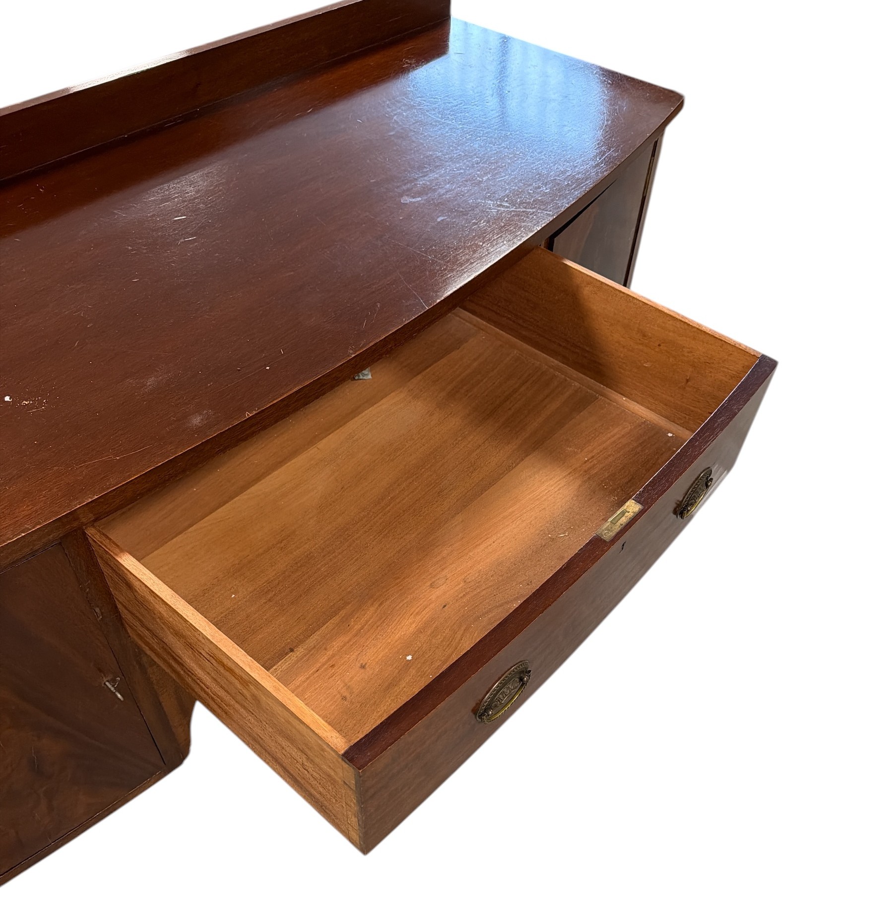 A George III style mahogany bowfronted sideboard with central frieze drawer flanked by cupboards, 167cms wide.