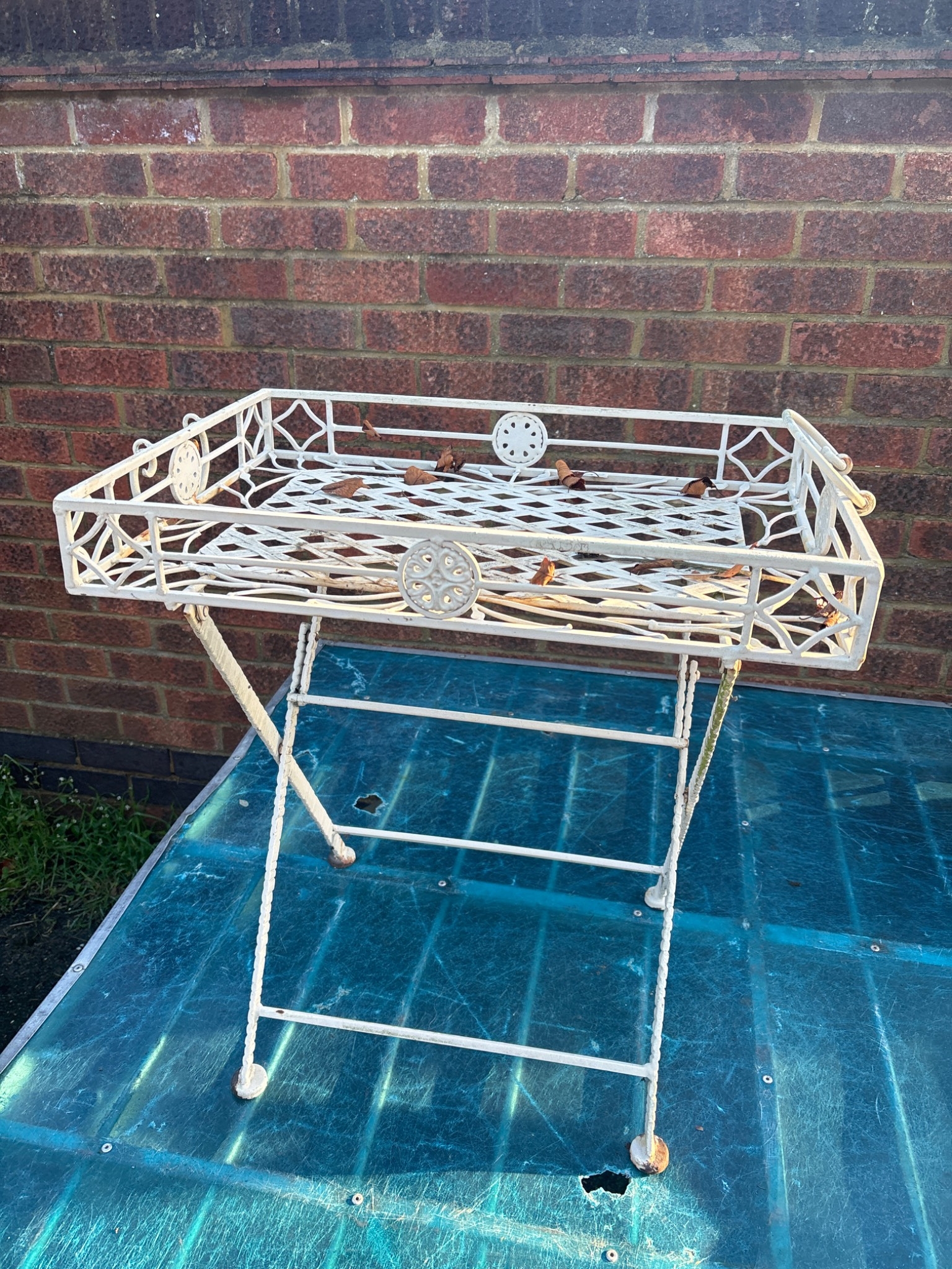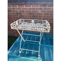 White-painted metal folding tray stand with floral accents not postable.