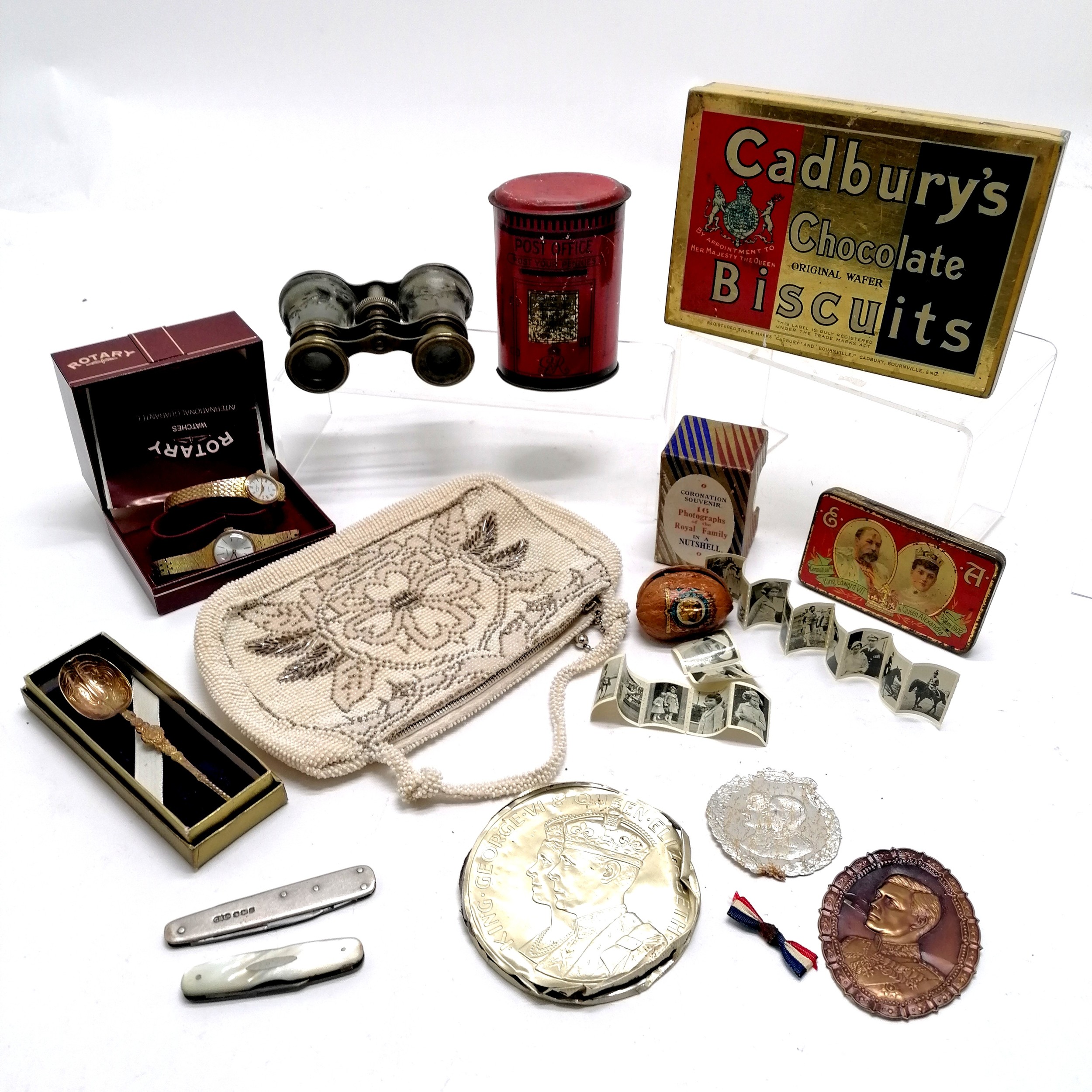 Qty of oddments inc unusual 1937 coronation fondant (?) coin (9cm diameter), Tissot manual wind wristwatch, Royal family in a nutshell etc