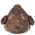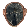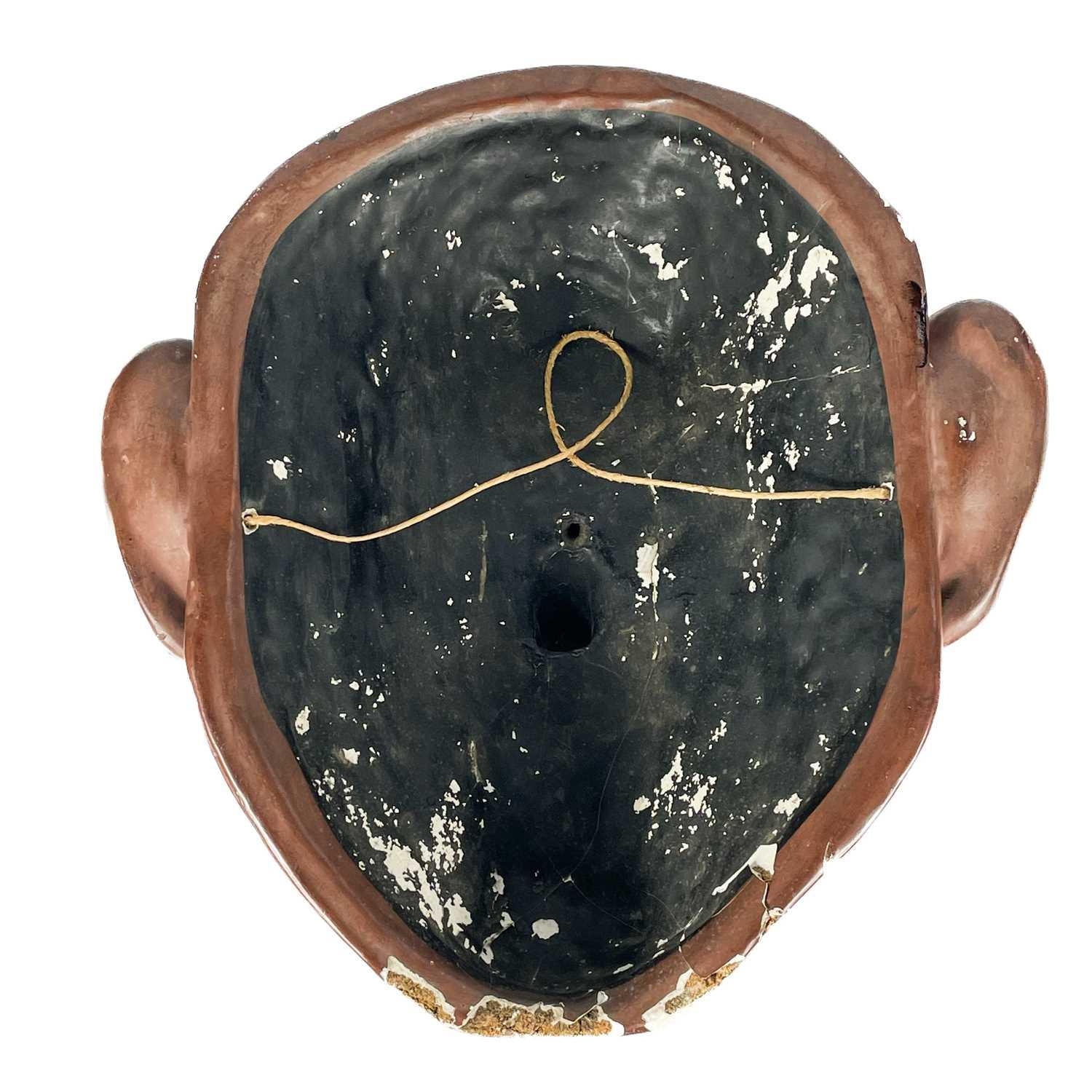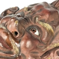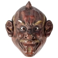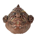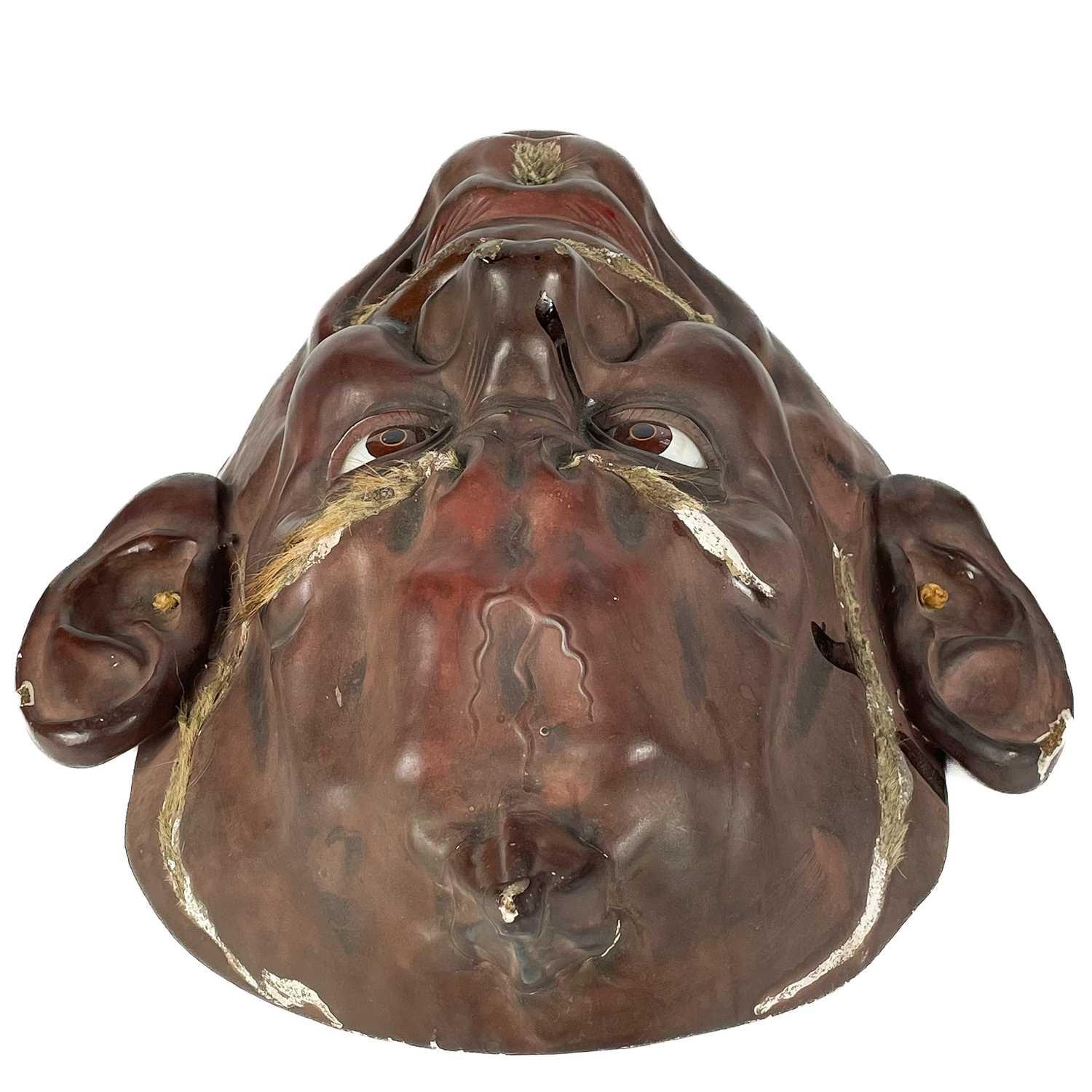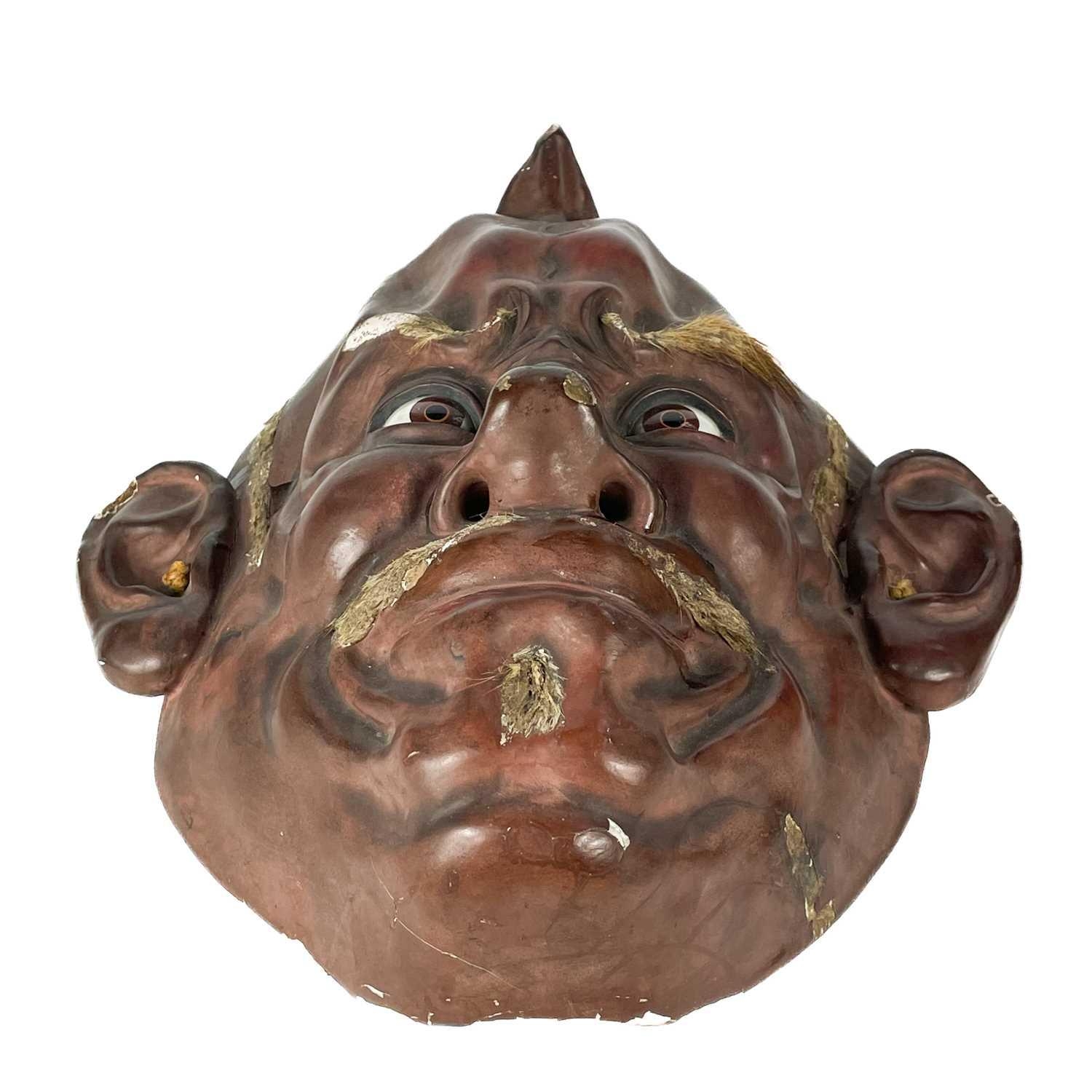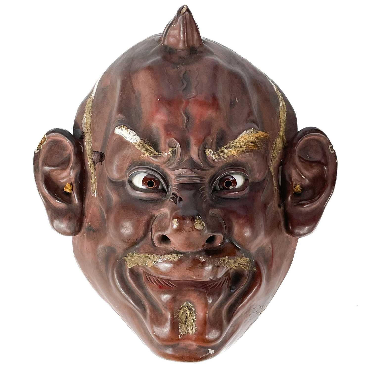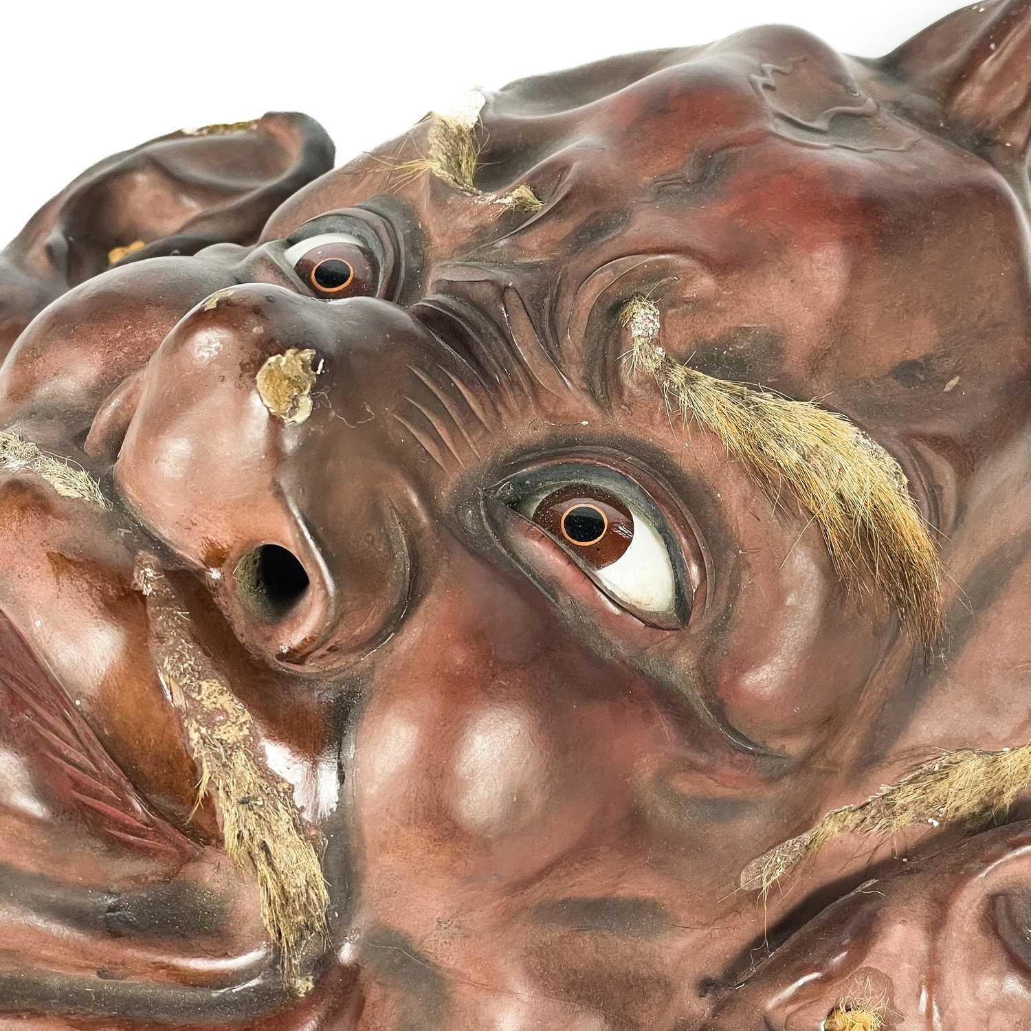 A Japanese Noh mask, Meiji period. Of lacquered wood, the man with single horn to forehead, bushy eyebrows, moustache and facial hair, with glass eyes, 30 x 28cm.