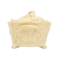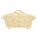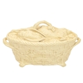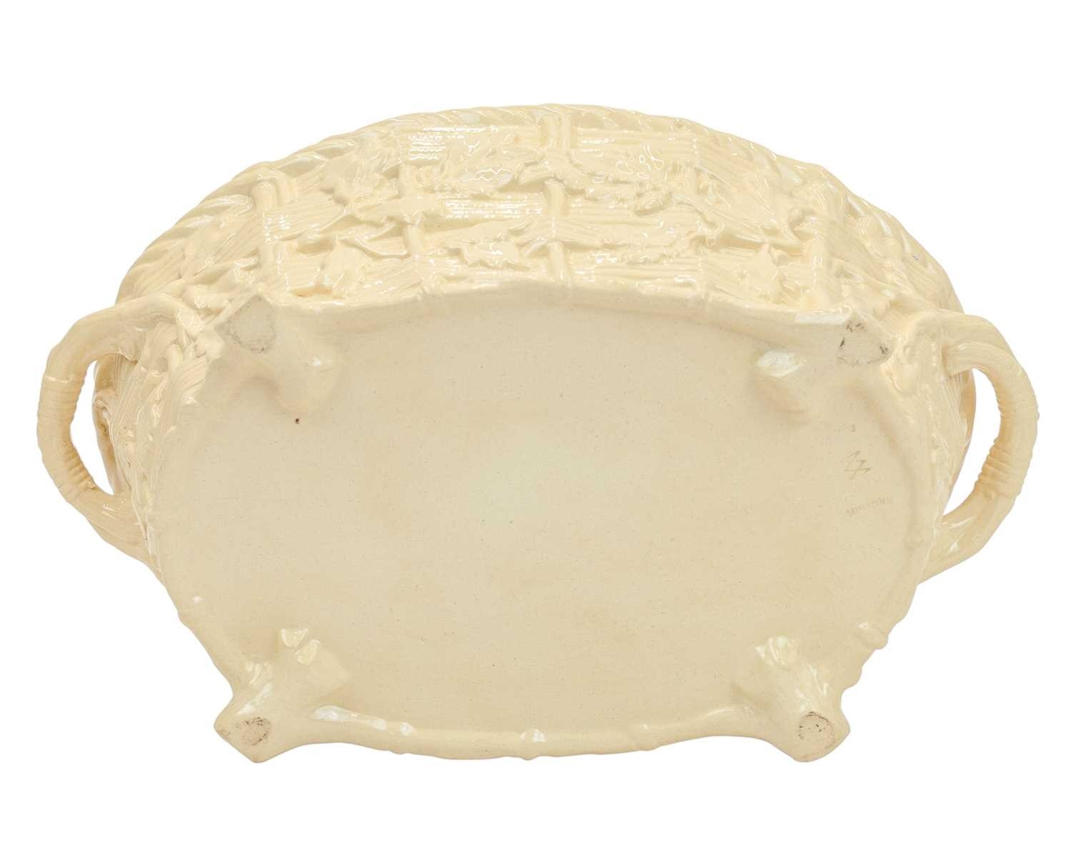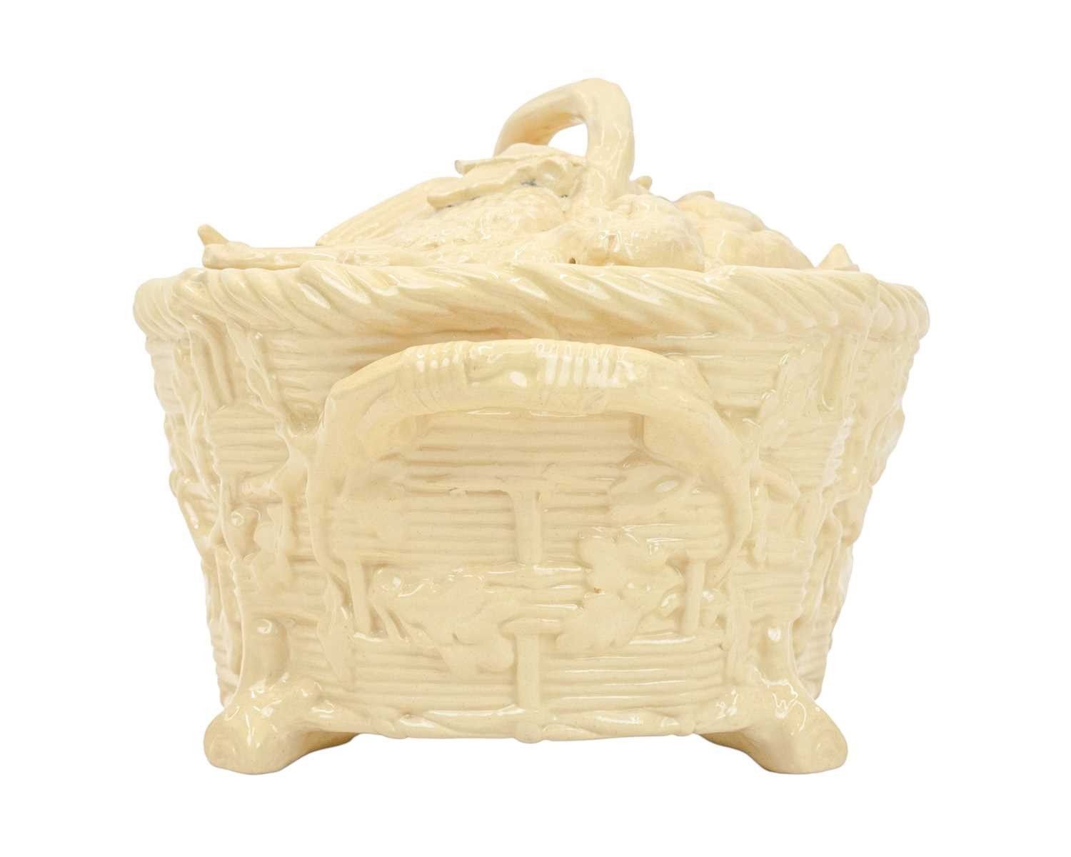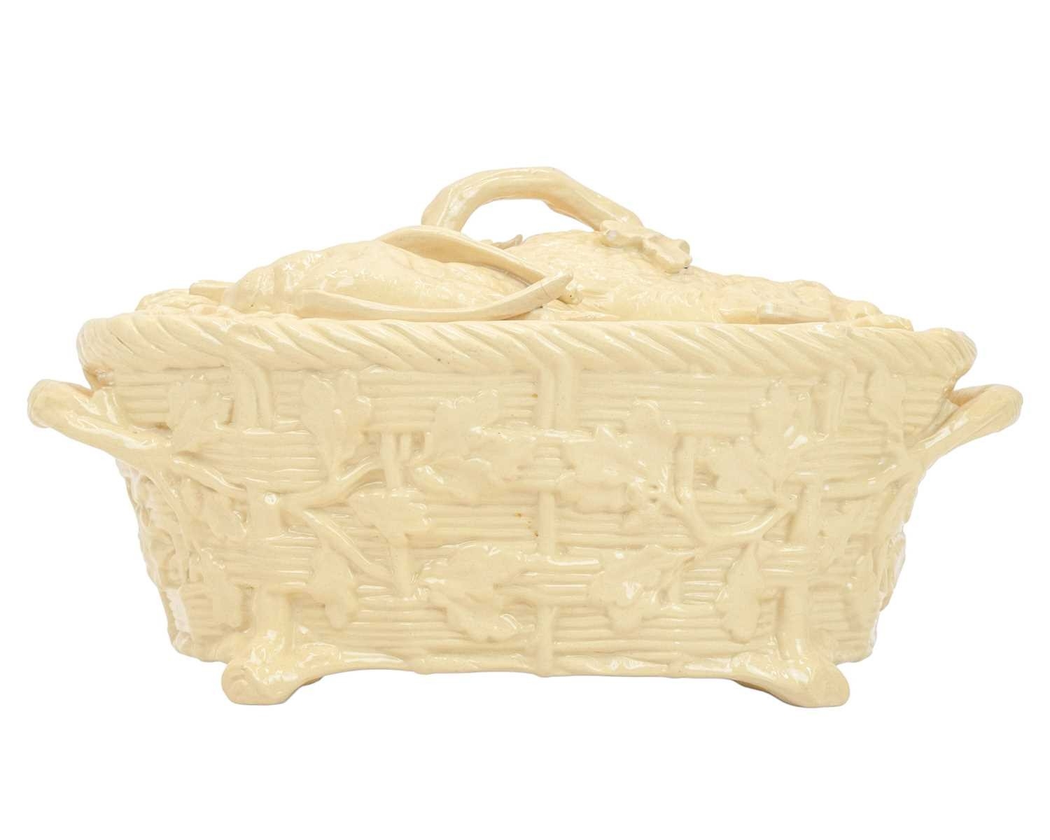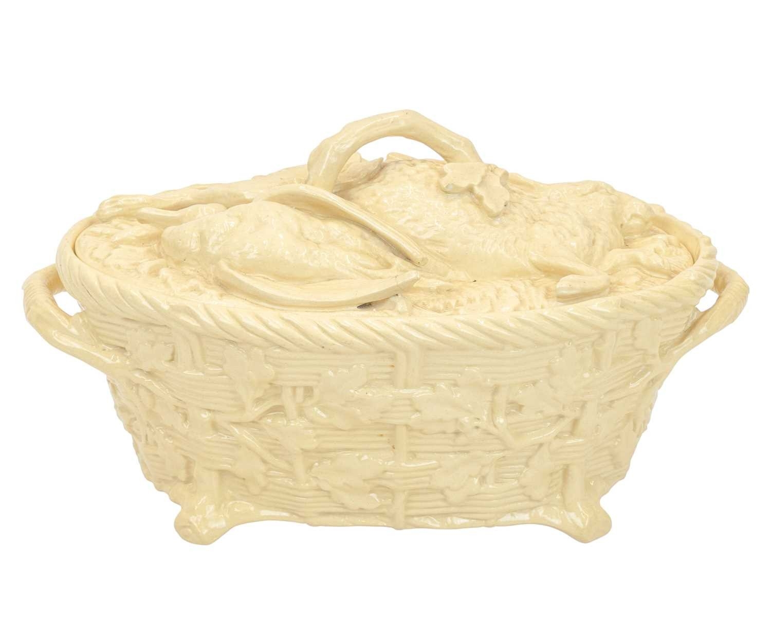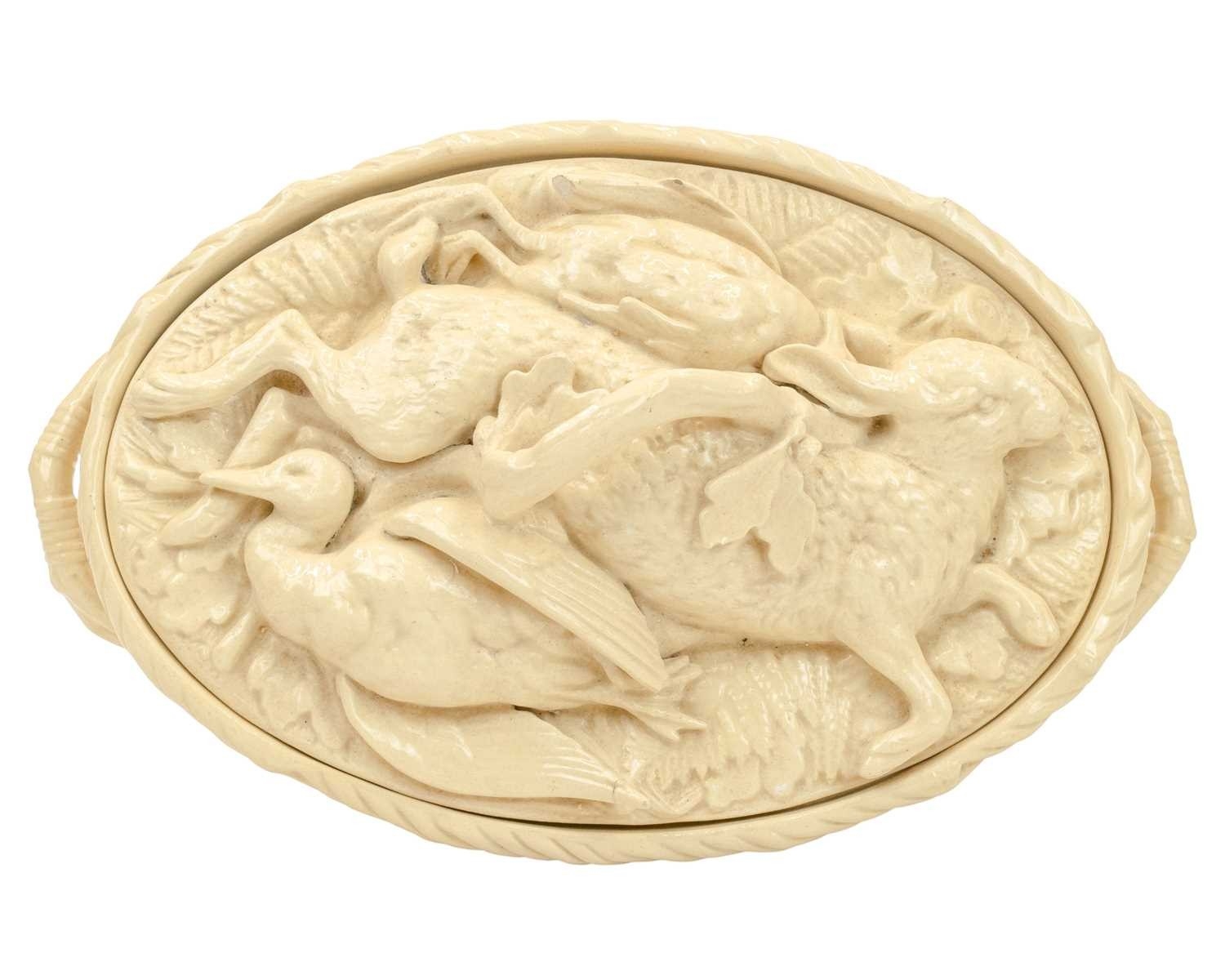 A Mintons game pie dish and cover. Circa 1885, with a cream coloured glaze, the base moulded in the form of a basket with side handles decorated with oak leaves and acorns, the lid depicting a hare, ducks and other birds, impressed Minton mark to the base, height 18cm, width 38cm, depth 23cm.