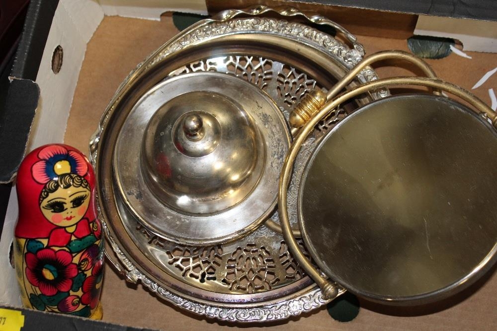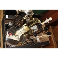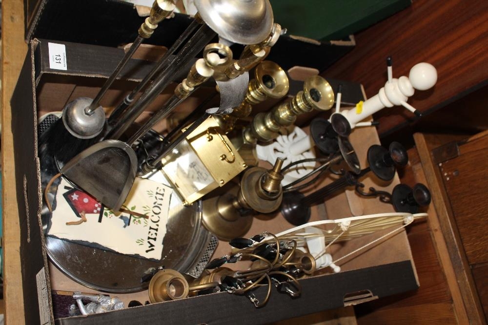 A TRAY OF COLLECTABLES AND METALWARE TO INCLUDE A COMPANION SET, CAST METAL MUSIC STAND, PAIR OF BRASS CANDLESTICKS ETC.
