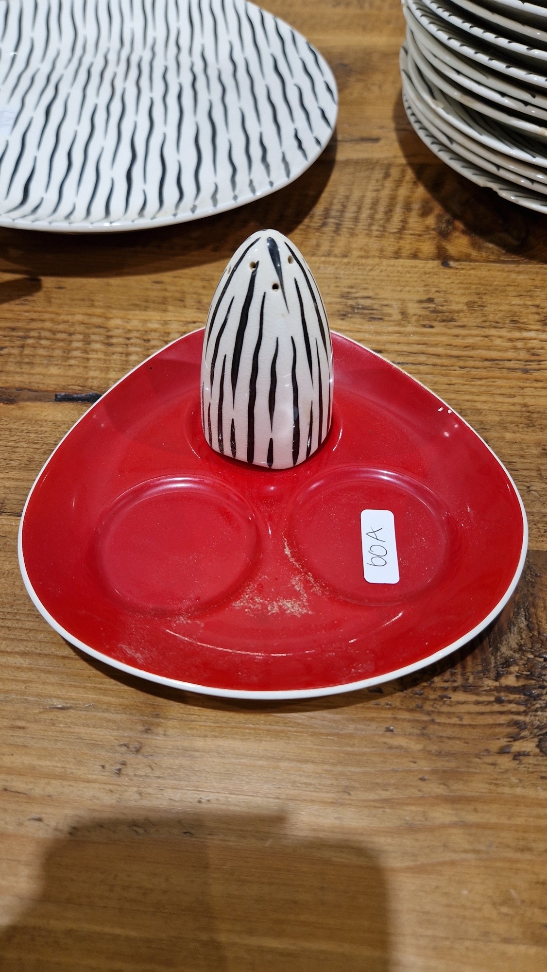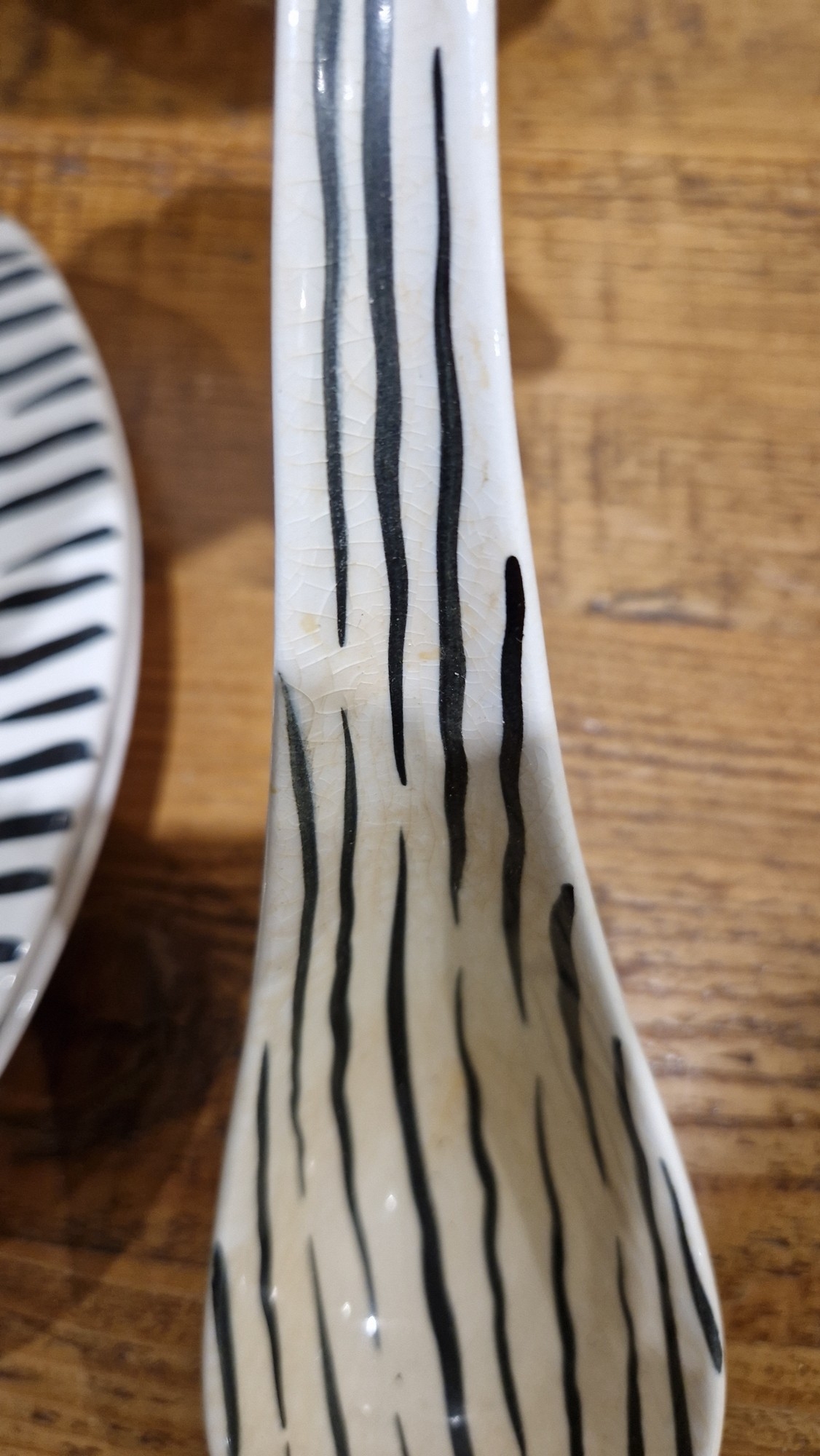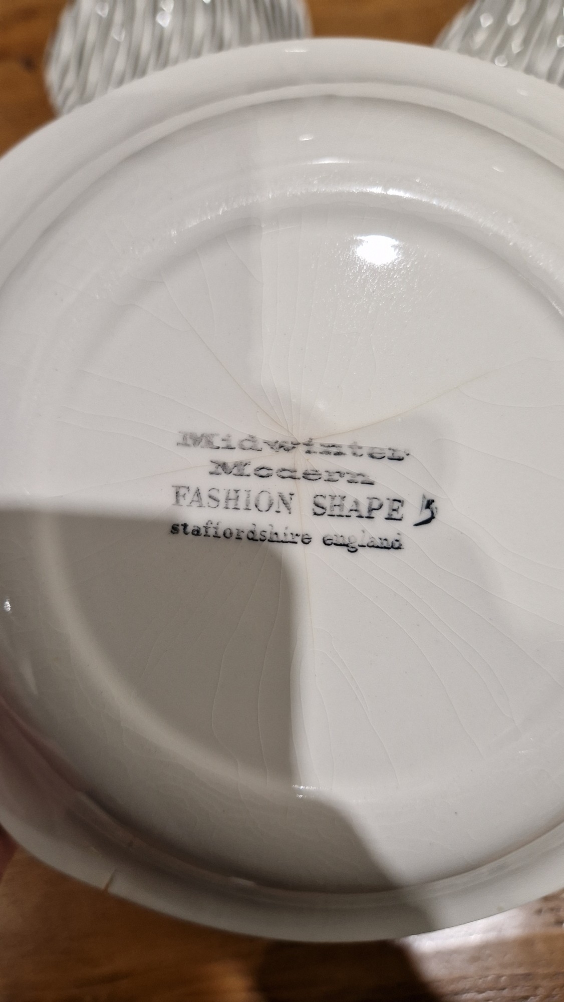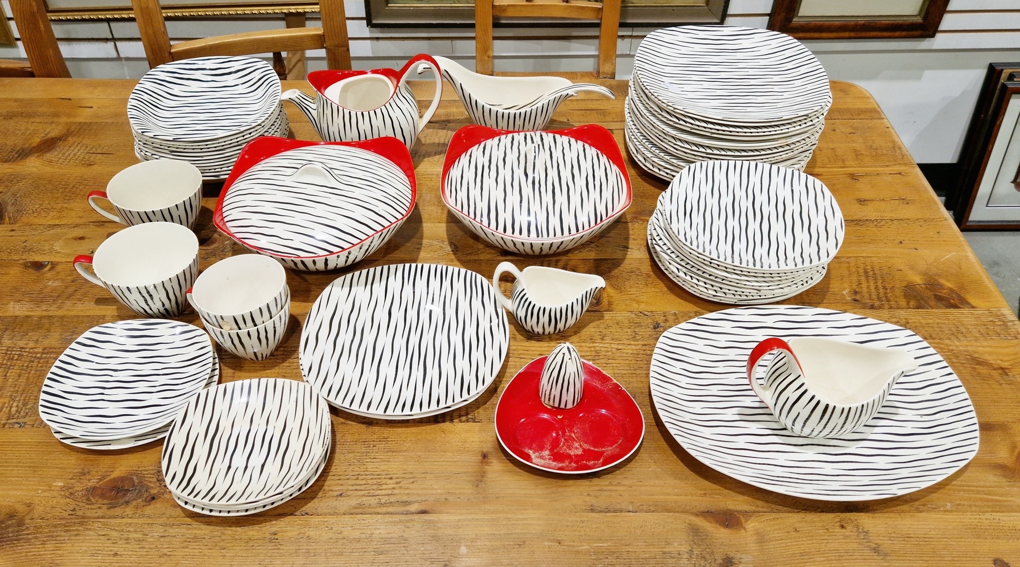 Extensive 1950s Midwinter Stylecraft 'Zambesi' pattern part dinner service, comprising two tureens and covers, seventeen dinner plates, fifteen side plates (varios sizes), gravy boat and ladle, part cruet set, creamer, milk jug, teapot (missing lid), four cups and saucers, twelve bowls, platter (58)