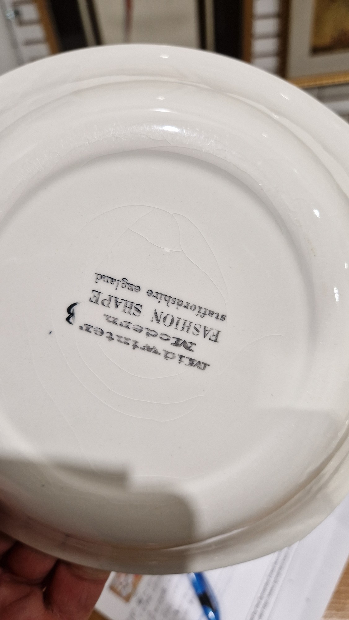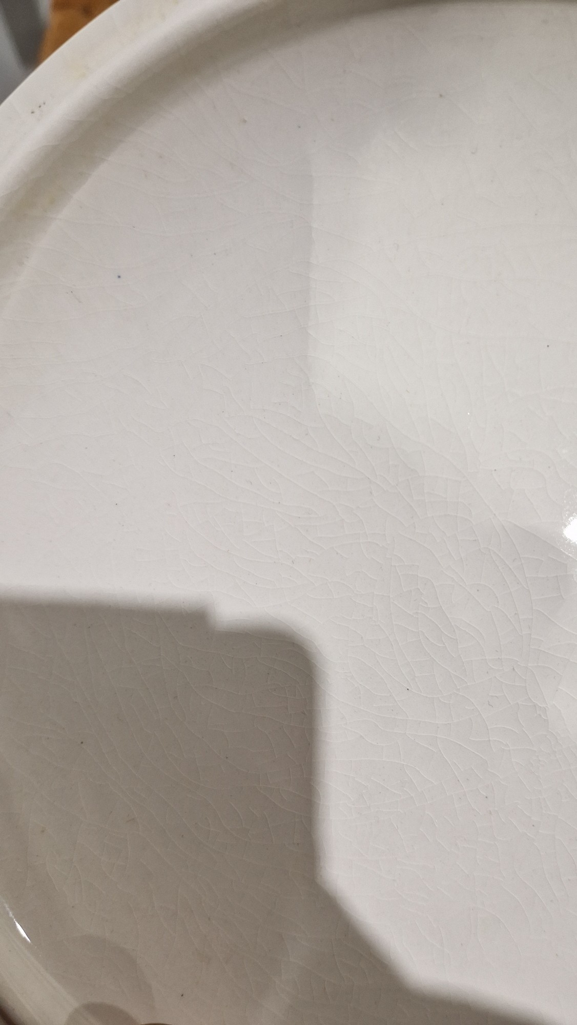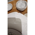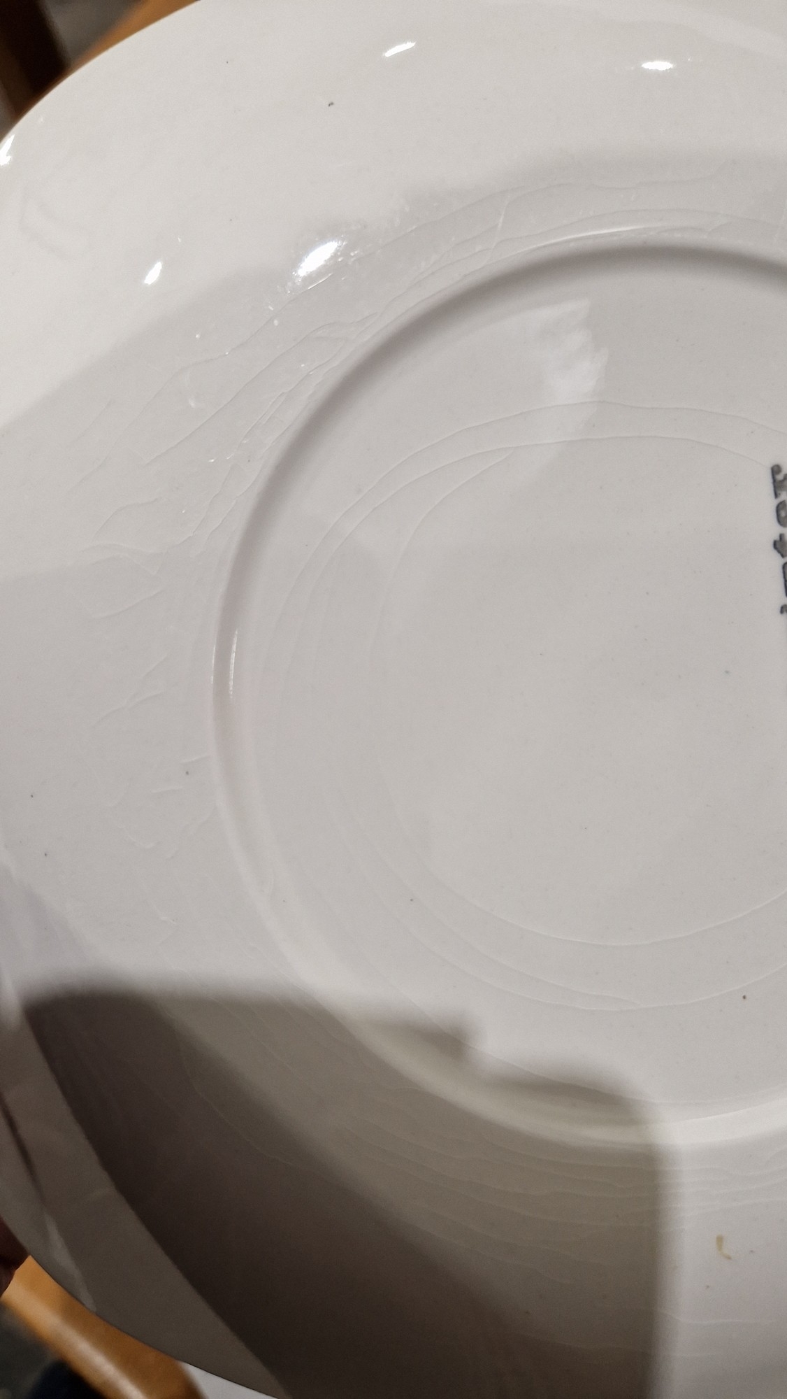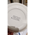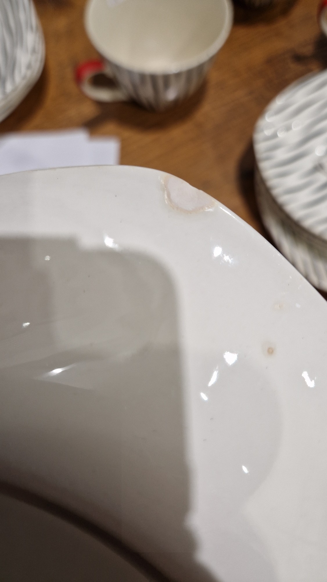 All items with typical wear and tear and signs of use. Dinner plates - 5 with chips, 2 with crazing, 1 with star crack Side plates - 2 with chip, 4 with crazing Milk jug - Crazing and staining to interior Saucers - 1 with chip, 1 with corner broken off but present Bowls - 3 with crazing, 1 with star crack, 2 with chips Teapot - Missing lid, staining to interior Tureens - 1 with crack near rim, crazing and staining, the other with crazing to underside of lid Gravy boat - Ladle with crazing and staining Condiment set - 2 items missing