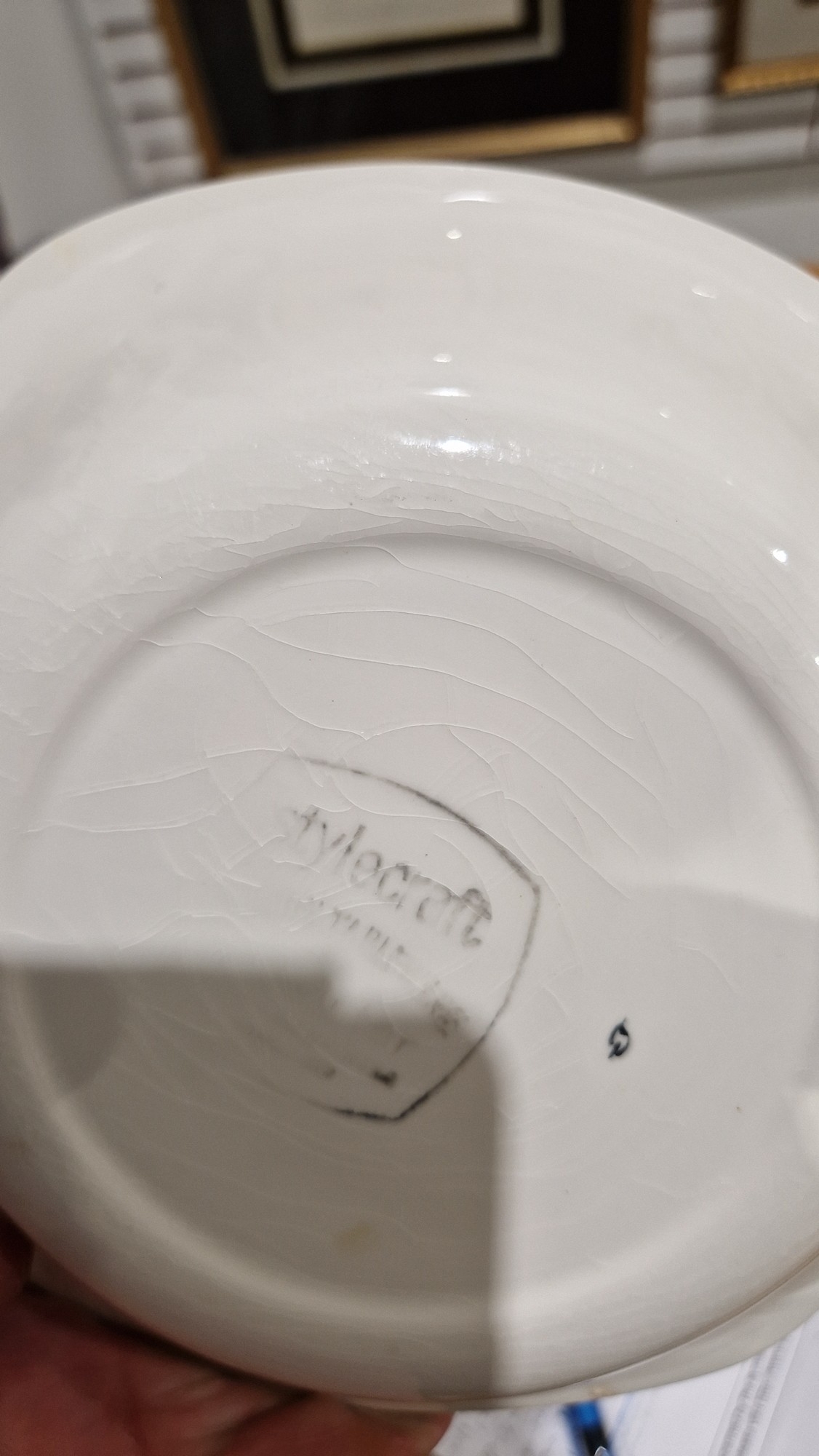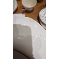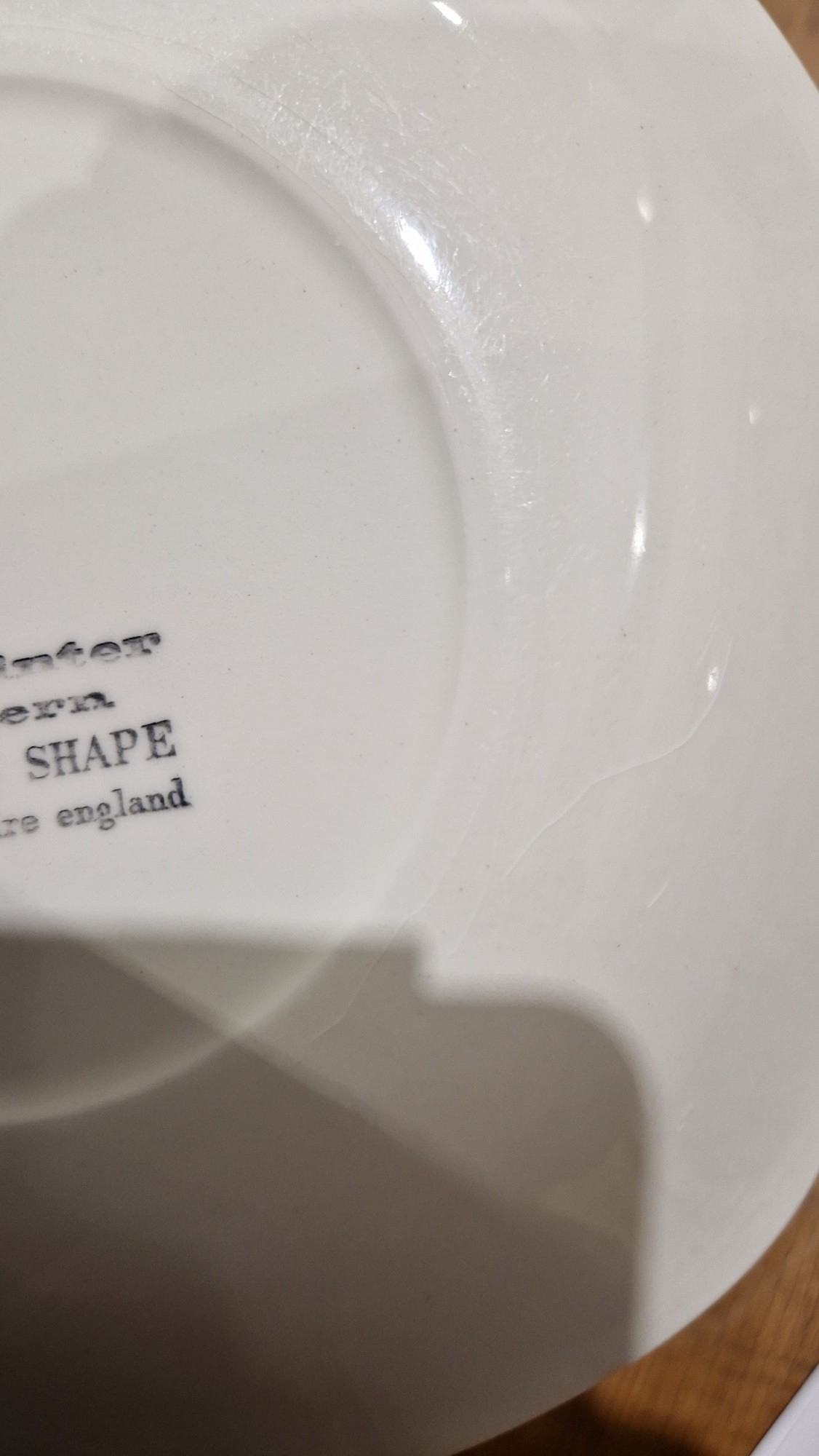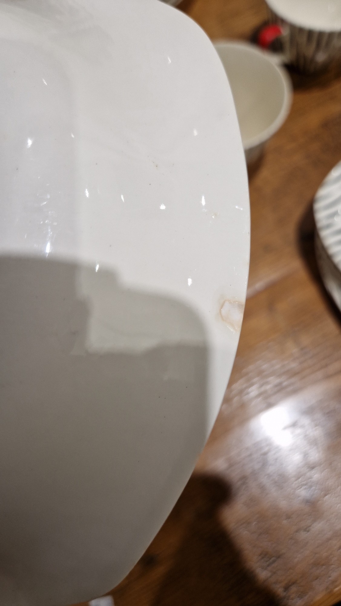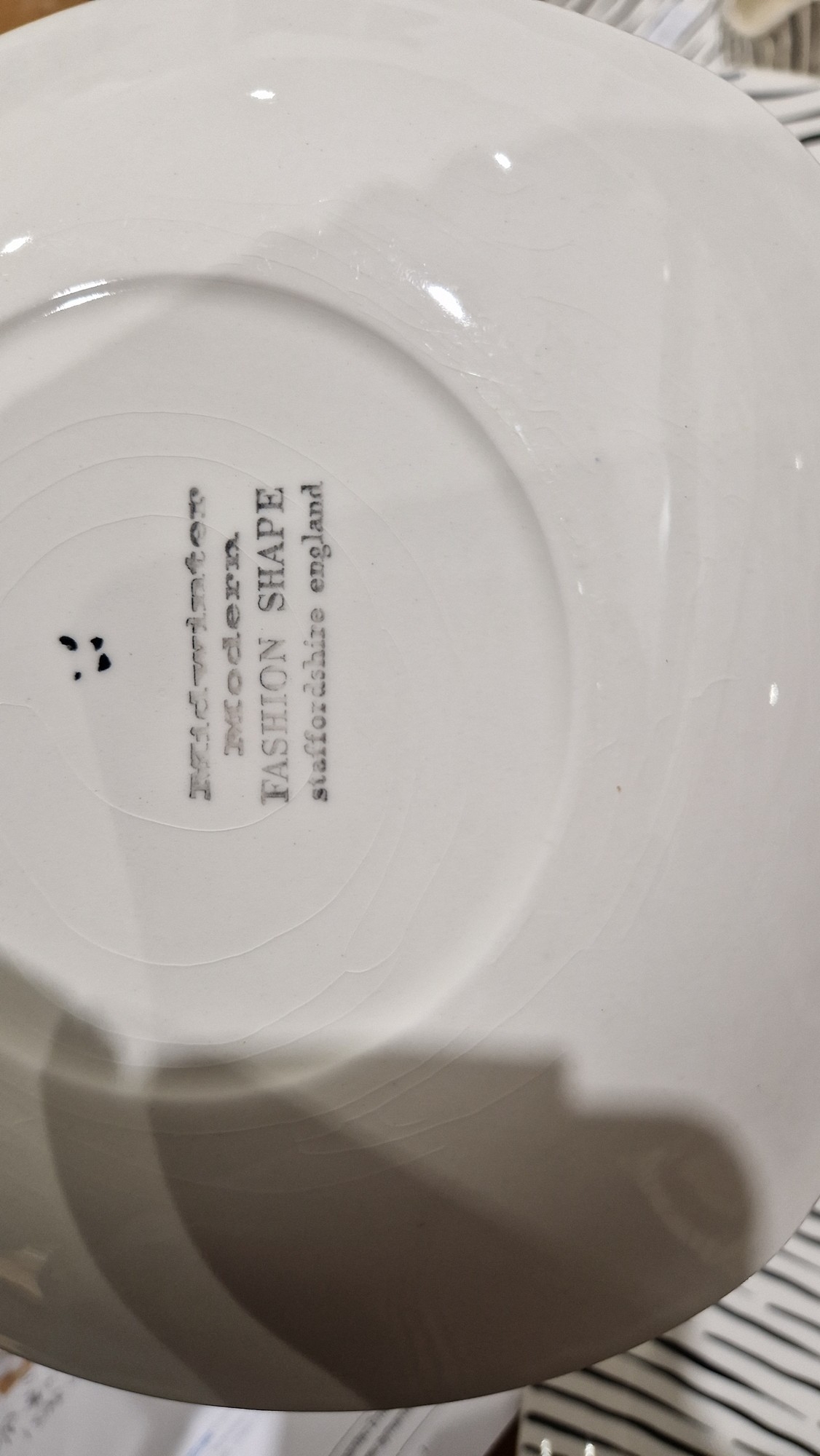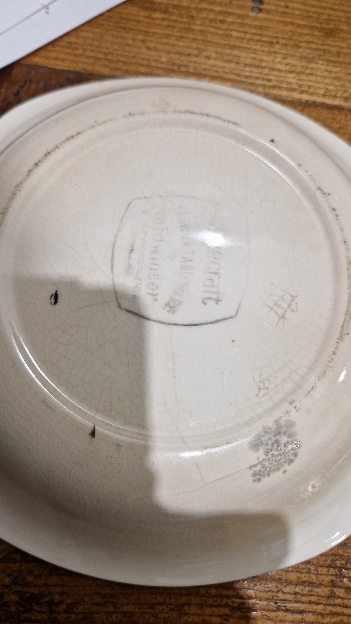 All items with typical wear and tear and signs of use. Dinner plates - 5 with chips, 2 with crazing, 1 with star crack Side plates - 2 with chip, 4 with crazing Milk jug - Crazing and staining to interior Saucers - 1 with chip, 1 with corner broken off but present Bowls - 3 with crazing, 1 with star crack, 2 with chips Teapot - Missing lid, staining to interior Tureens - 1 with crack near rim, crazing and staining, the other with crazing to underside of lid Gravy boat - Ladle with crazing and staining Condiment set - 2 items missing