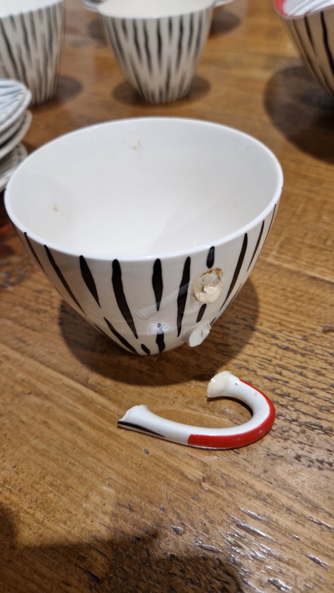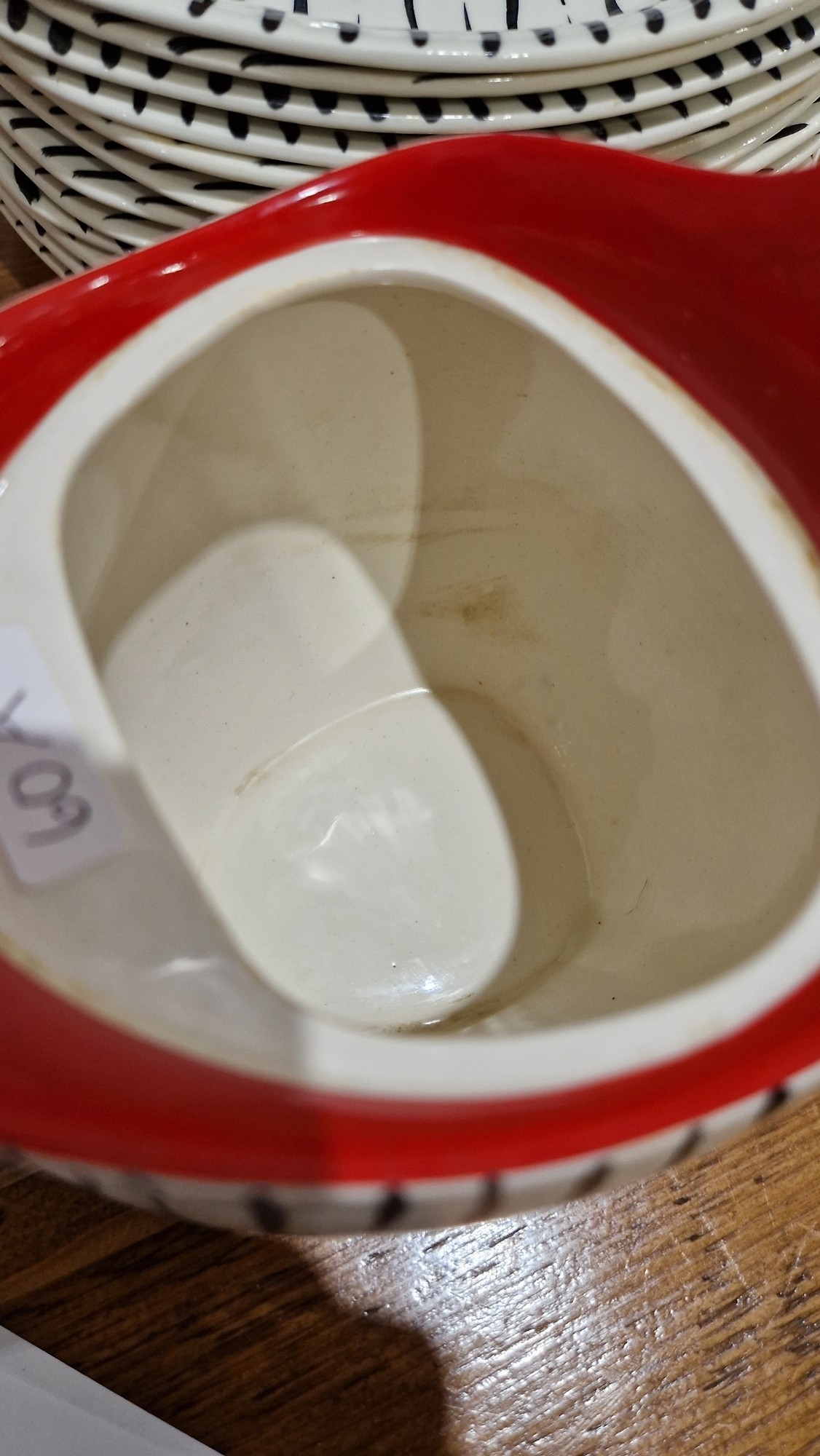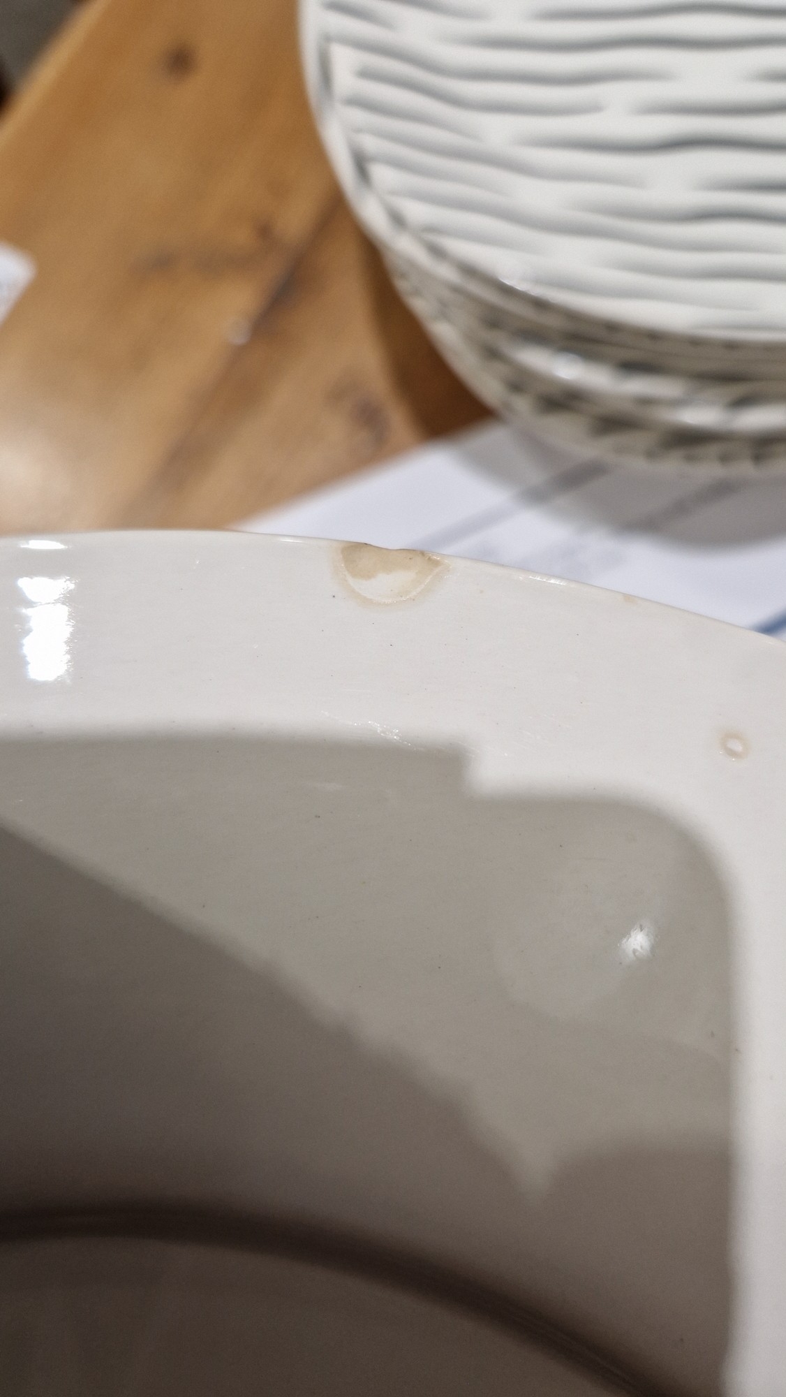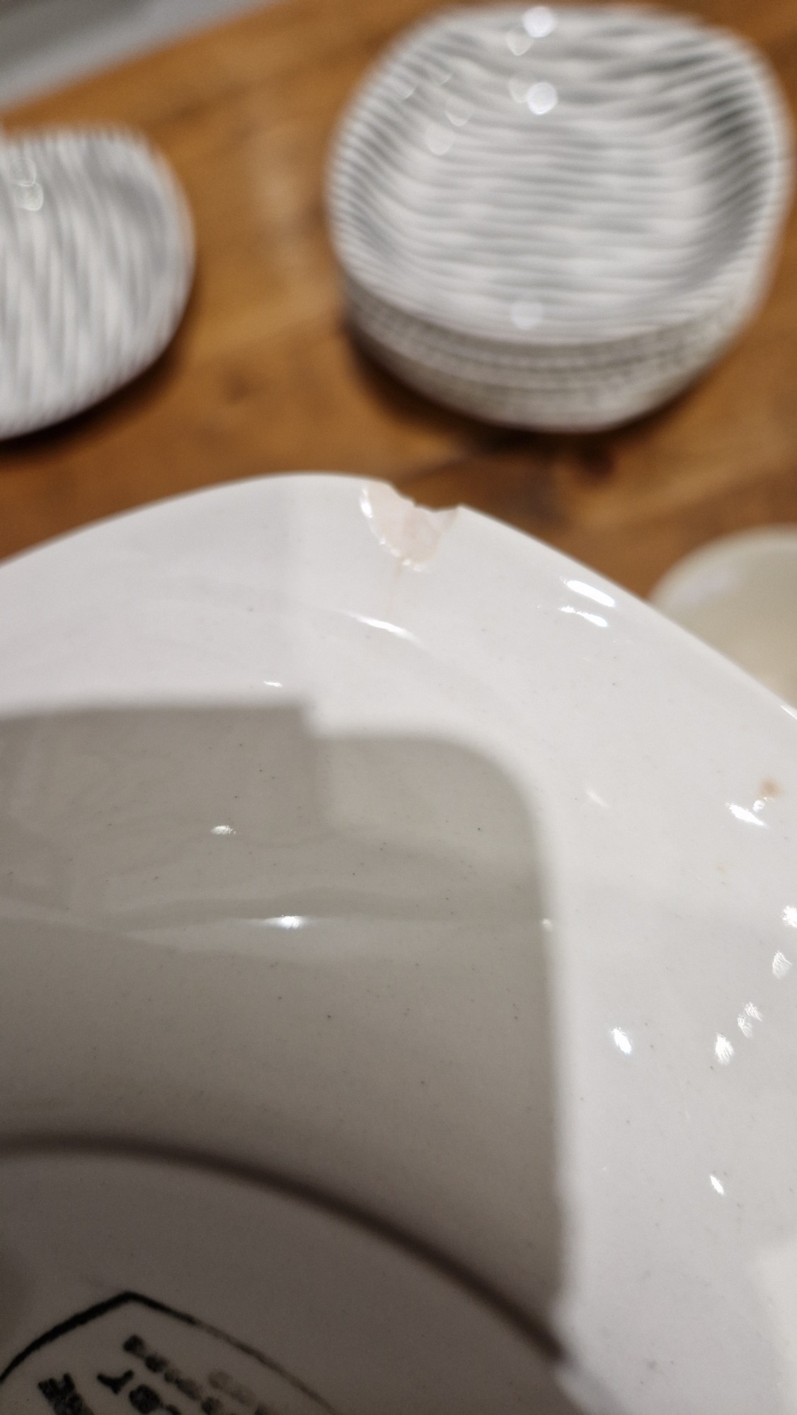 All items with typical wear and tear and signs of use. Dinner plates - 5 with chips, 2 with crazing, 1 with star crack Side plates - 2 with chip, 4 with crazing Milk jug - Crazing and staining to interior Saucers - 1 with chip, 1 with corner broken off but present Bowls - 3 with crazing, 1 with star crack, 2 with chips Teapot - Missing lid, staining to interior Tureens - 1 with crack near rim, crazing and staining, the other with crazing to underside of lid Gravy boat - Ladle with crazing and staining Condiment set - 2 items missing