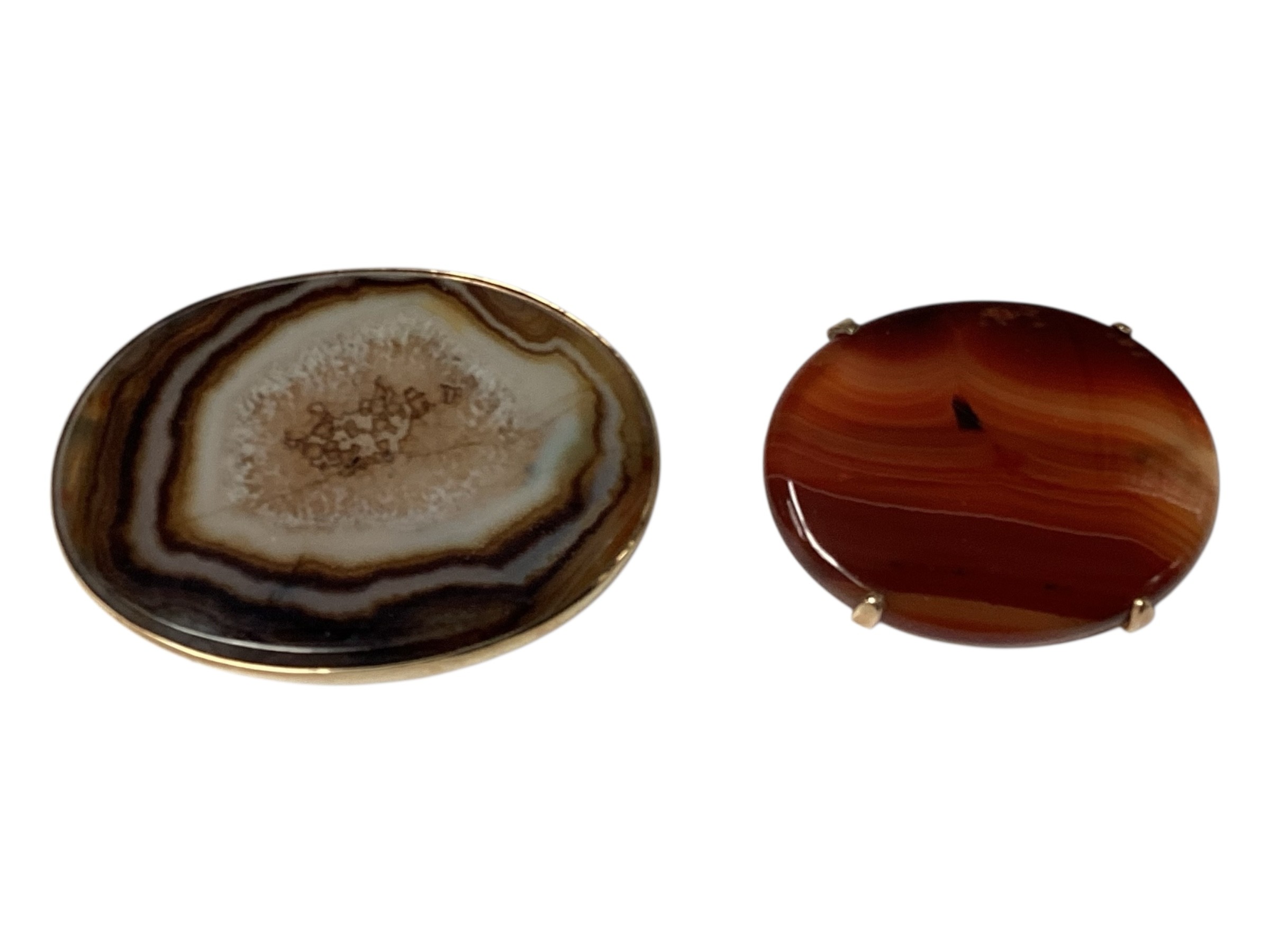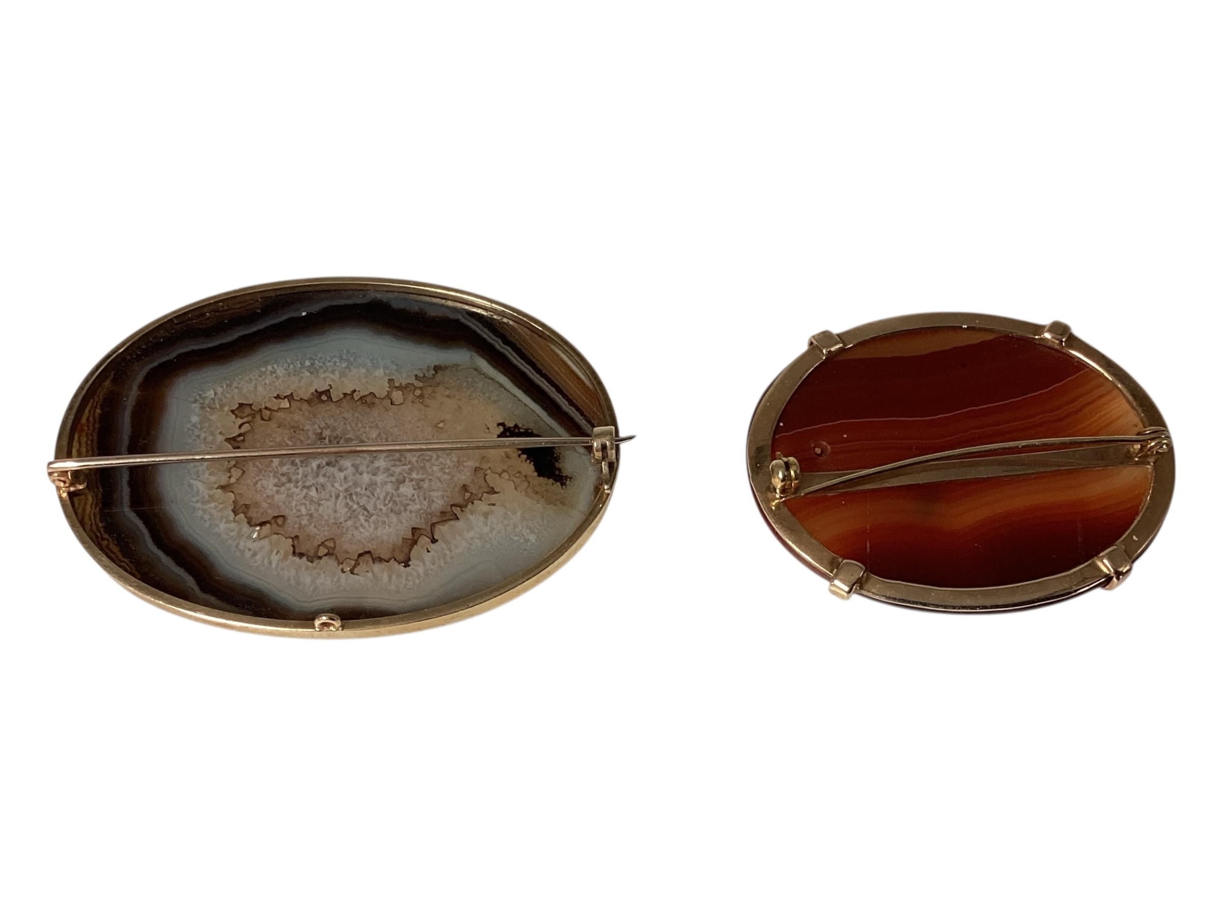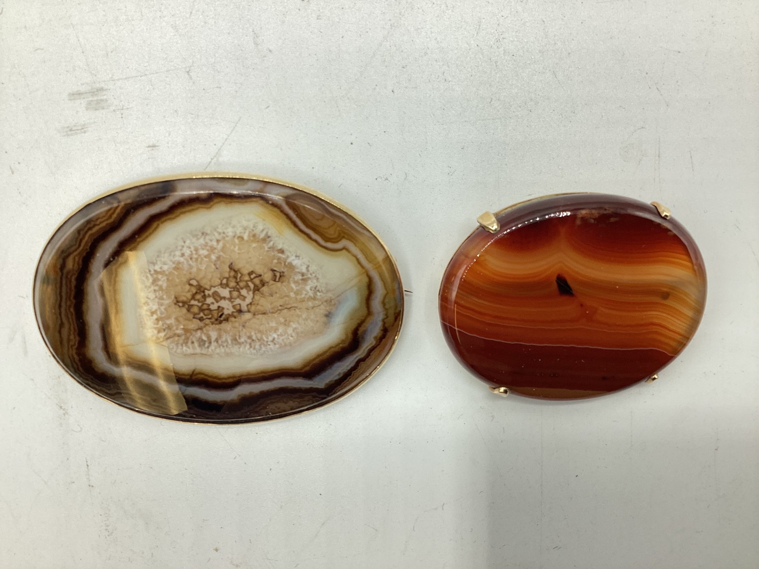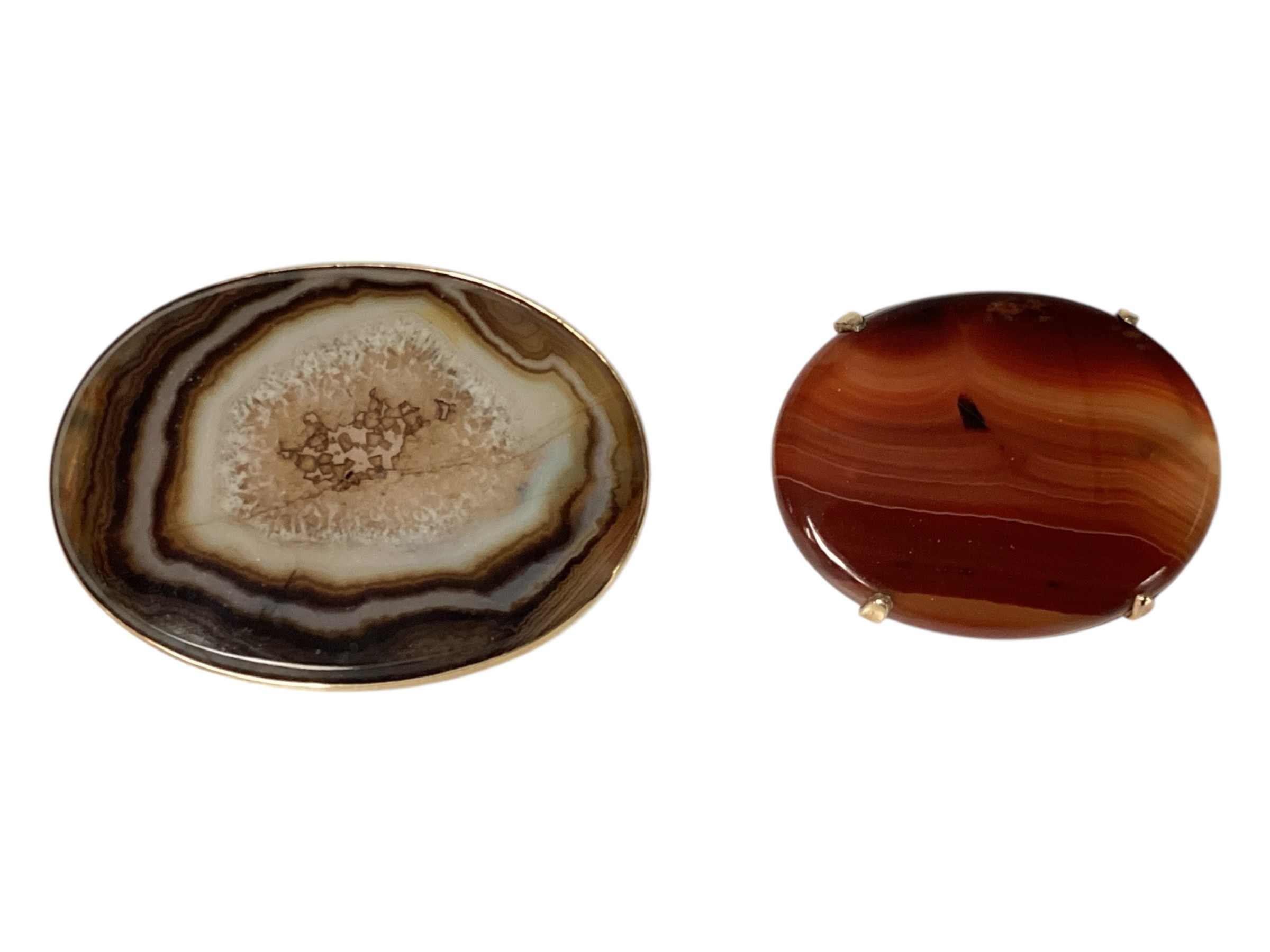Two Scottish hard stone brooches in unmarked yellow metal mounts, oval agate plaque, 65 mm x 50 mm. Oval carnelian plaque 48 mm x 40 mm. Gross weight 48 g.