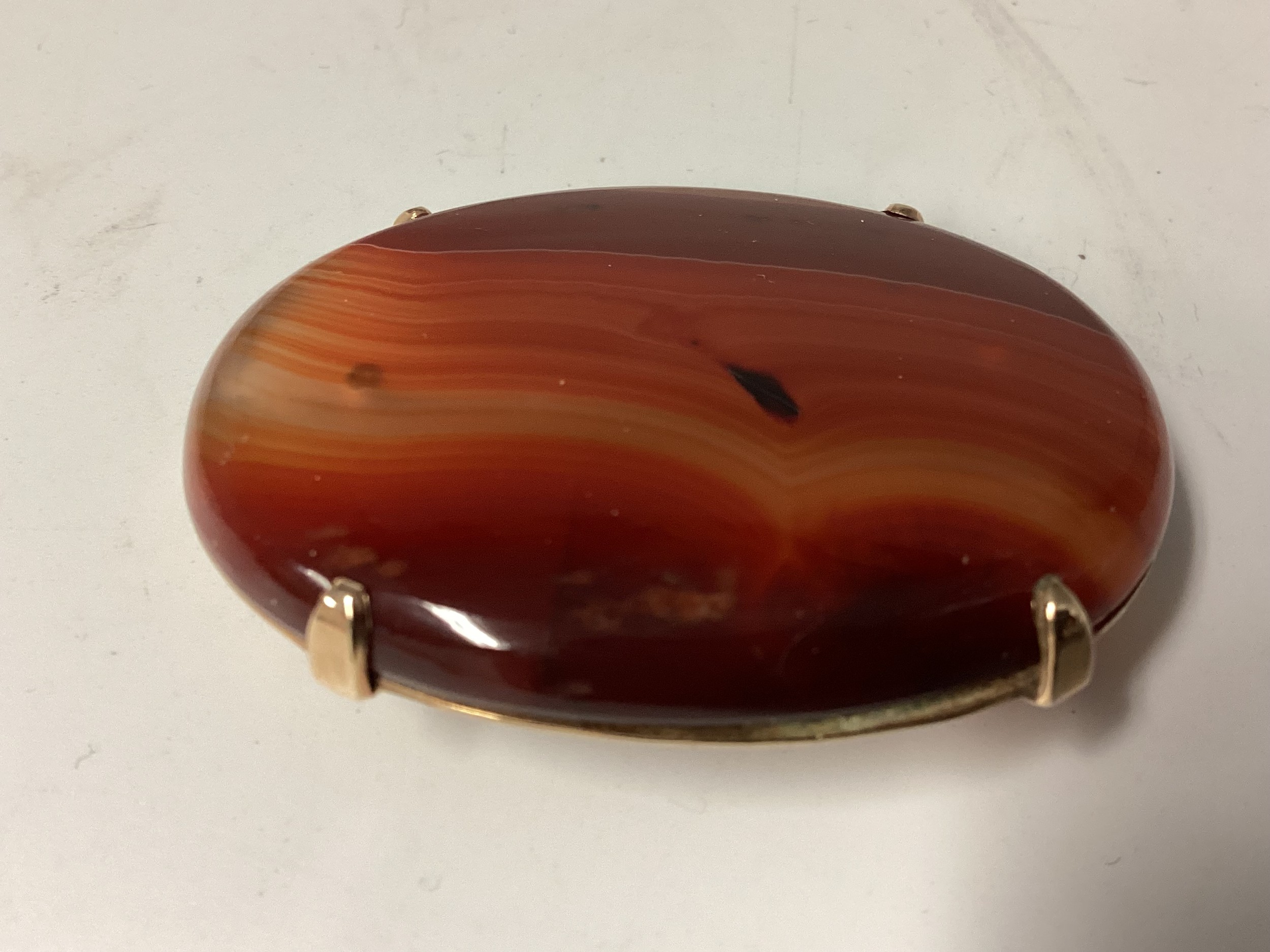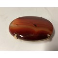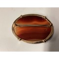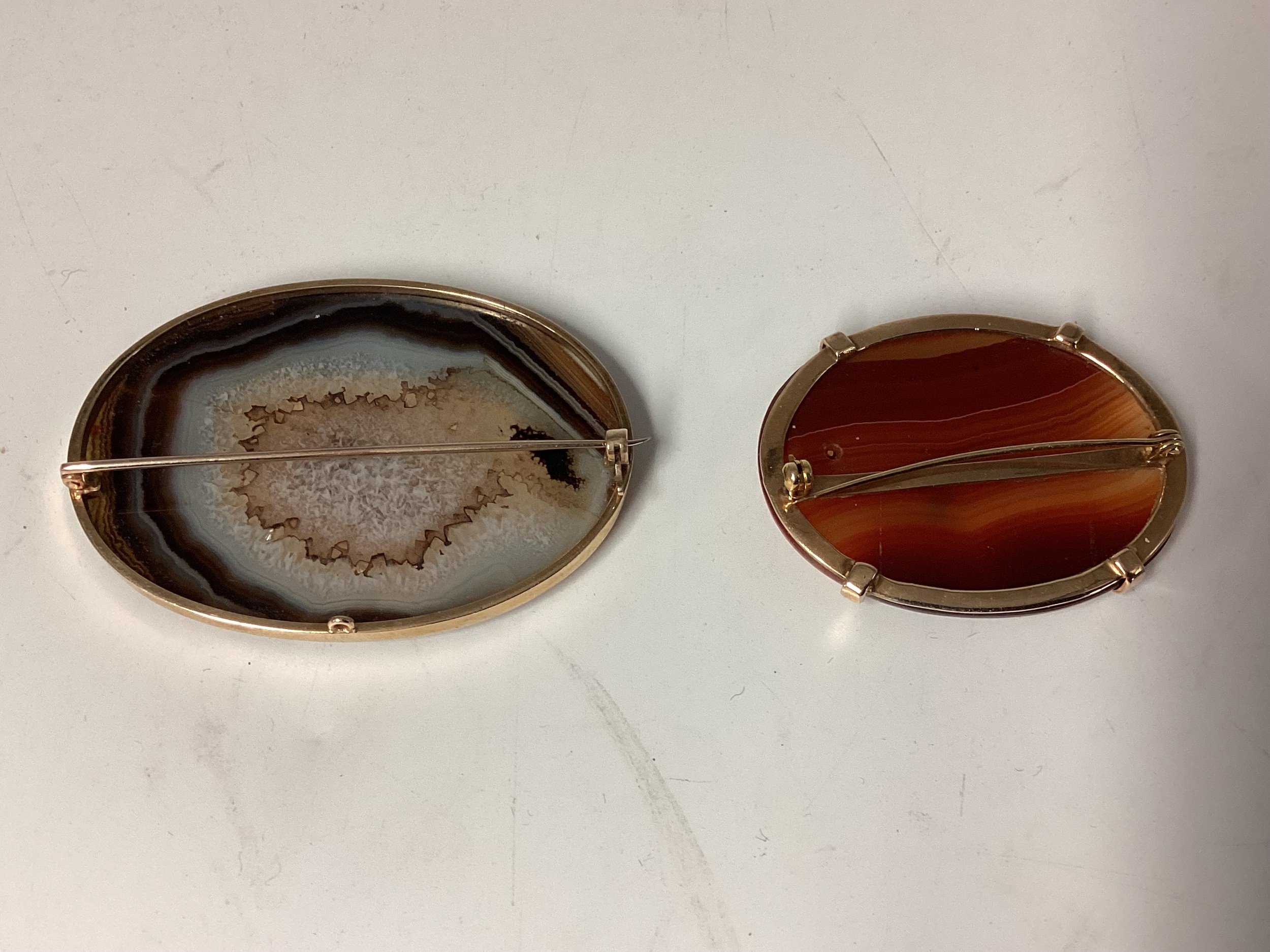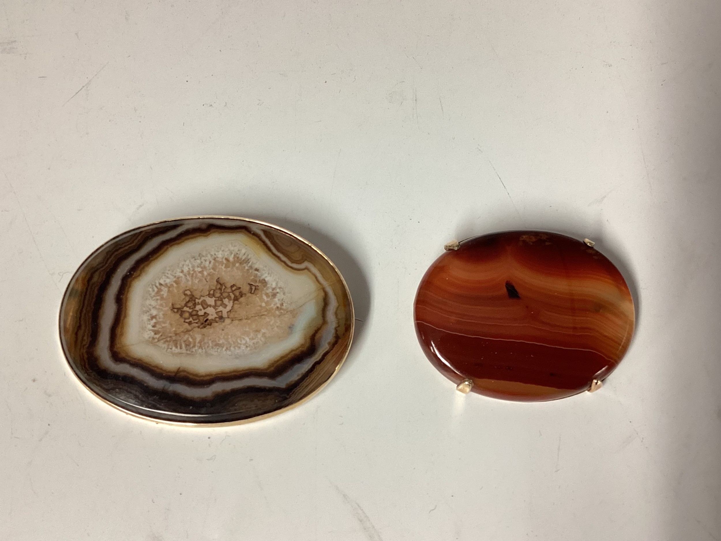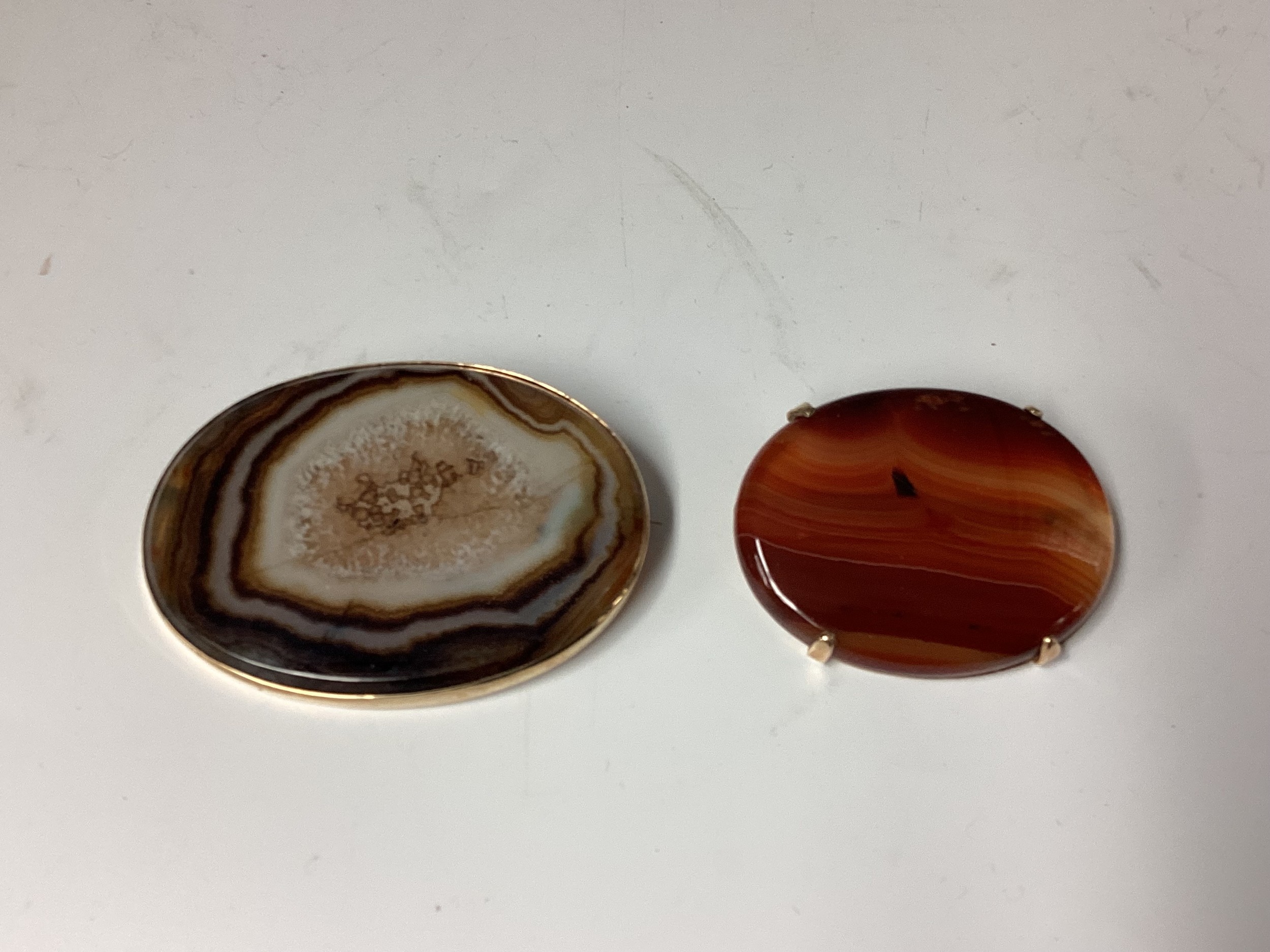 Two Scottish hard stone brooches in unmarked yellow metal mounts, oval agate plaque, 65 mm x 50 mm. Oval carnelian plaque 48 mm x 40 mm. Gross weight 48 g.