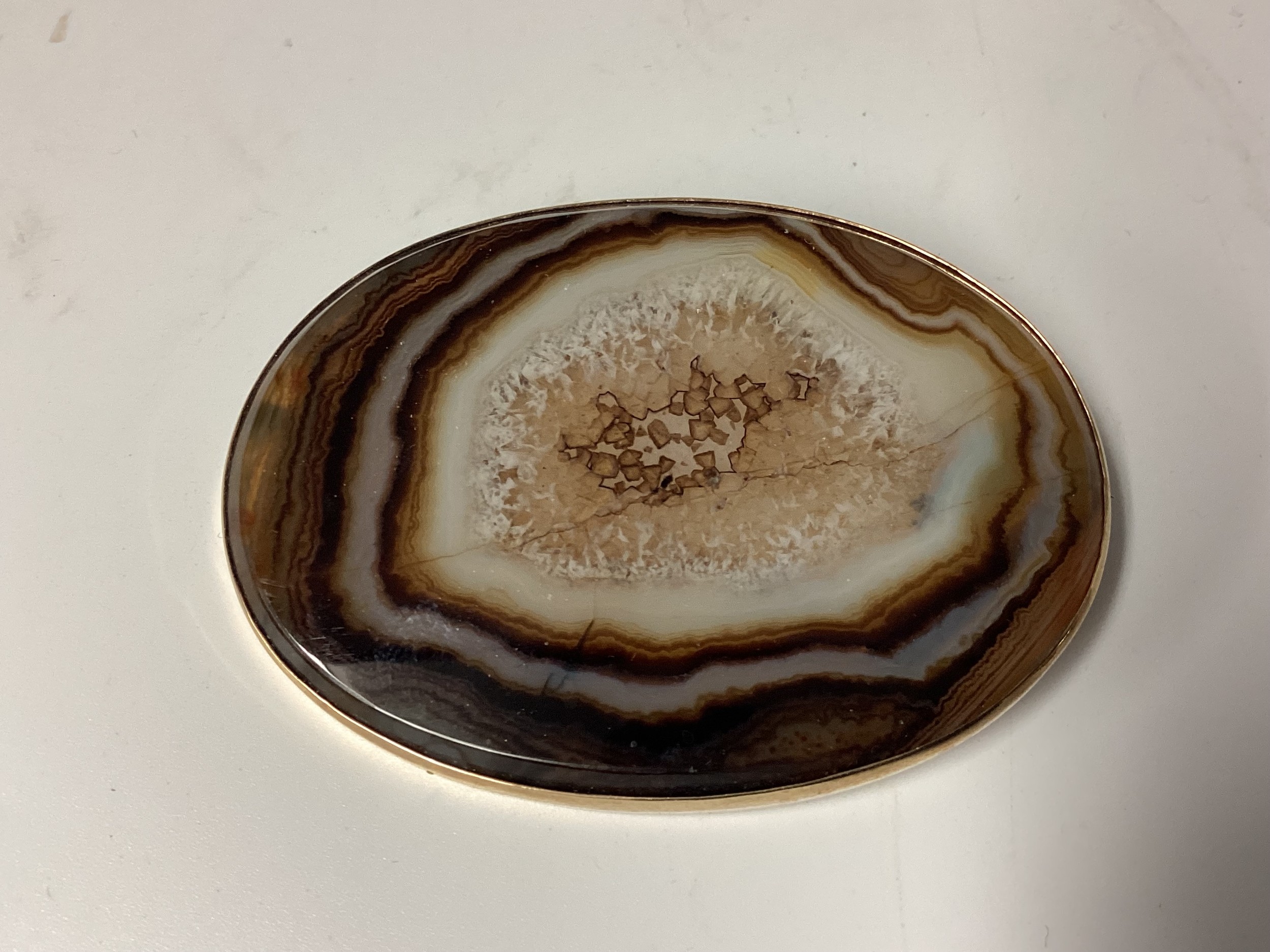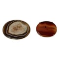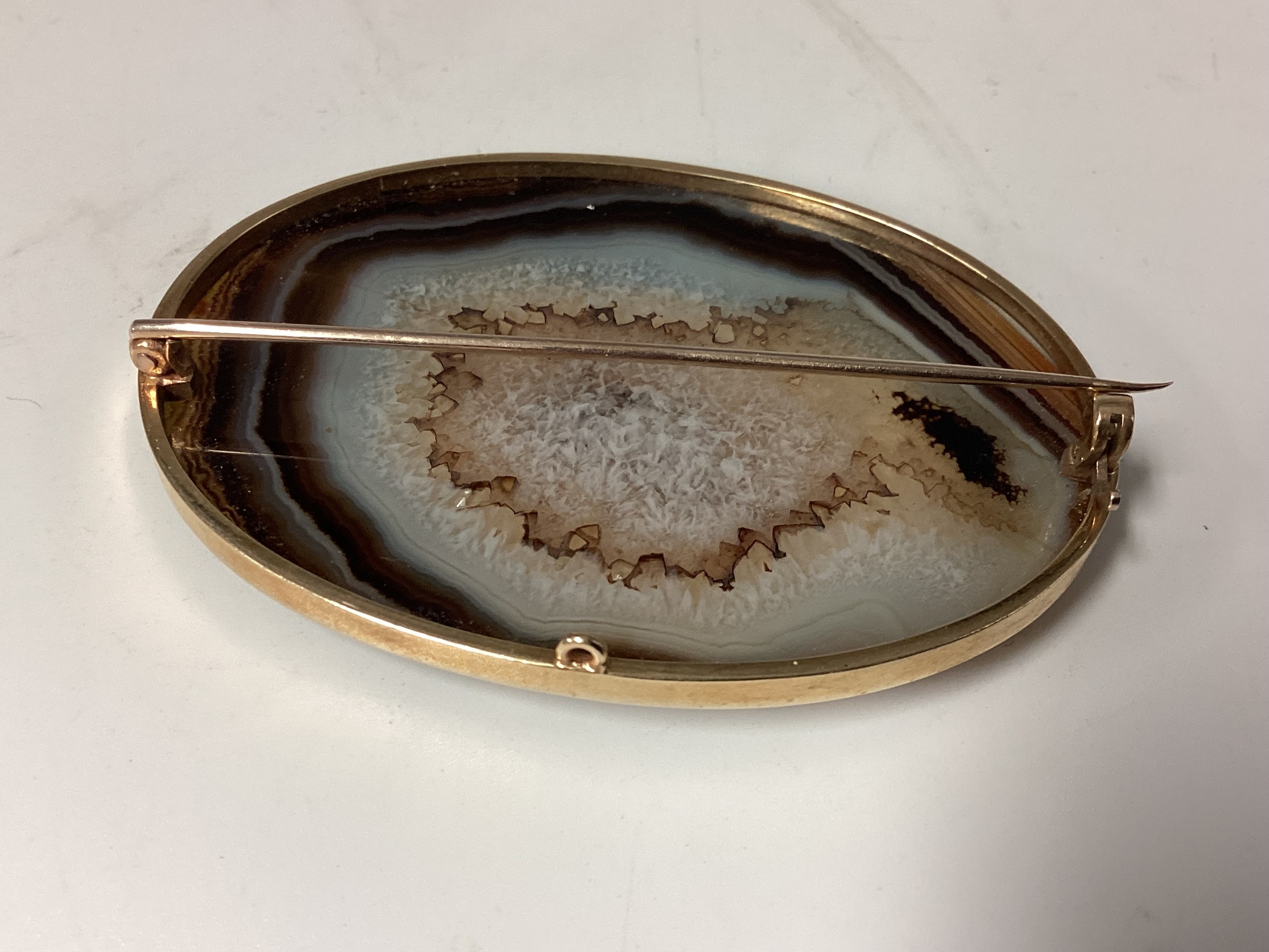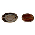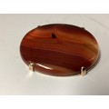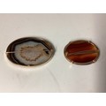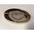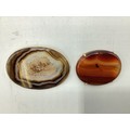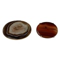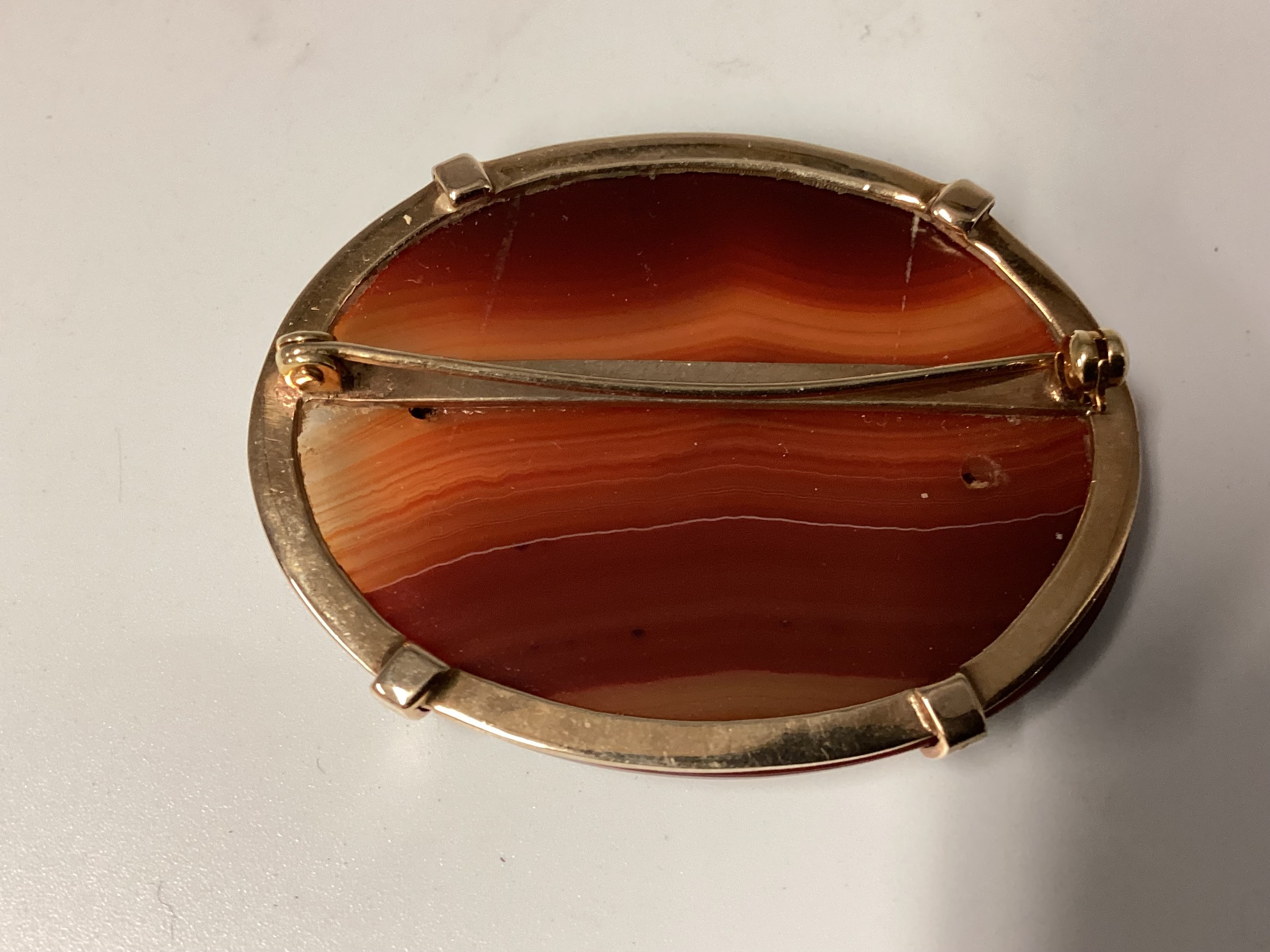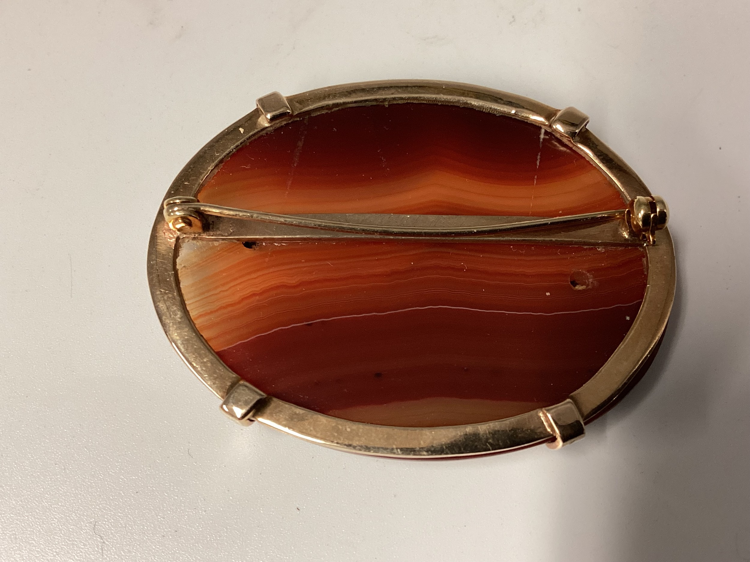 Two Scottish hard stone brooches in unmarked yellow metal mounts, oval agate plaque, 65 mm x 50 mm. Oval carnelian plaque 48 mm x 40 mm. Gross weight 48 g.