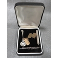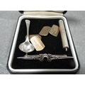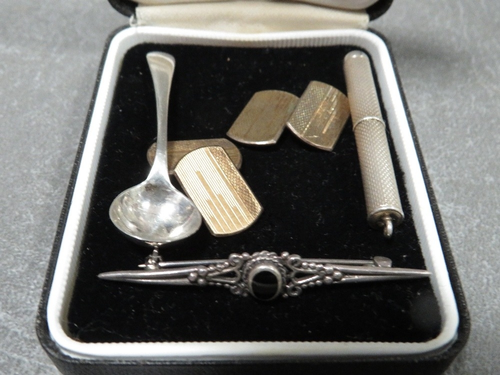A silver cigar piercer, brooch, salt spoon and Art Deco gold on silver cufflinks