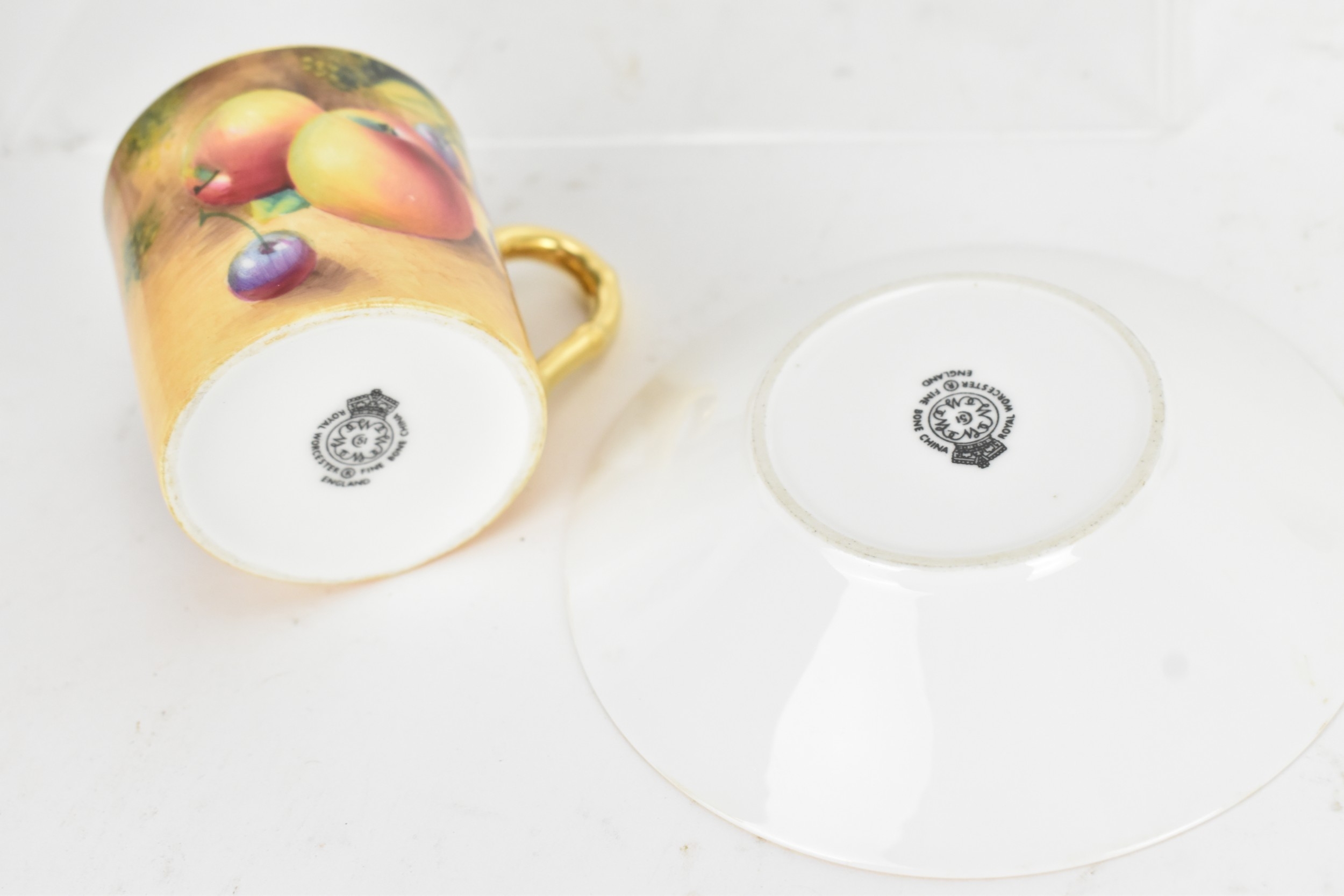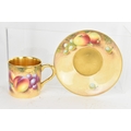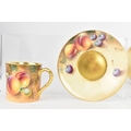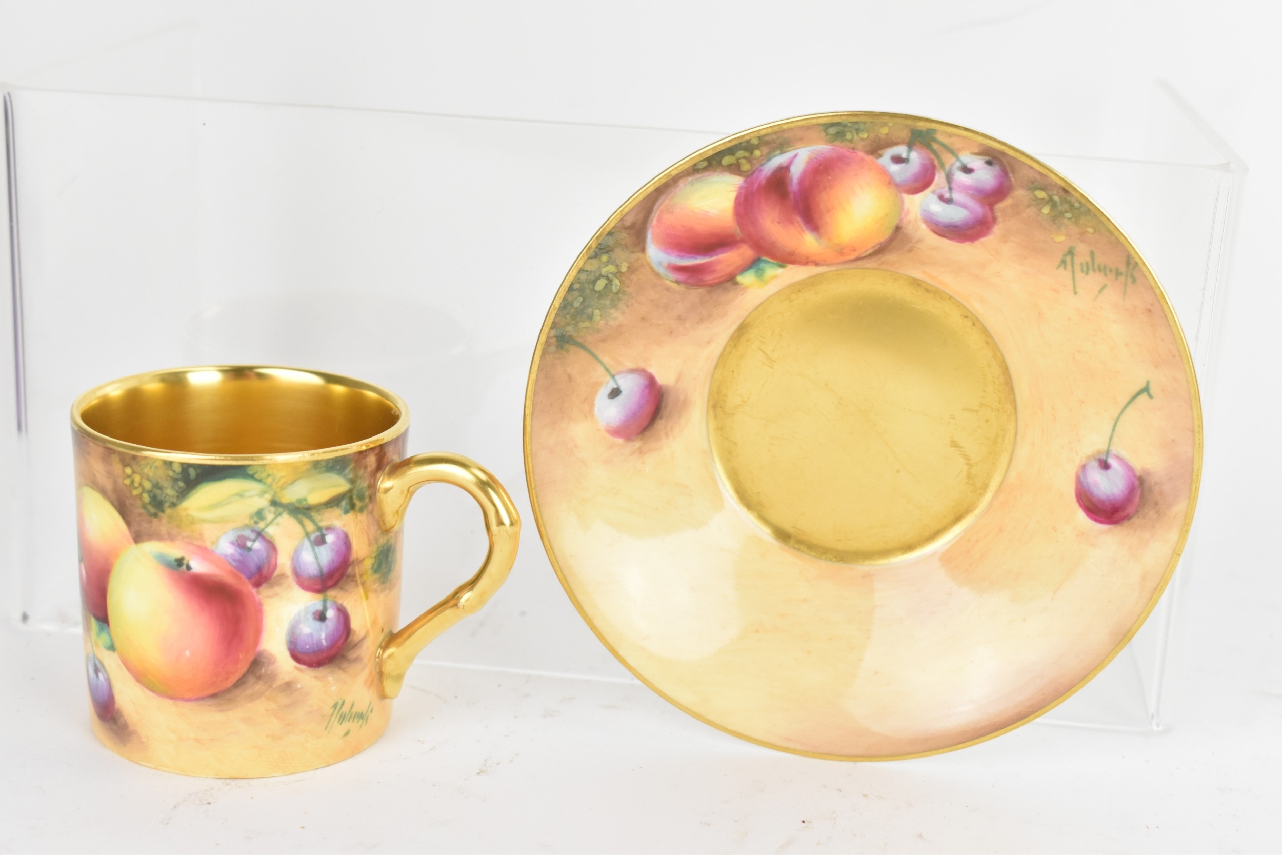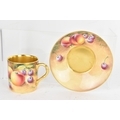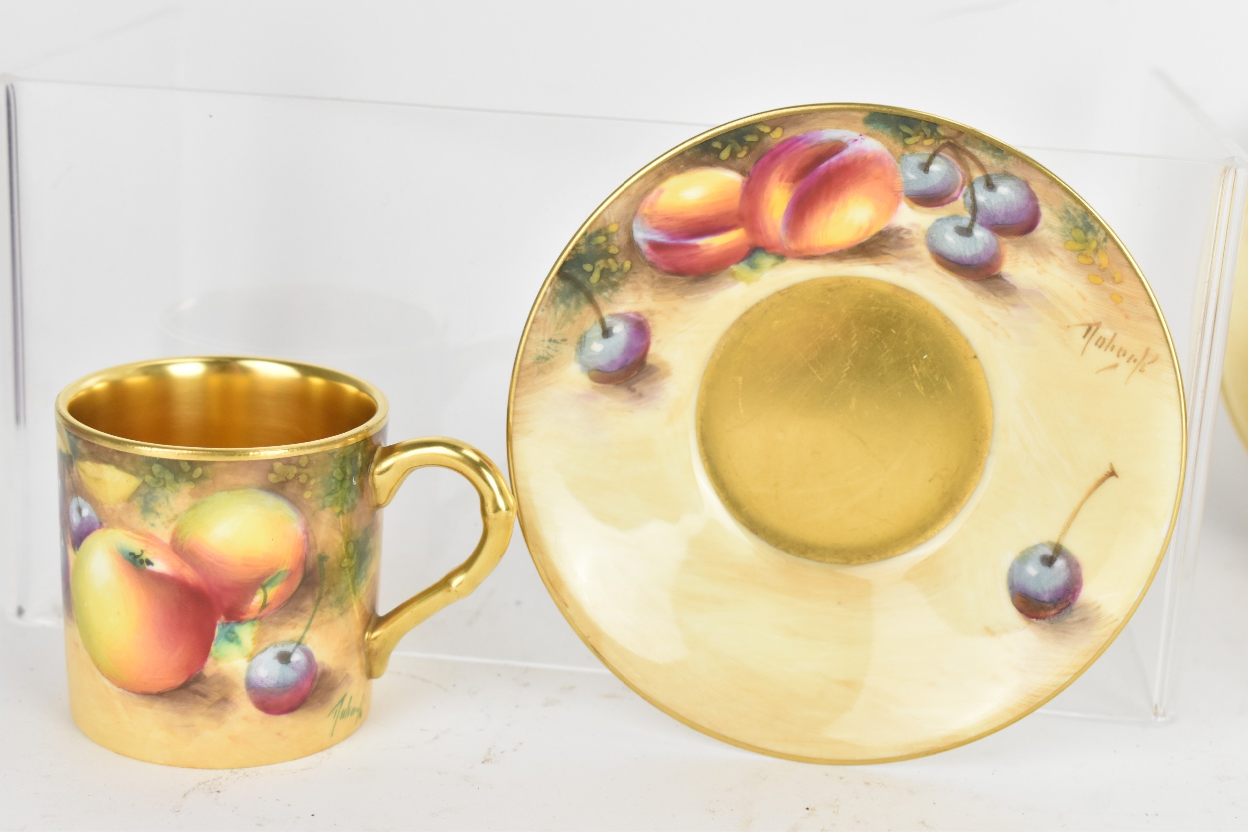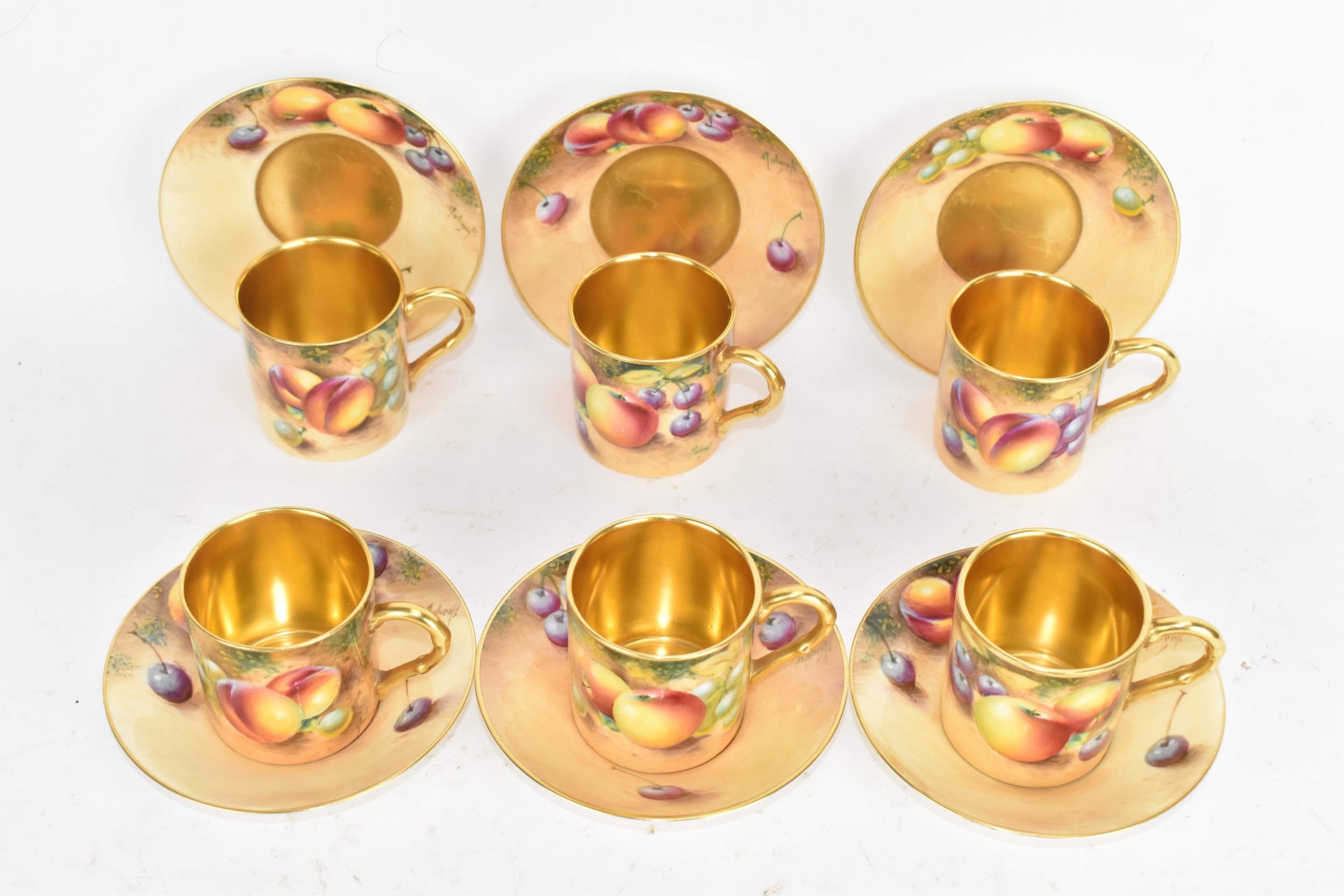 Six Royal Worcester porcelain coffee cans and saucers, by William Roberts, post-war, artist signed, each hand-painted with still-life fruits with gilt interiors and borders, and bearing black factory marks to the bases, the cups 5.3cm high x 7.5cm wide, the saucers 10.8cm diameter