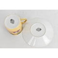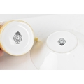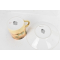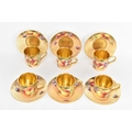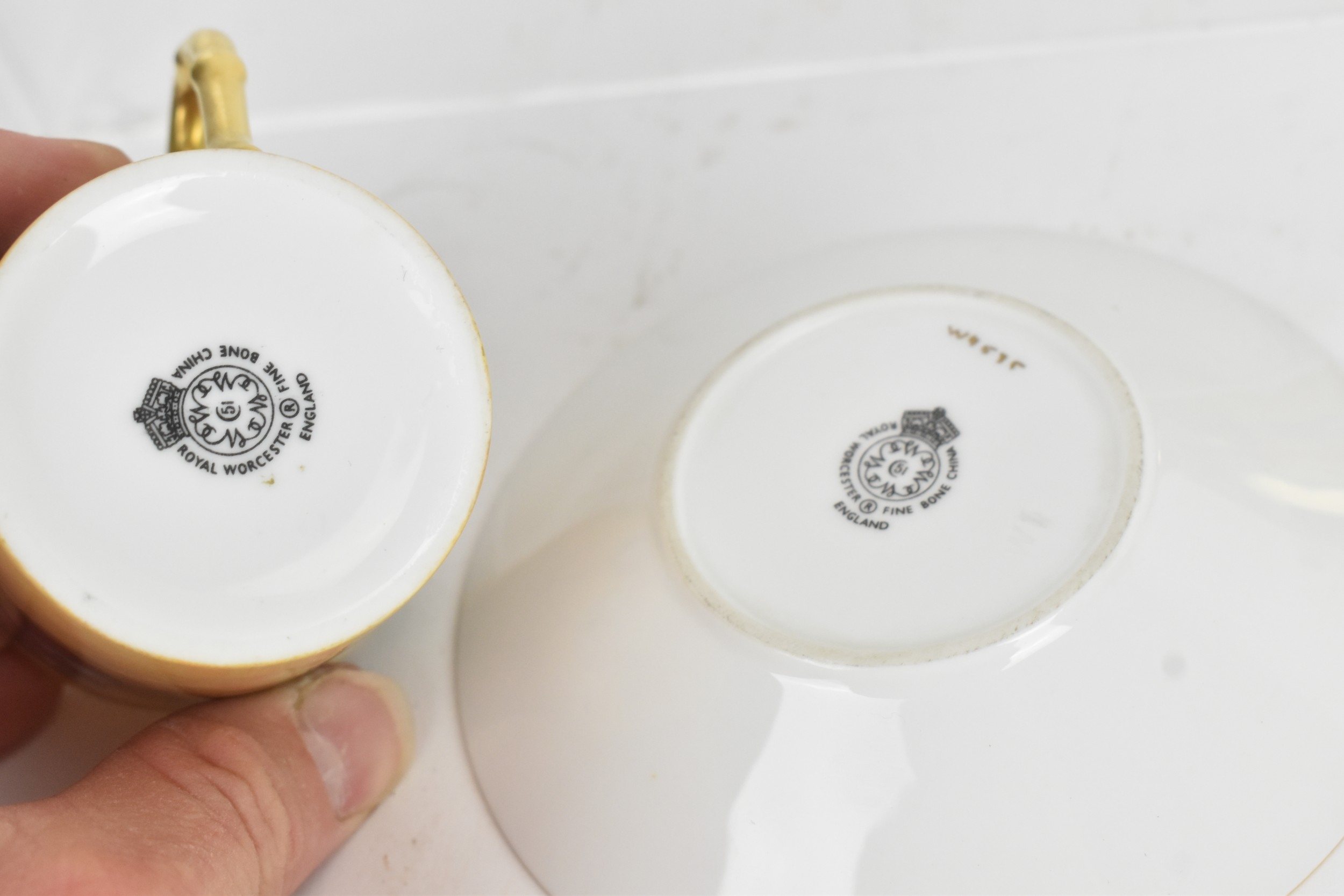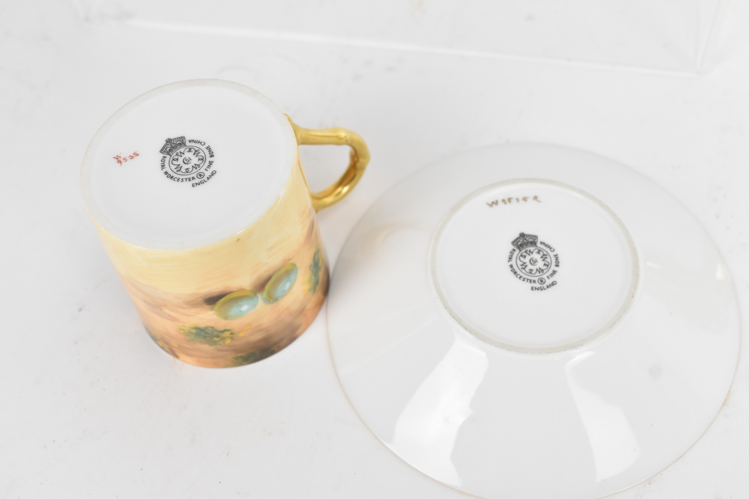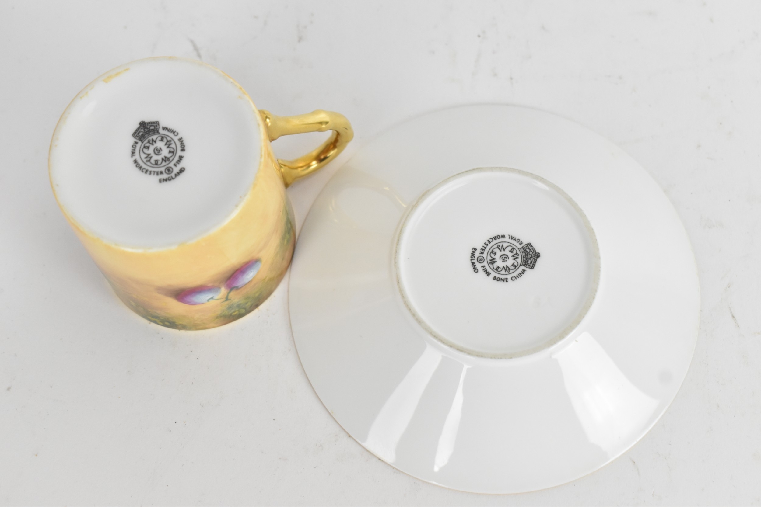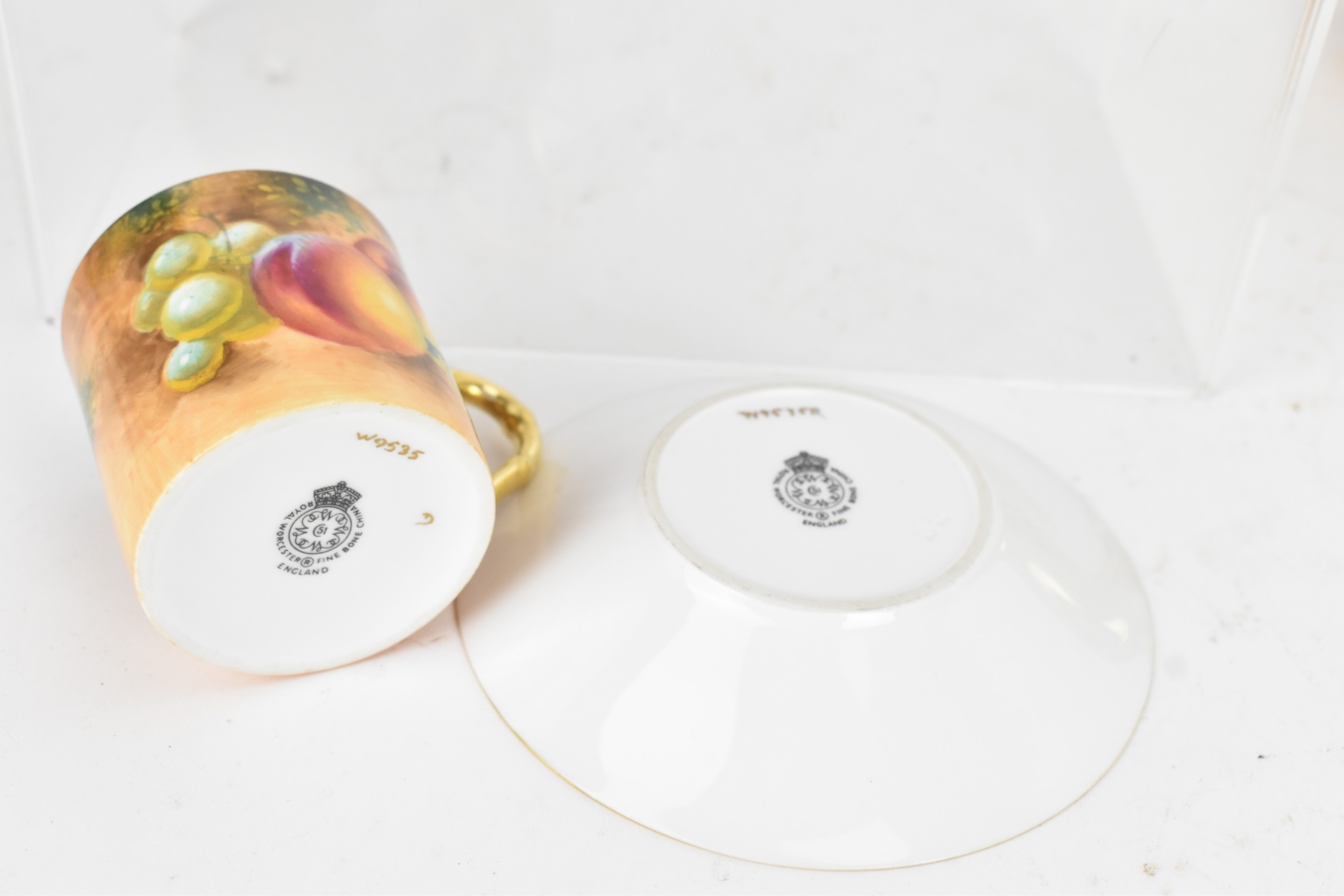Six Royal Worcester porcelain coffee cans and saucers, by William Roberts, post-war, artist signed, each hand-painted with still-life fruits with gilt interiors and borders, and bearing black factory marks to the bases, the cups 5.3cm high x 7.5cm wide, the saucers 10.8cm diameter