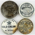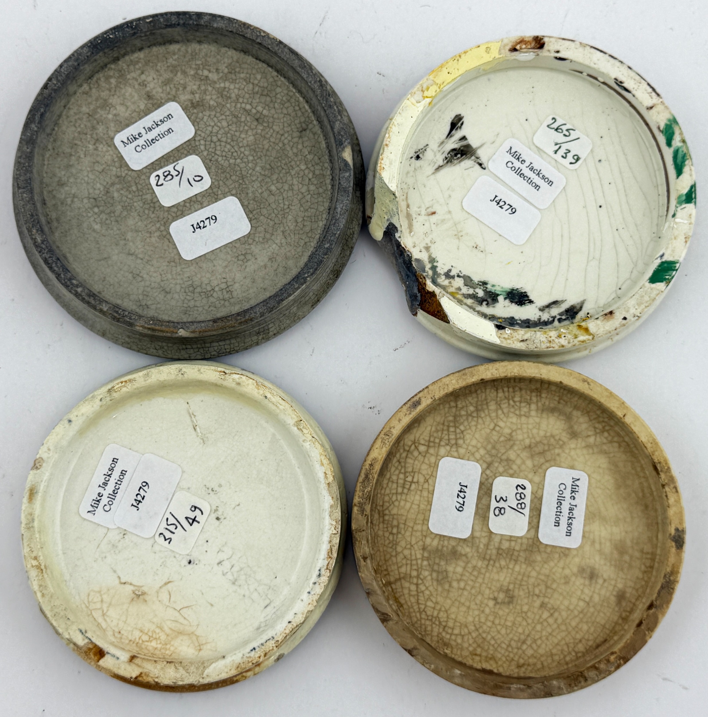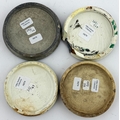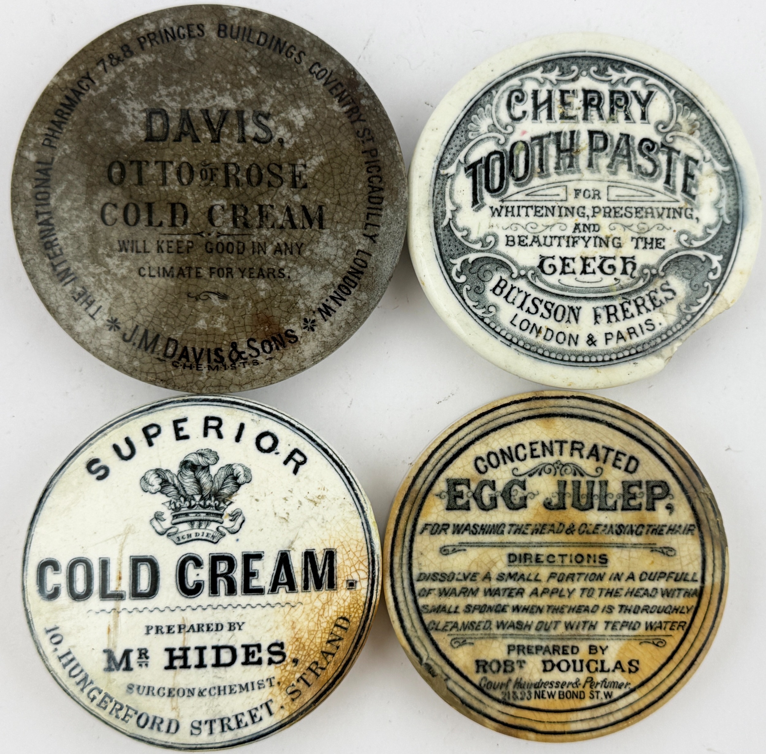 POT LID GROUP. Largest 3.25ins. Cherry Tooth Paste, Egg Julep & Cold Cream. Discolouration, chips & repaired. (4)