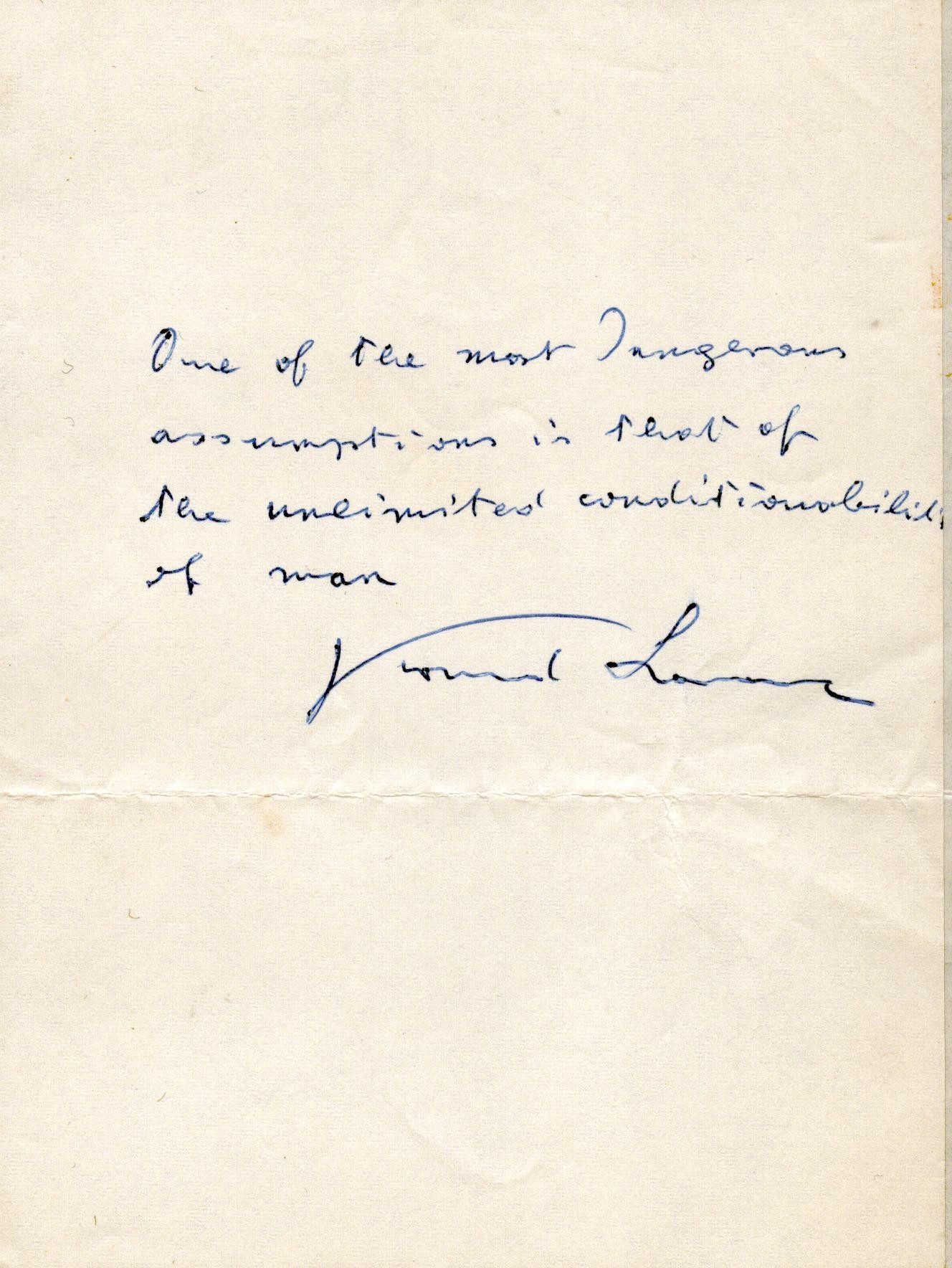 Konrad Zacharias Lorenz signed note, he was an Austrian zoologist, ethologist, and ornithologist widely regarded as a founder of modern ethology.