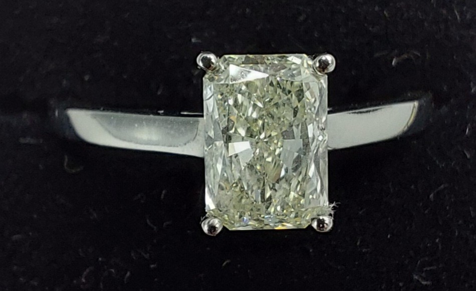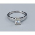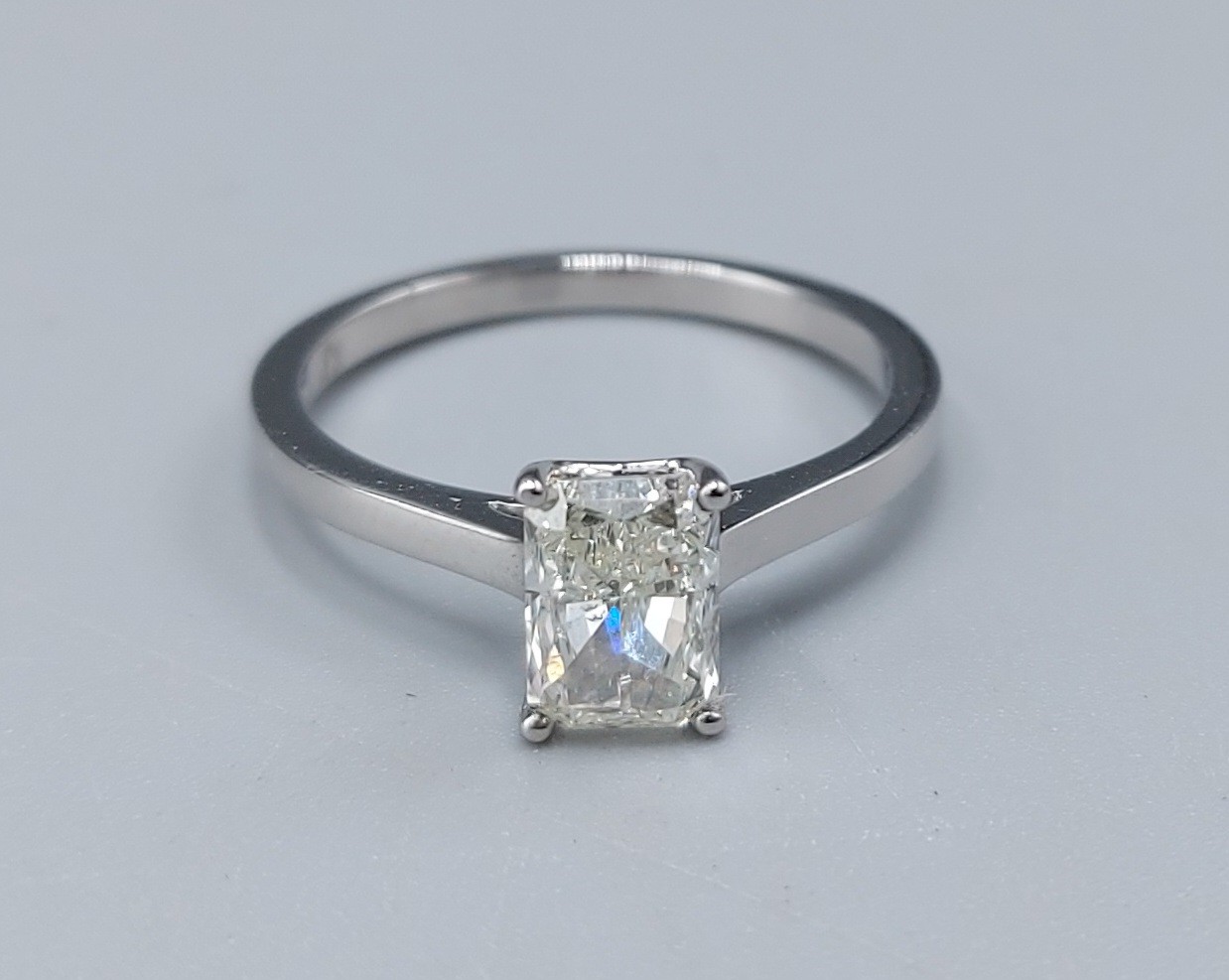 A Platinum solitaire Dimond ring set with baguette cut Diamond, approx 1ct, ring size L, 3.2gms