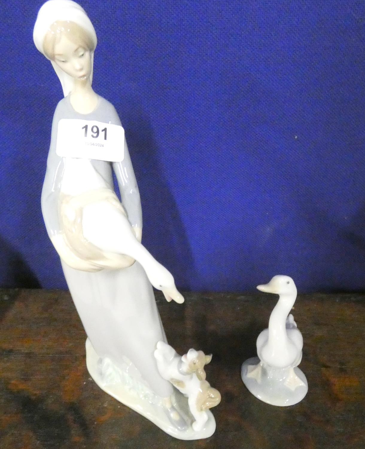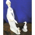 Lladro figure of a Spanish Lady with a duck and puppy playing also a duck figure.