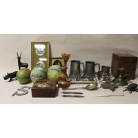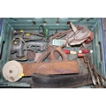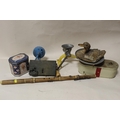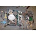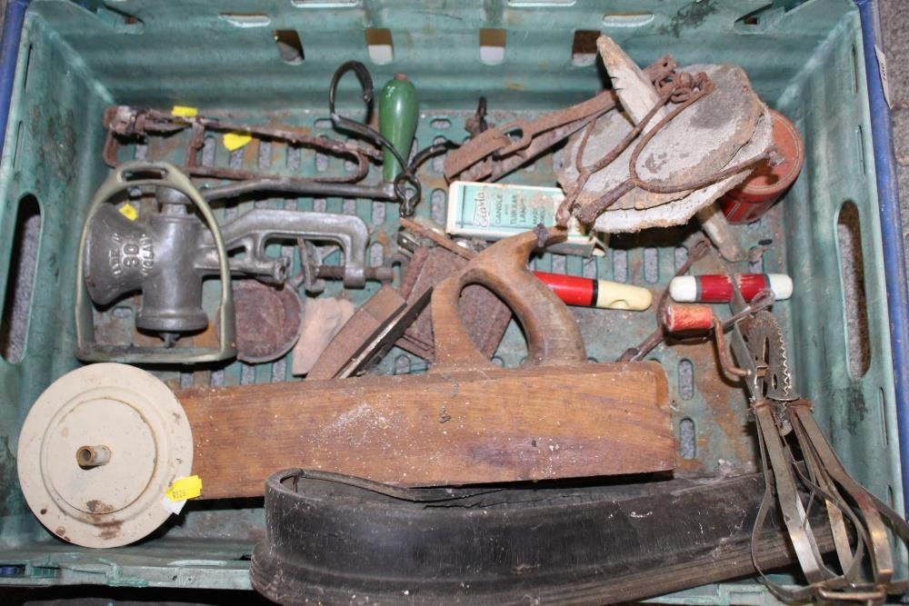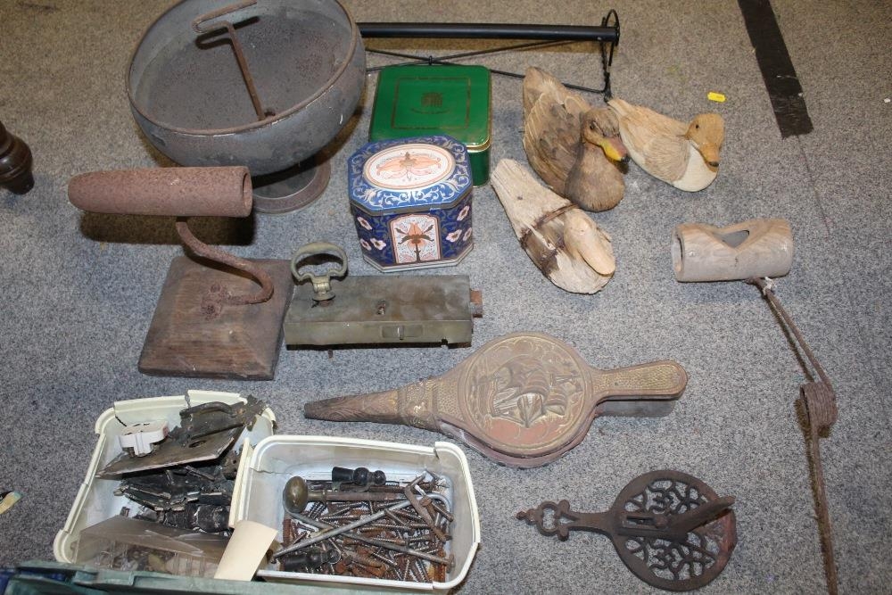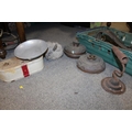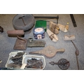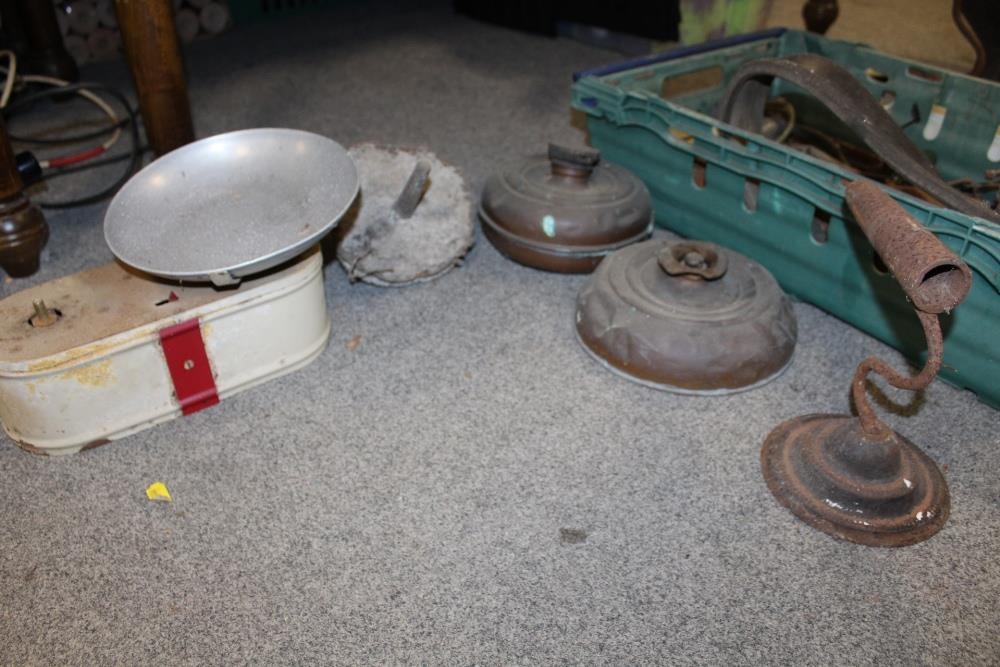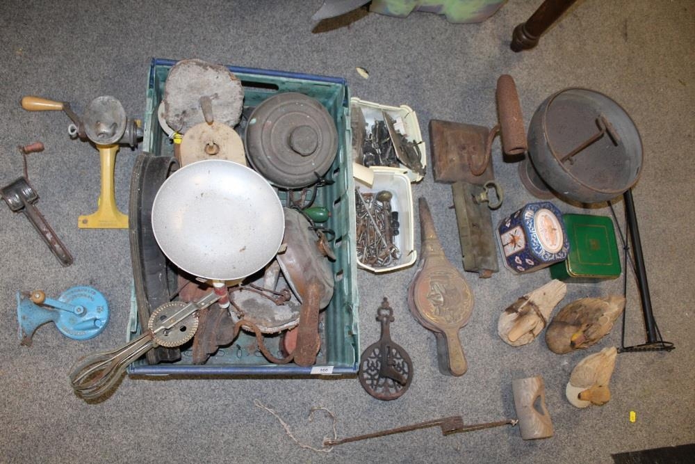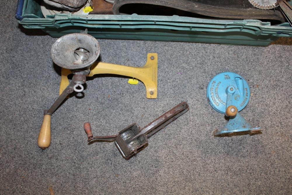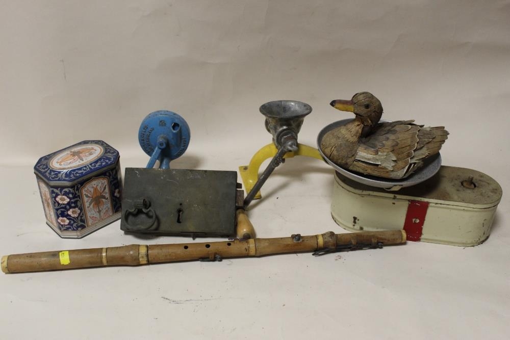 A BOX OF VINTAGE KITCHENALIA ETC, to include a Spong & Co 102 bean slicer, table mincer, scales, vintage door lock mechanism etc