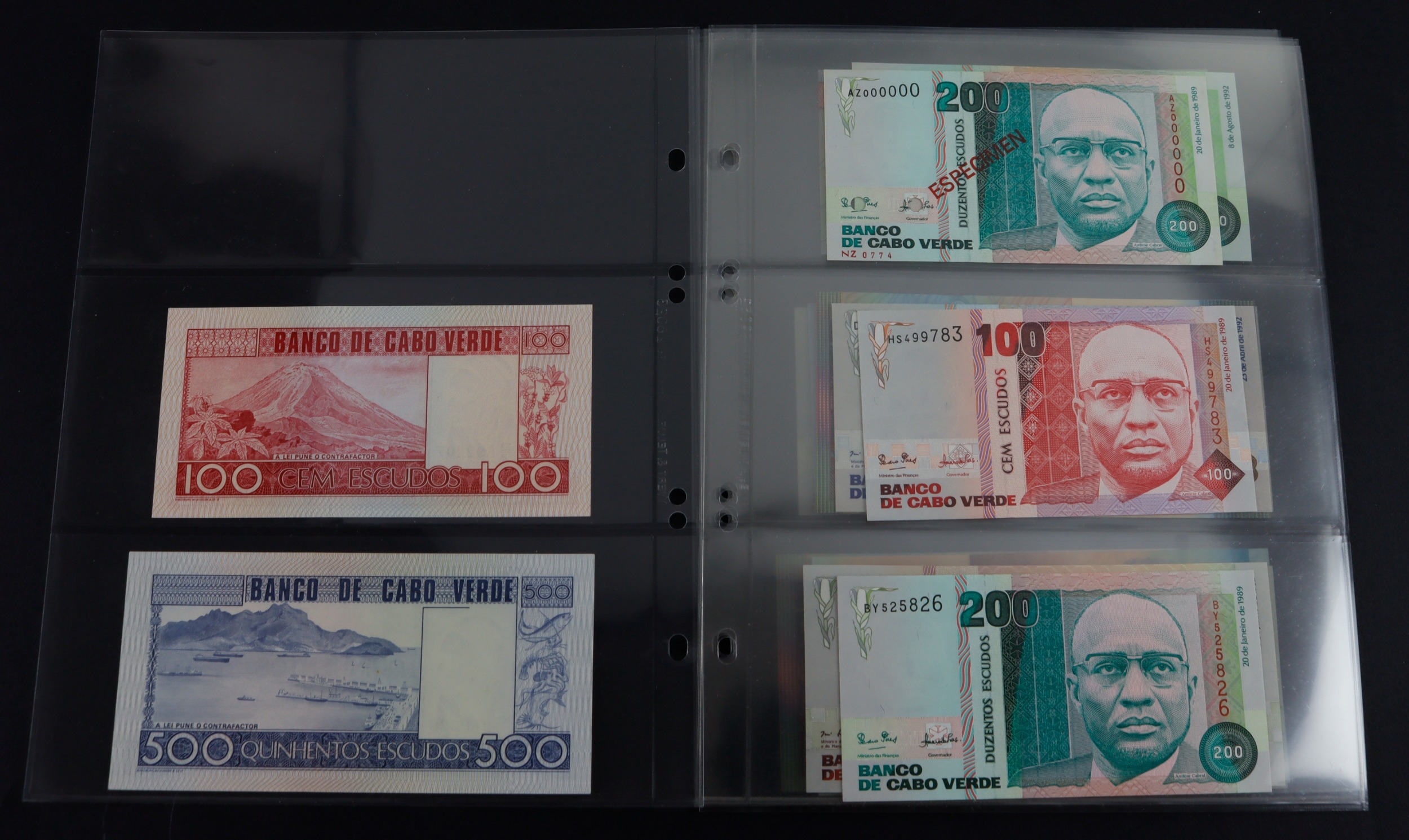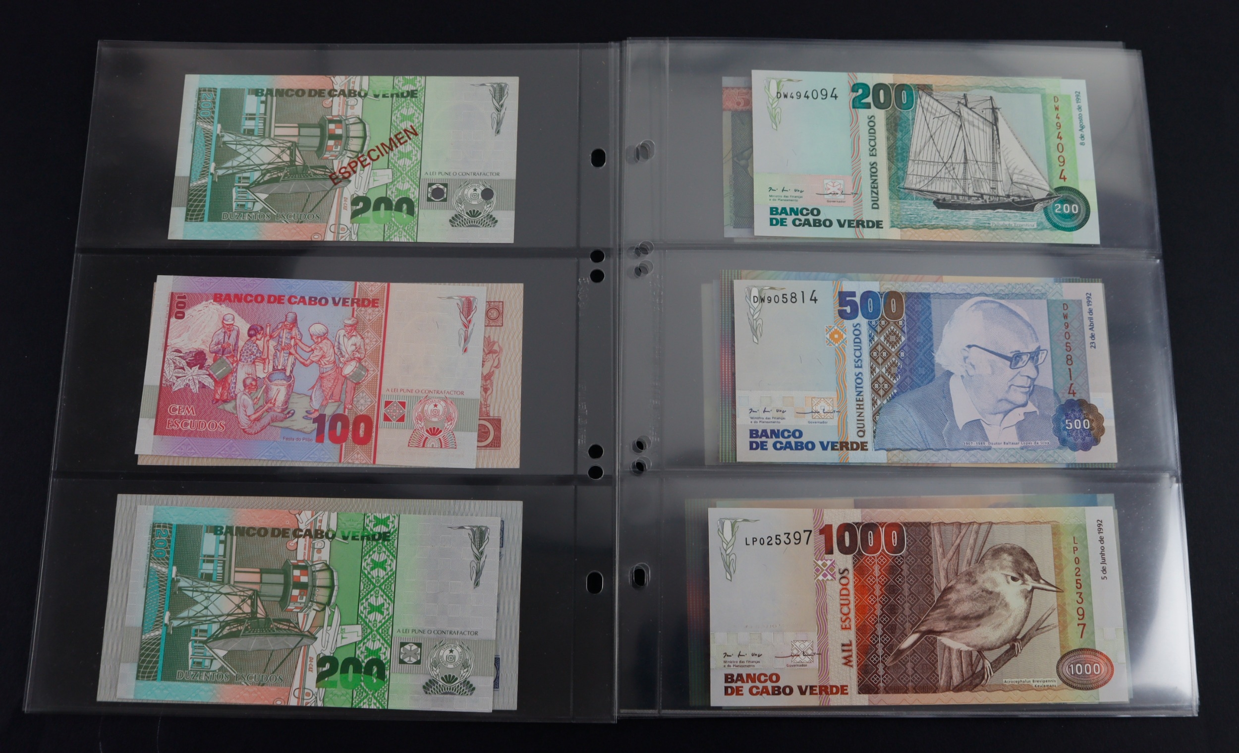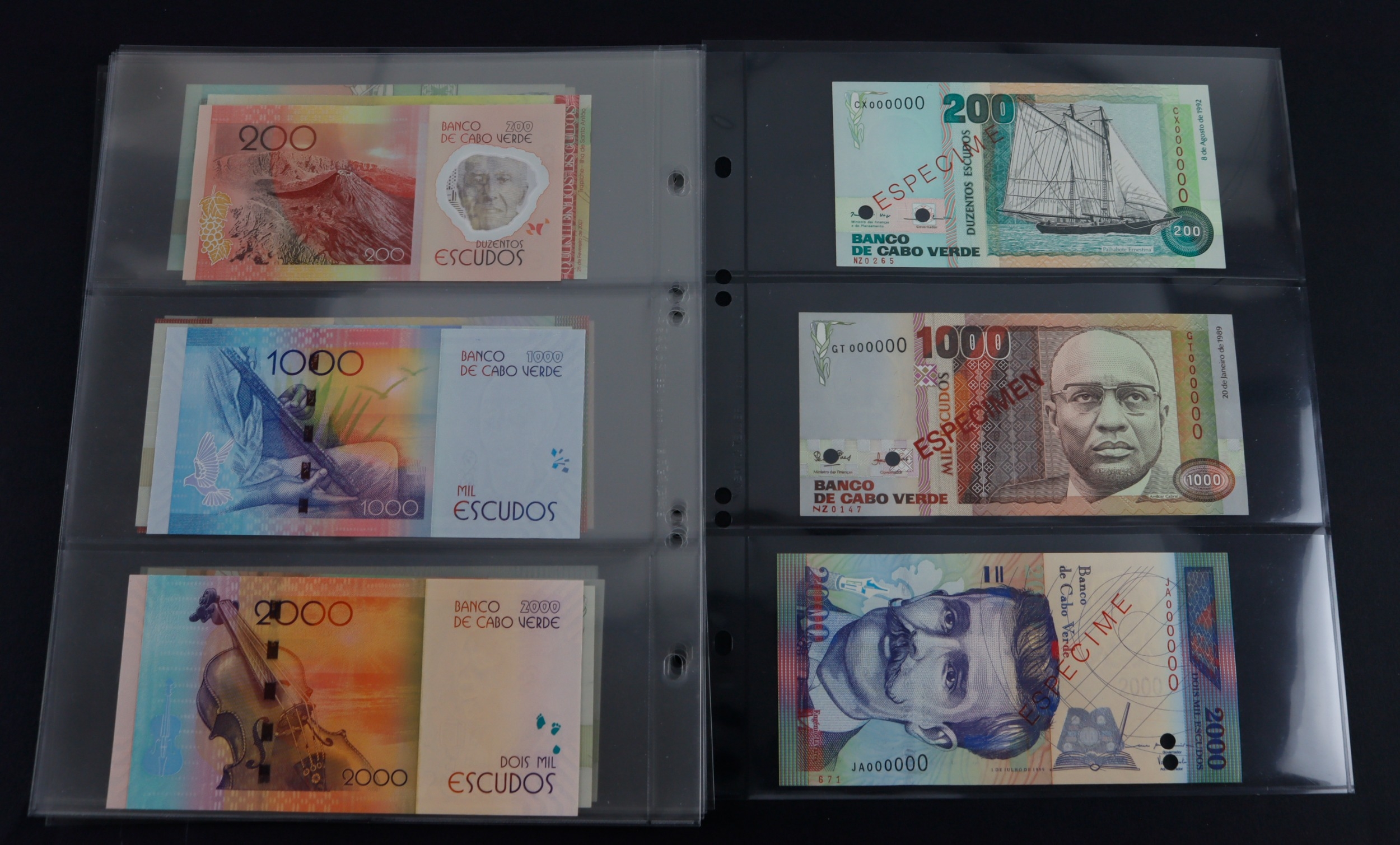 Cape Verde (19), a high grade group from 100 Escudos to 2000 Escudos, date range 1977 - 2024, including 4 x SPECIMEN notes, 2000 Escudos, 1000 Escudos dated 2024, 2000 Escudos dated 1999, all Uncirculated
