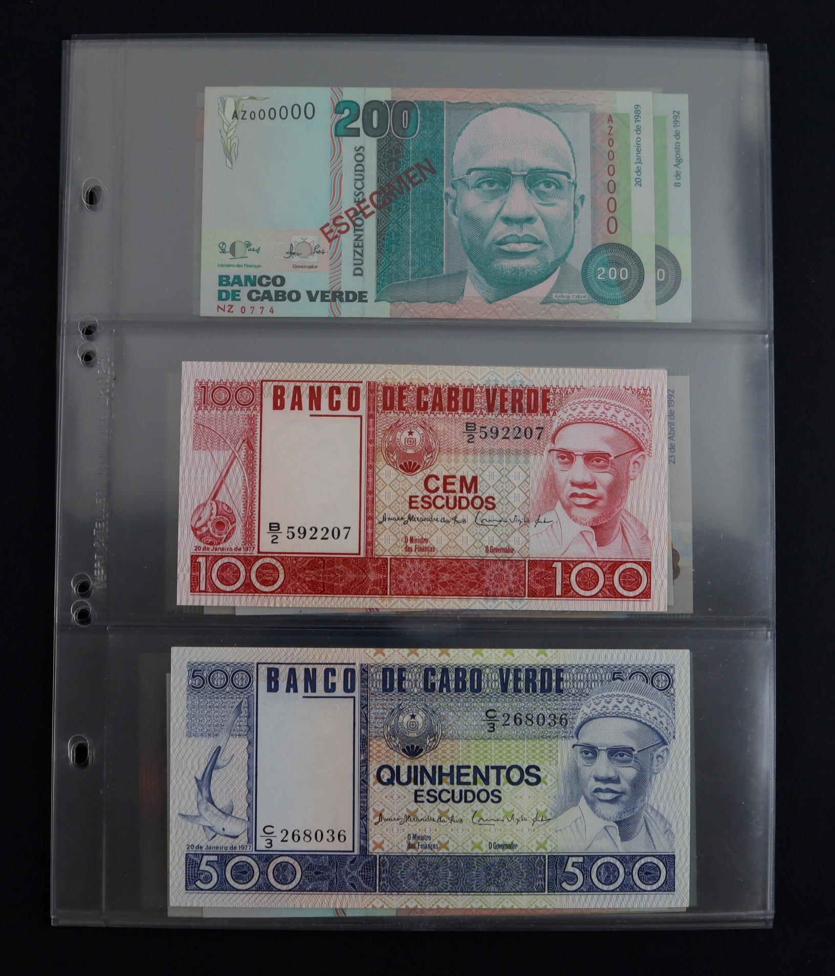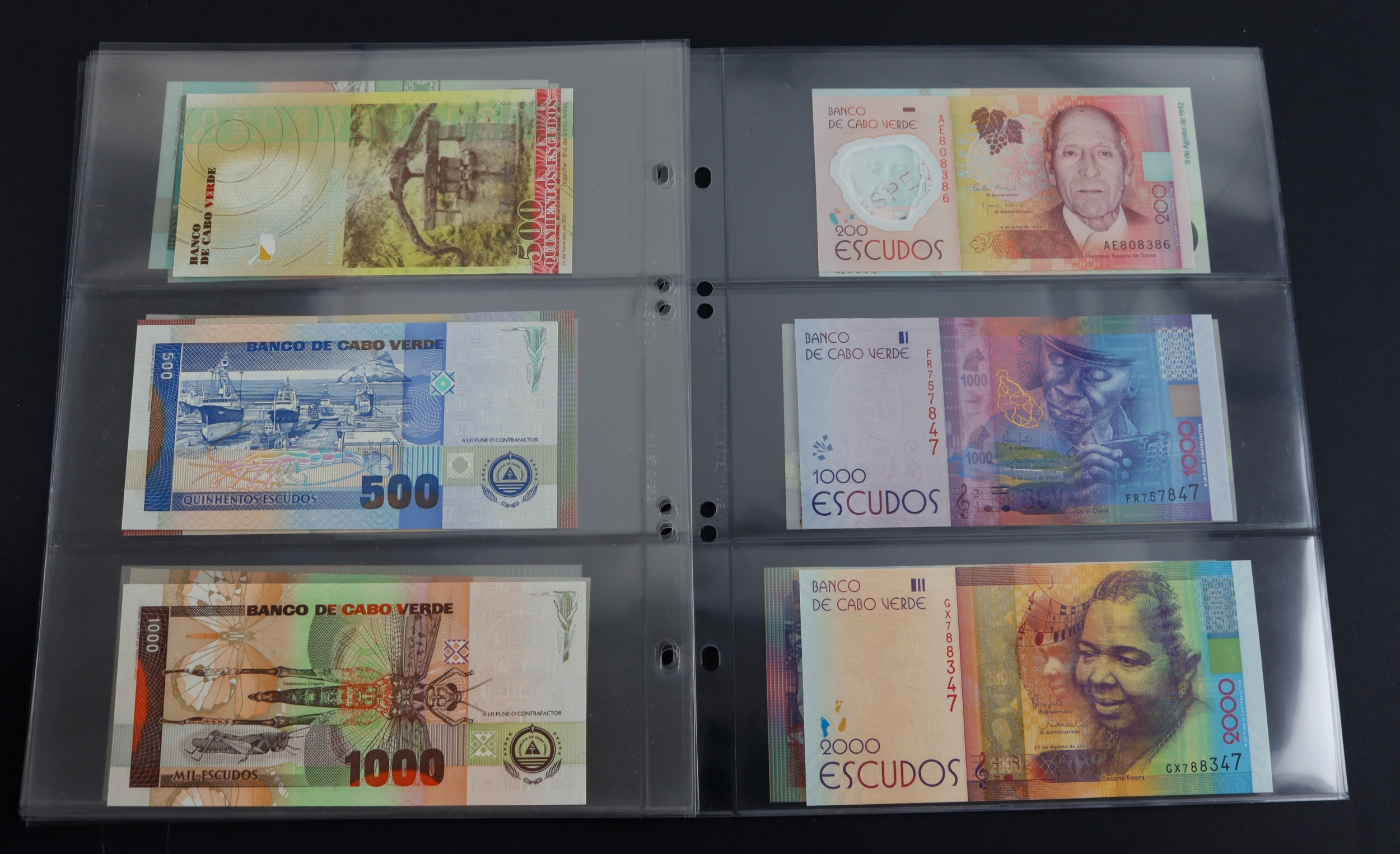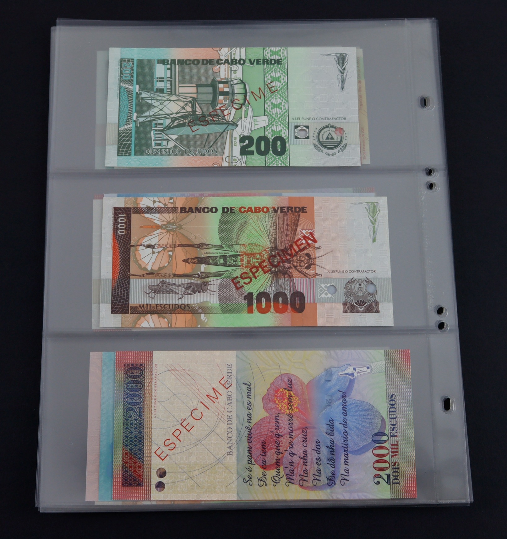Cape Verde (19), a high grade group from 100 Escudos to 2000 Escudos, date range 1977 - 2024, including 4 x SPECIMEN notes, 2000 Escudos, 1000 Escudos dated 2024, 2000 Escudos dated 1999, all Uncirculated
