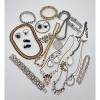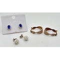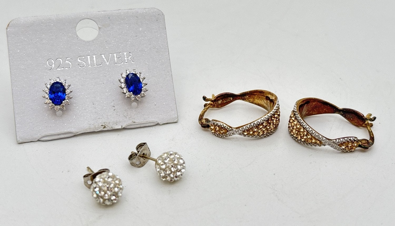 3 pairs of stone set silver earrings. A pair of silver gilt twist design hoops set with champagne coloured crystals; a pair of cluster style studs with central blue stone surrounded by clear stones; and a pair of clear crystal disco ball studs.