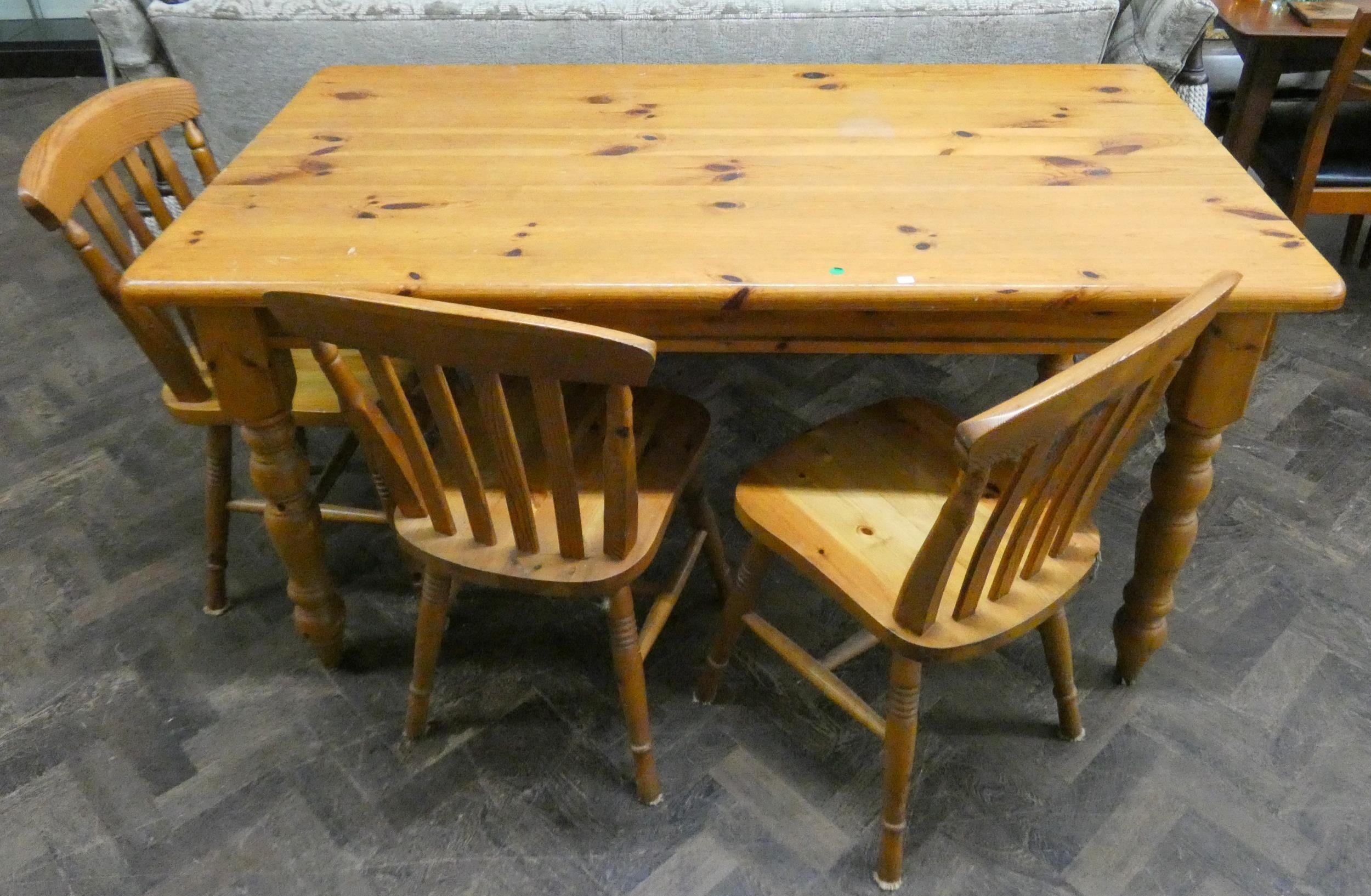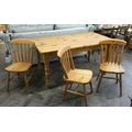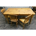 Modern varnished pine kitchen farmhouse table together with three chairs