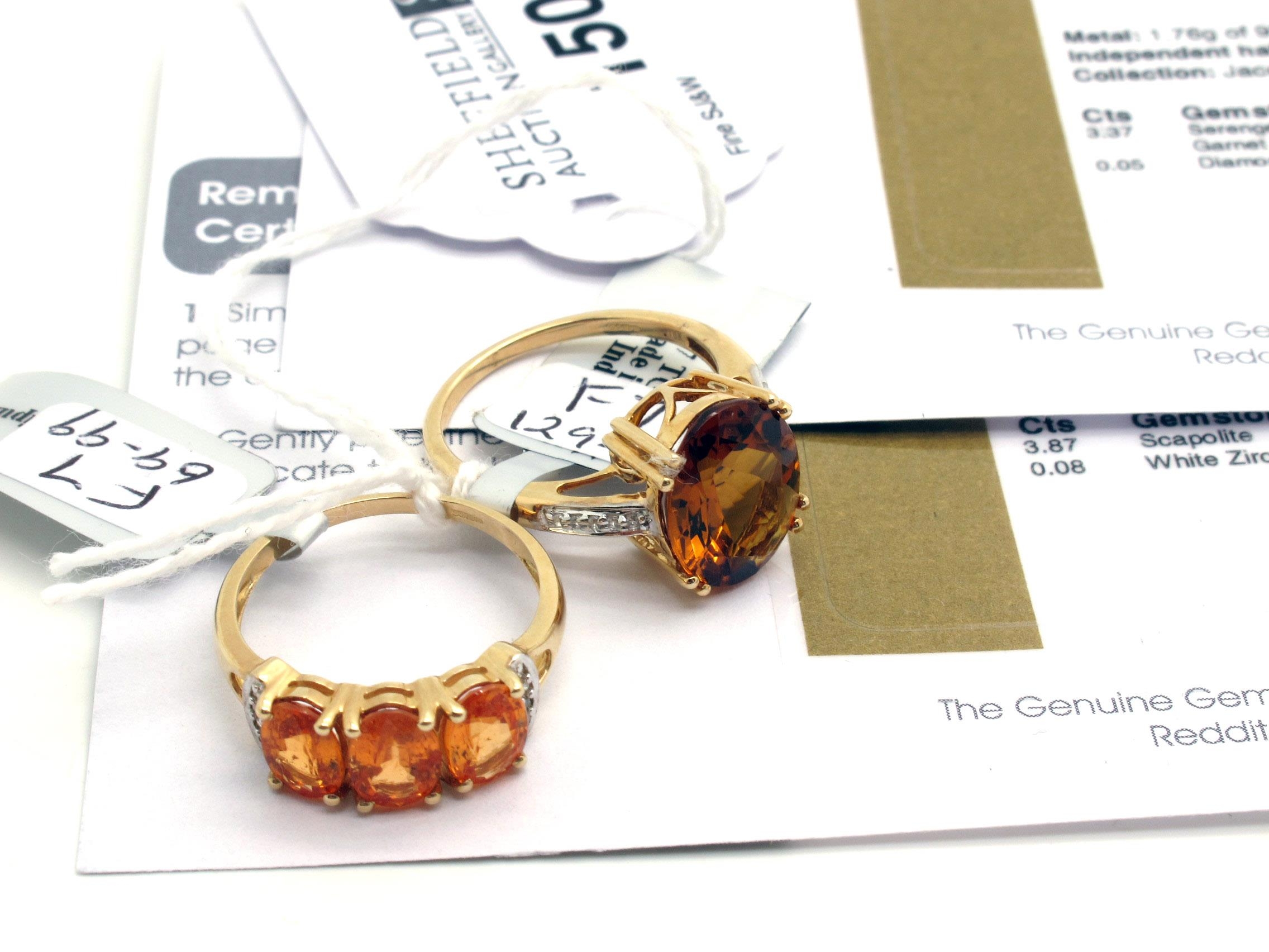 The Genuine Gemstone Company Ltd; A 9ct Gold Scapolite and White Zircon Dress Ring, claw set centre, between inset shoulders (finger size O), A 9 ct Gold Serengeti Spessartite Garnet and Diamond ring, three oval claw set stones, between inset bifurcated shoulders (finger size N 1/2) (total weight 5.5 grams) (2).