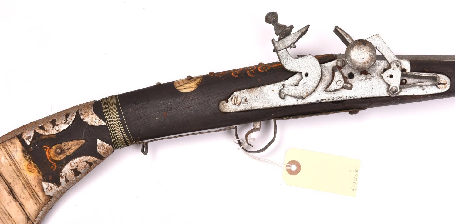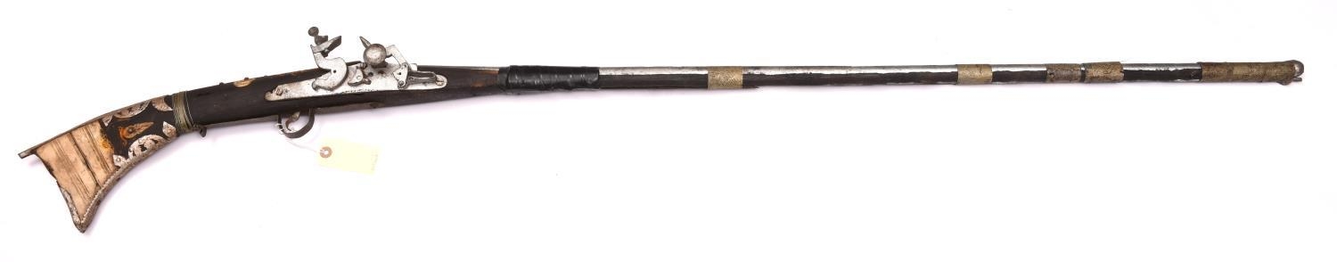 An Arab flintlock jezail, 60" overall, barrel 44½”, wood and bone stock, metal mounts GC (lock seized, some repair) £50-60