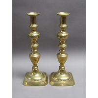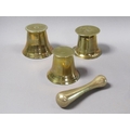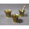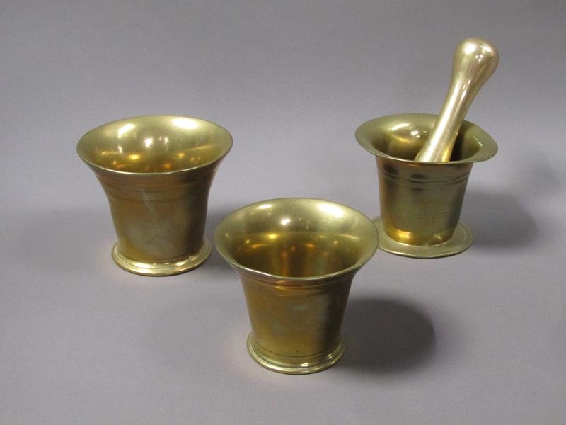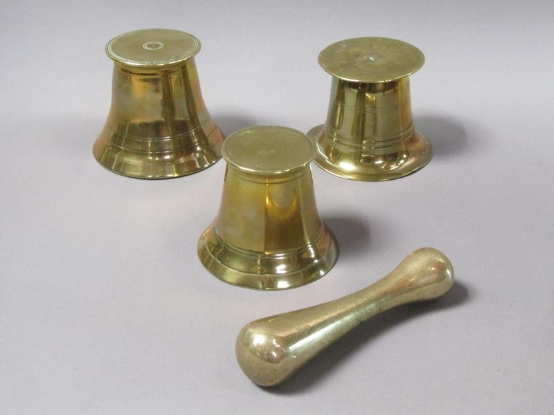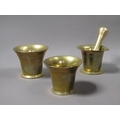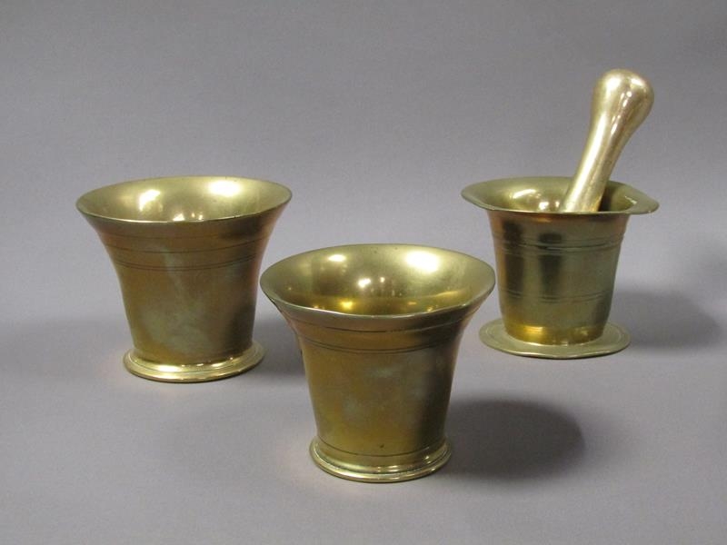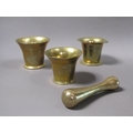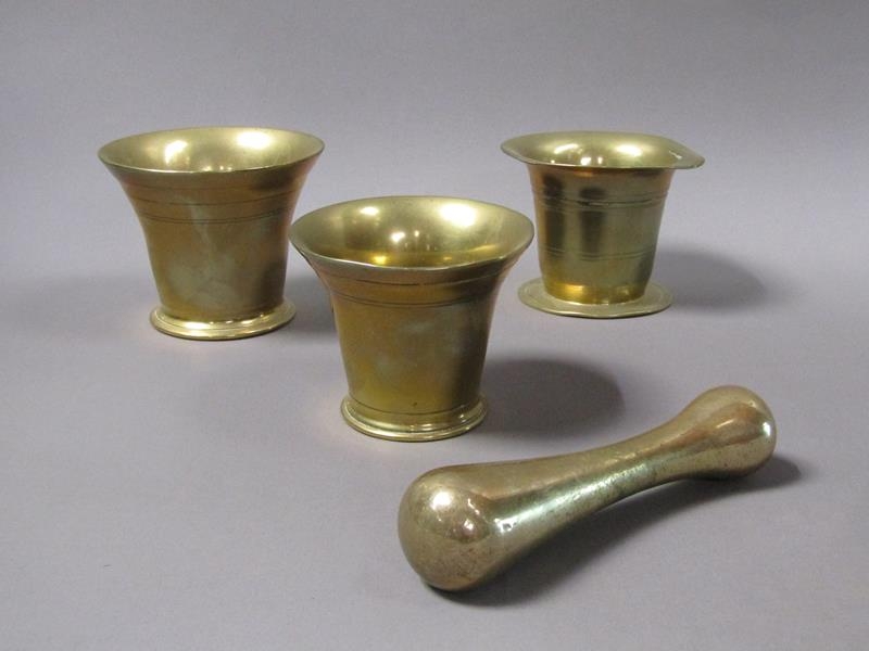 A late 18c/early 19c bronze mortars and a pestle, the mortars, 12.5cm, 13cm & 14cm diam mouths, and each approx 11.5cm h, the pestle 20cm l.