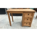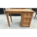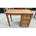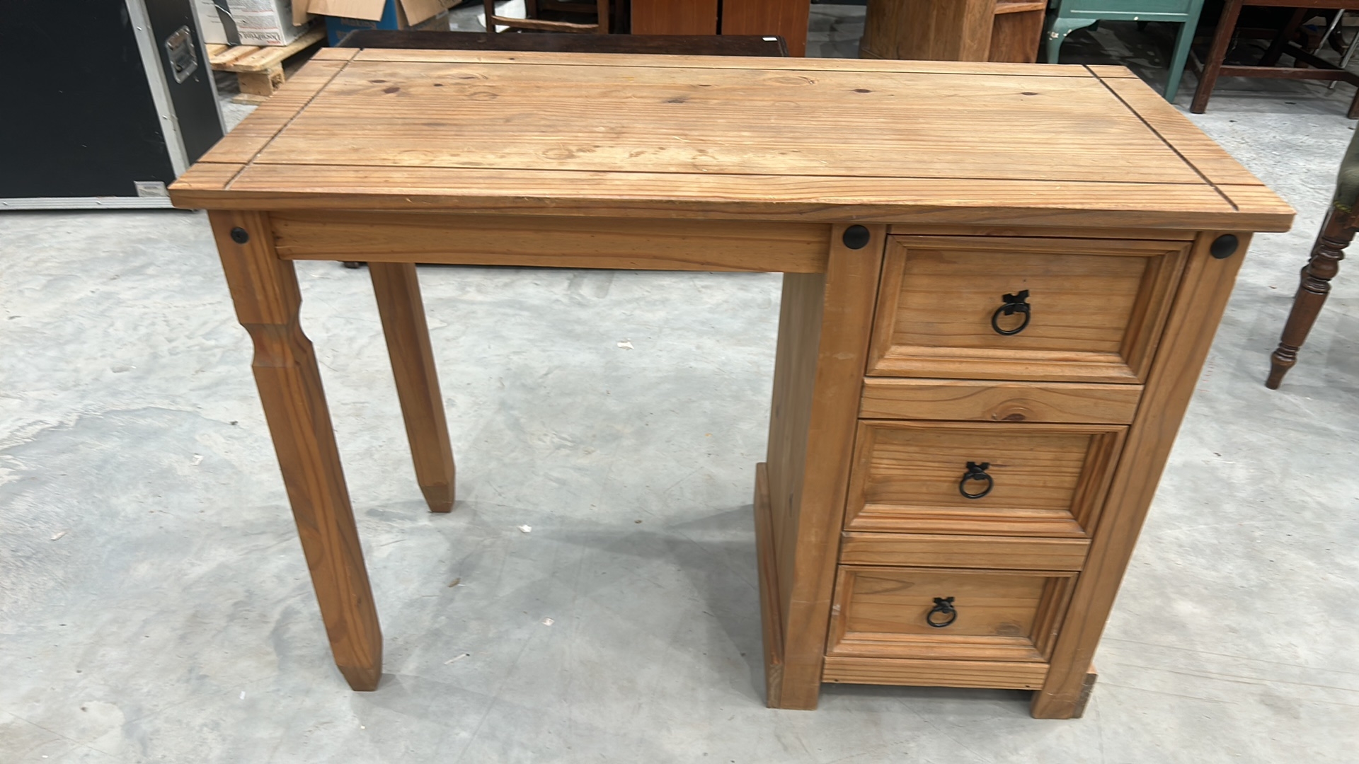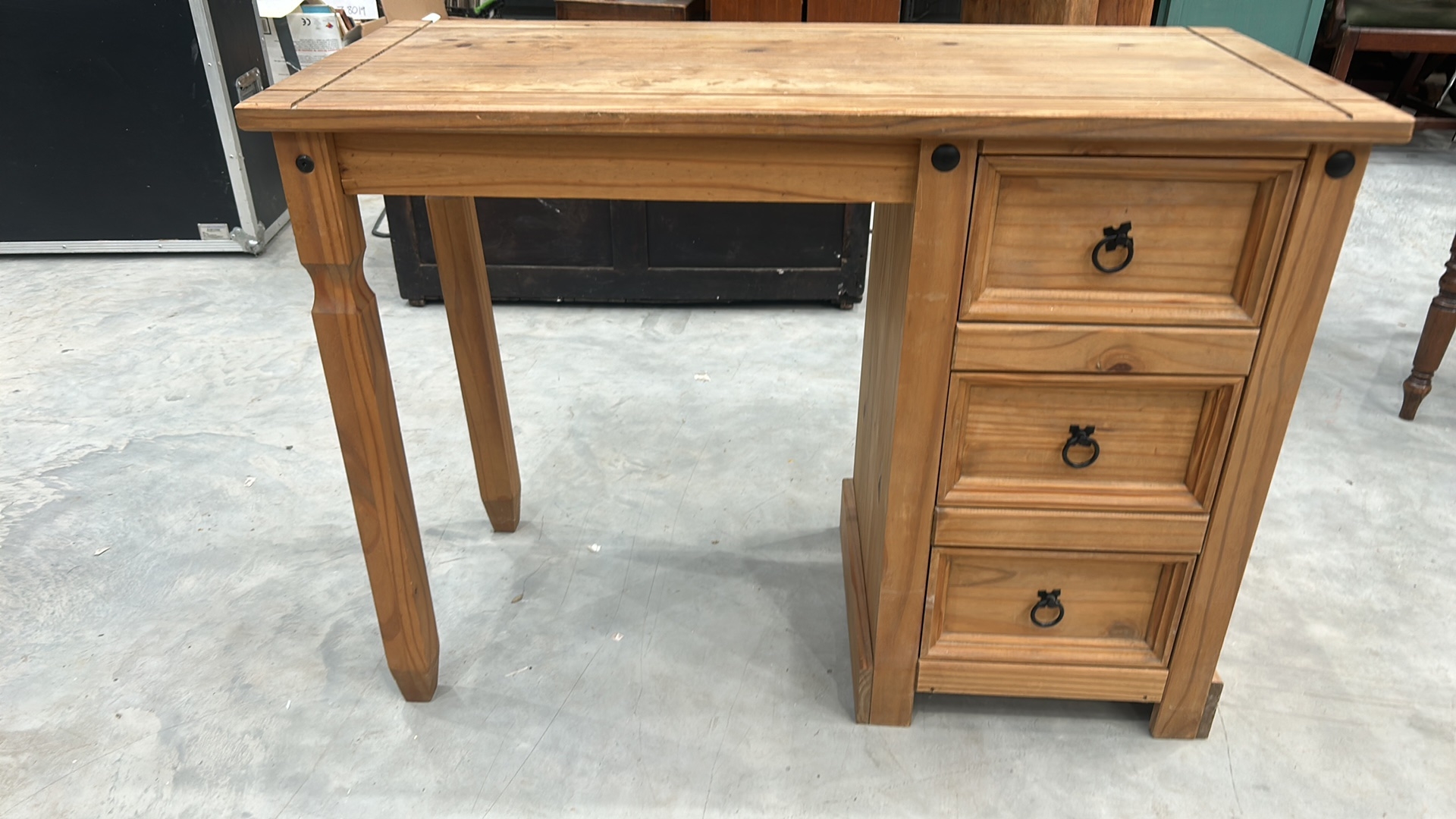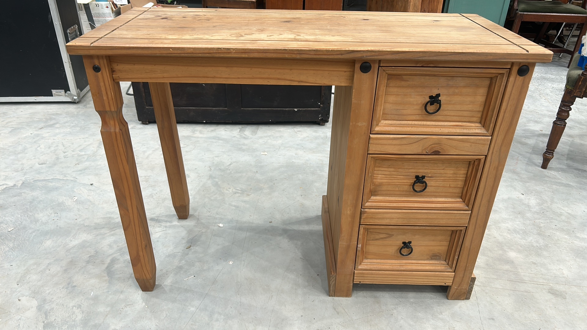 Small pine single-pedestal desk with plank top, one shaped front leg and three drawers fitted with black metal ring pulls.