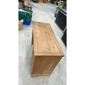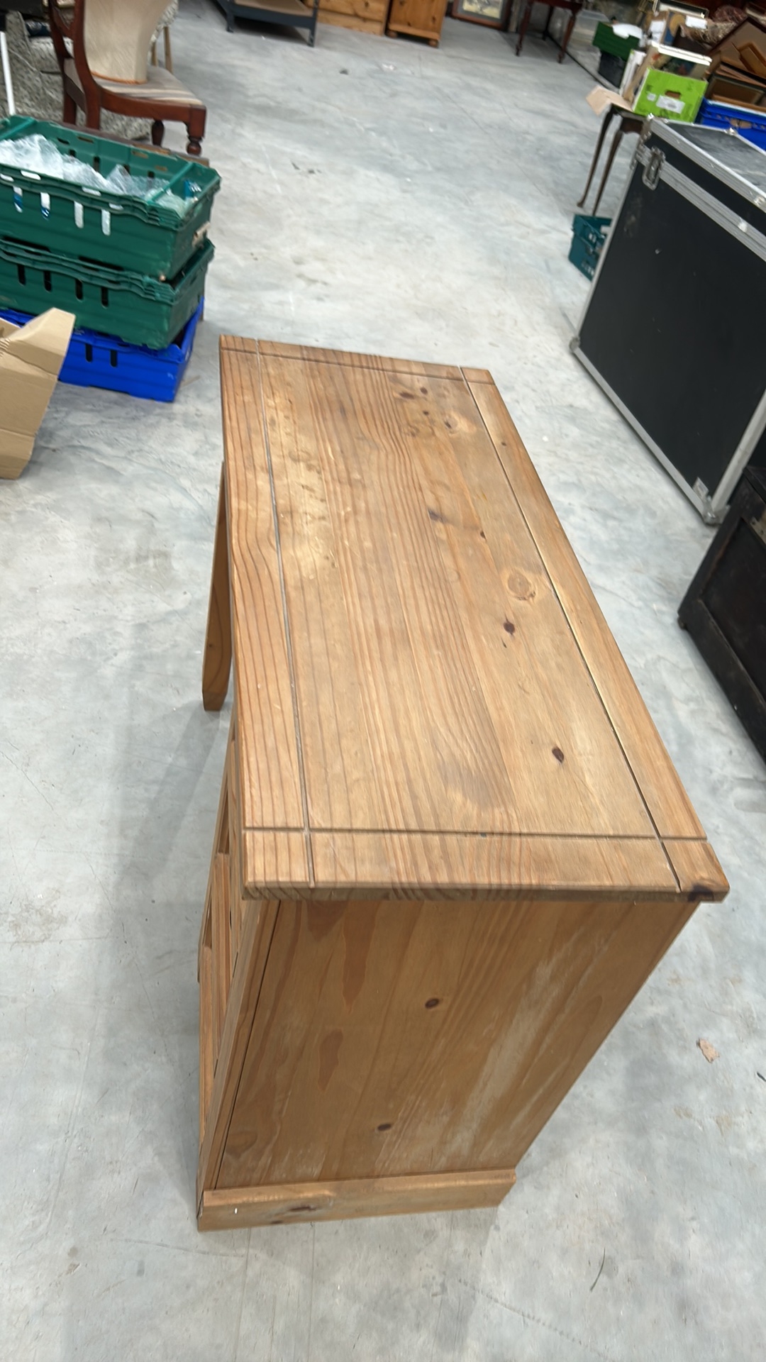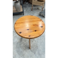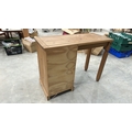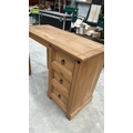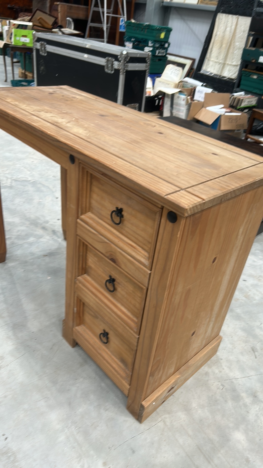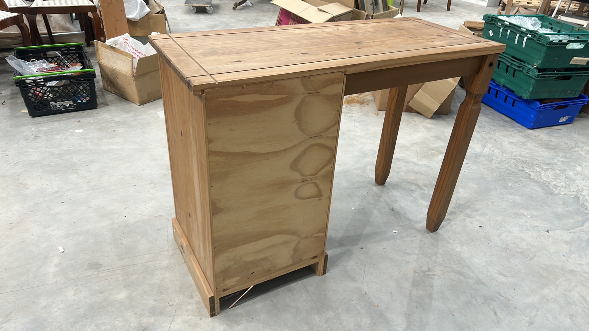 Small pine single-pedestal desk with plank top, one shaped front leg and three drawers fitted with black metal ring pulls.