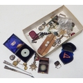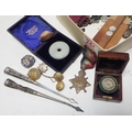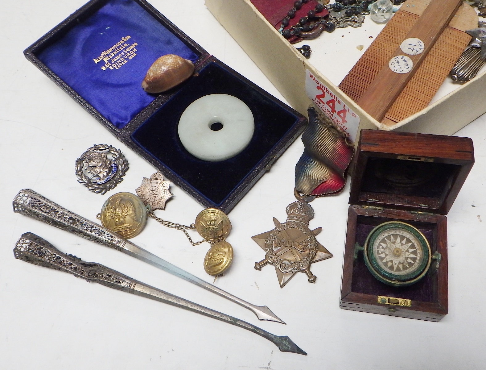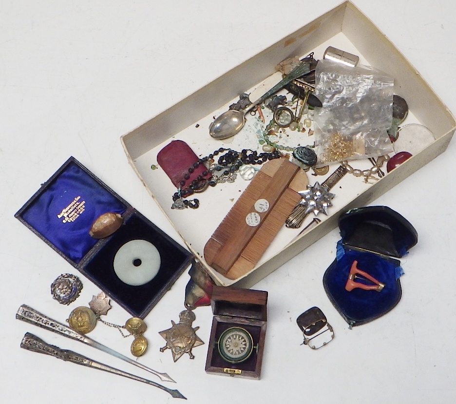A Victorian miniature hardwood cased gimballed compass, ex affects of a WW2 RAAF serviceman, possible bomber command casualty, A/F; a British WW1 1914-15 Star 422 Gnr J Pattison RGA; various badges, white metal fragments, costume jewellery etc