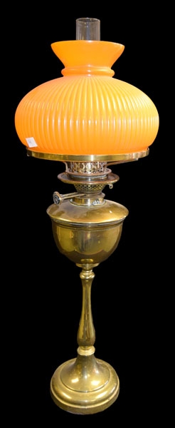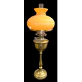 A Tall Brass Pillar Oil Lamp, Etched Shade