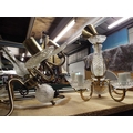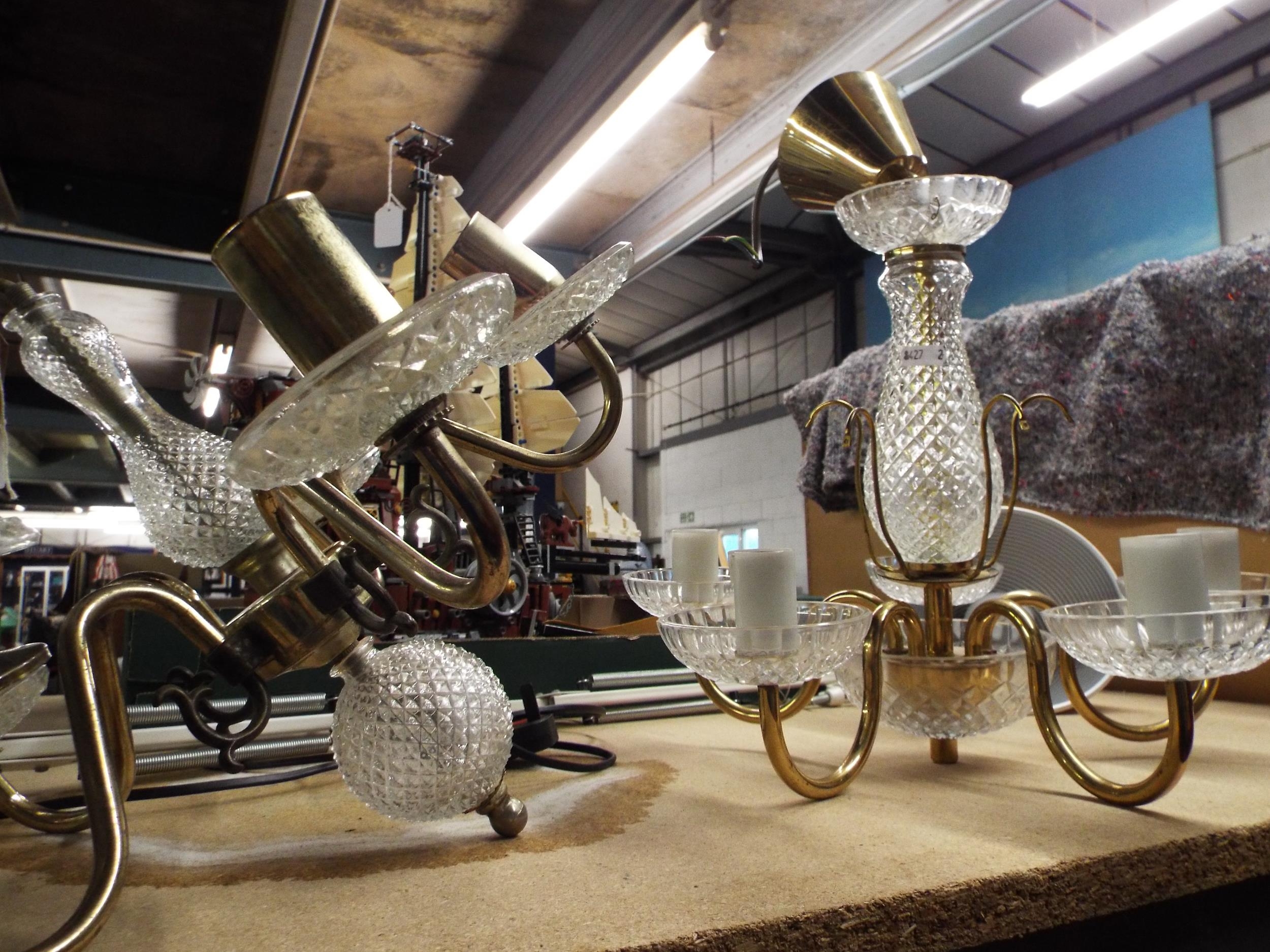 Two brass and glass five branch chandeliers