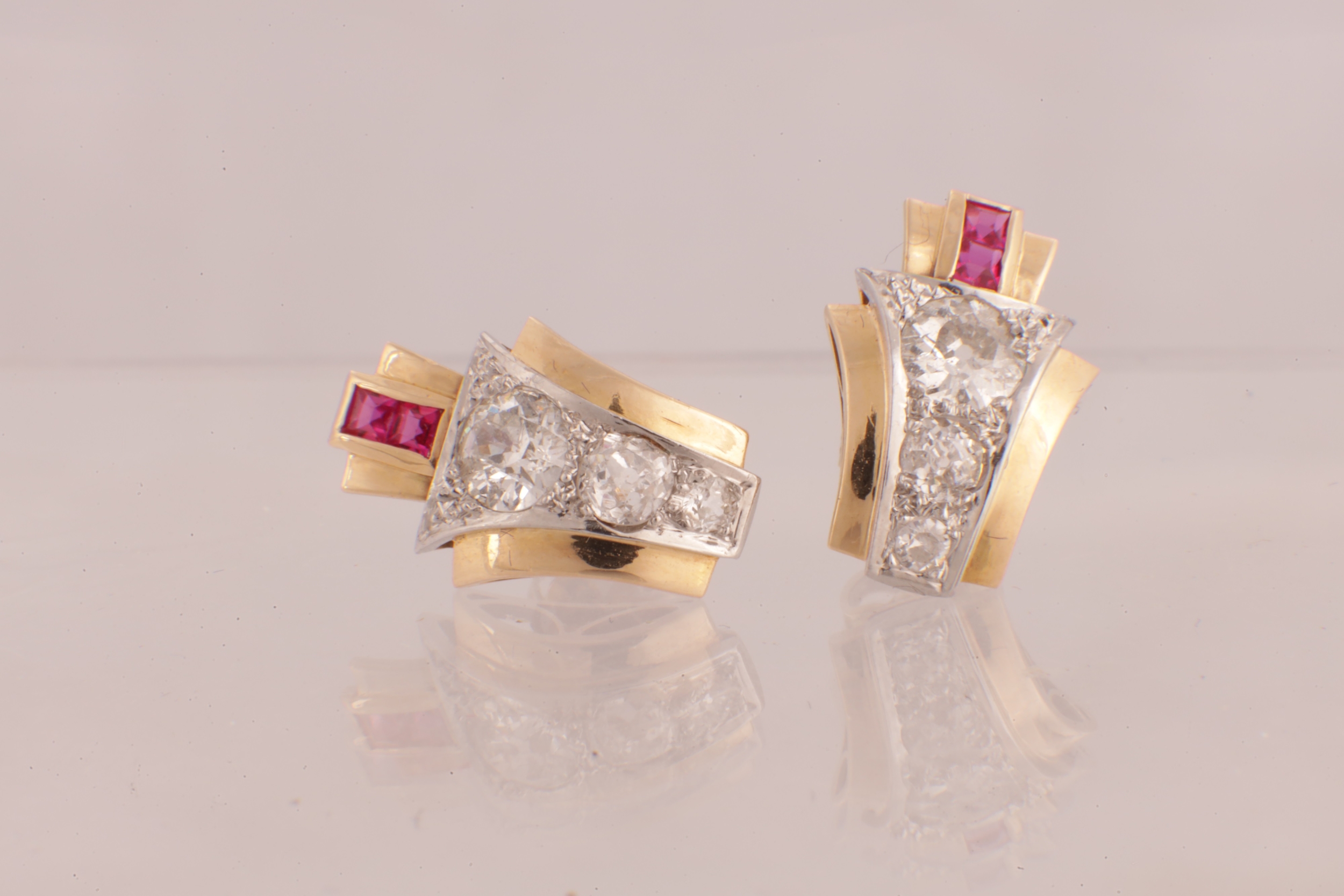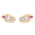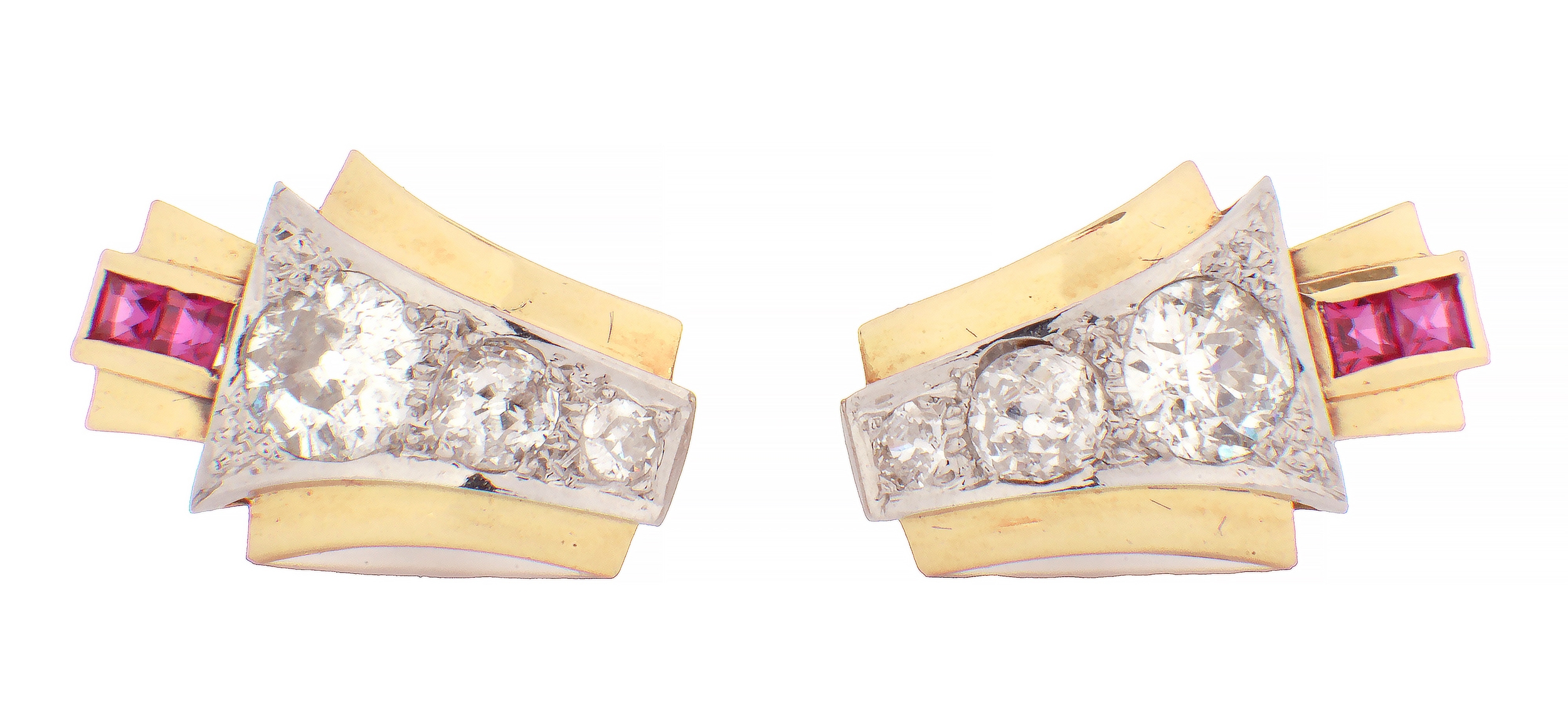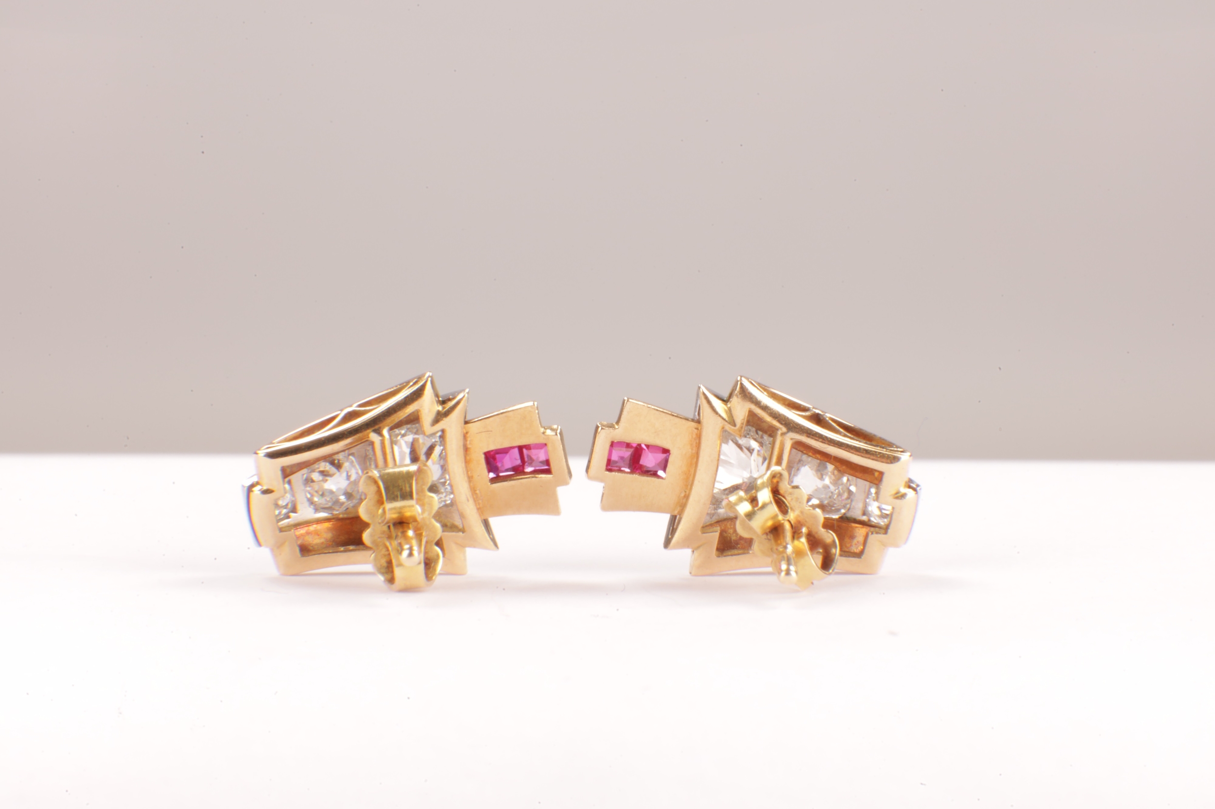 A PAIR OF ART DECO 18CT GOLD RUBY AND DIAMOND STUD EARRINGS, each having a chevron-shaped curved body with a white gold setting set with graduated Victorian cut diamonds below two square cut rubies, 1.7ct of diamonds. Total weight app. 4.8g. - comes with insurance valuation. (18mm high )