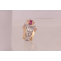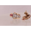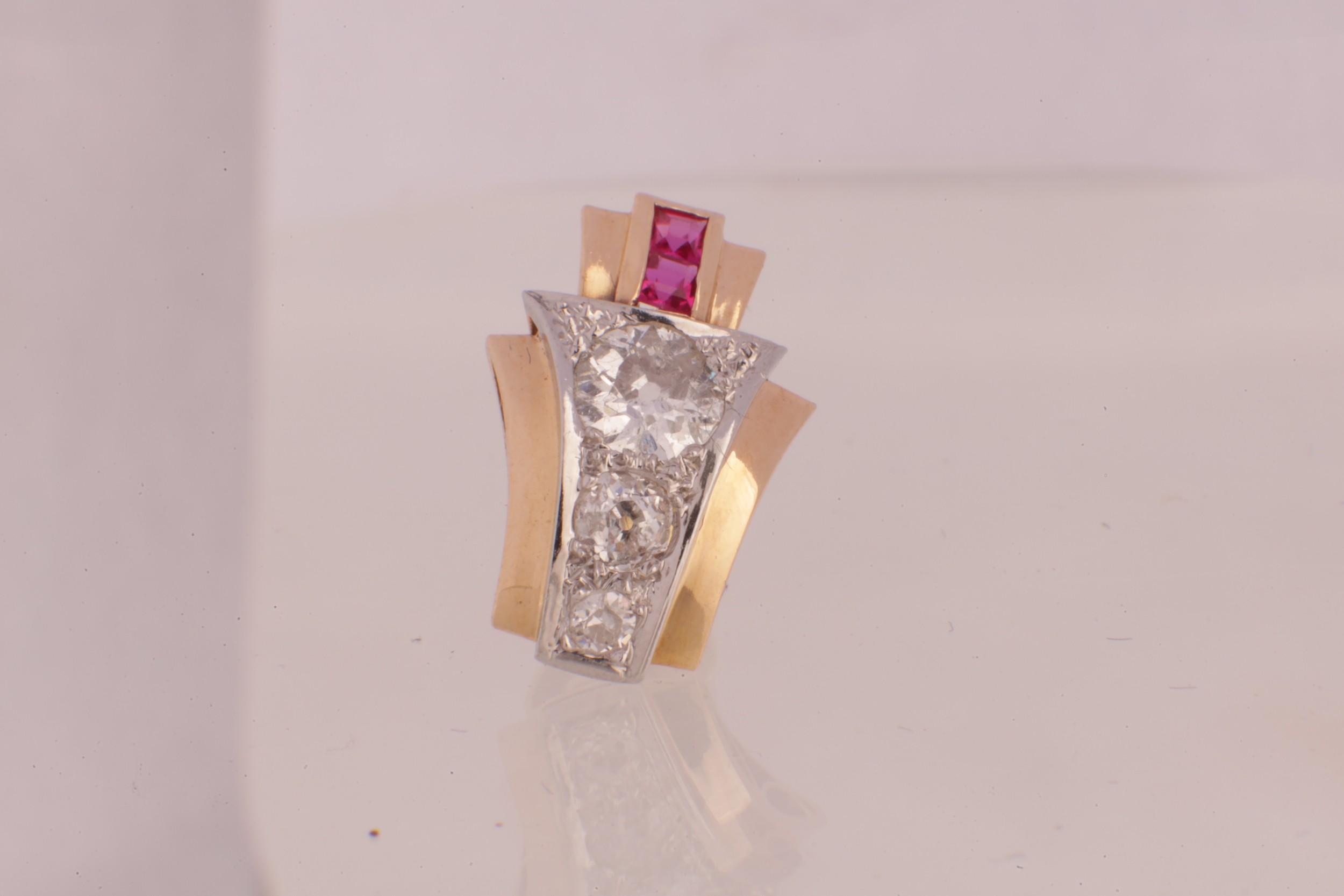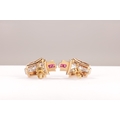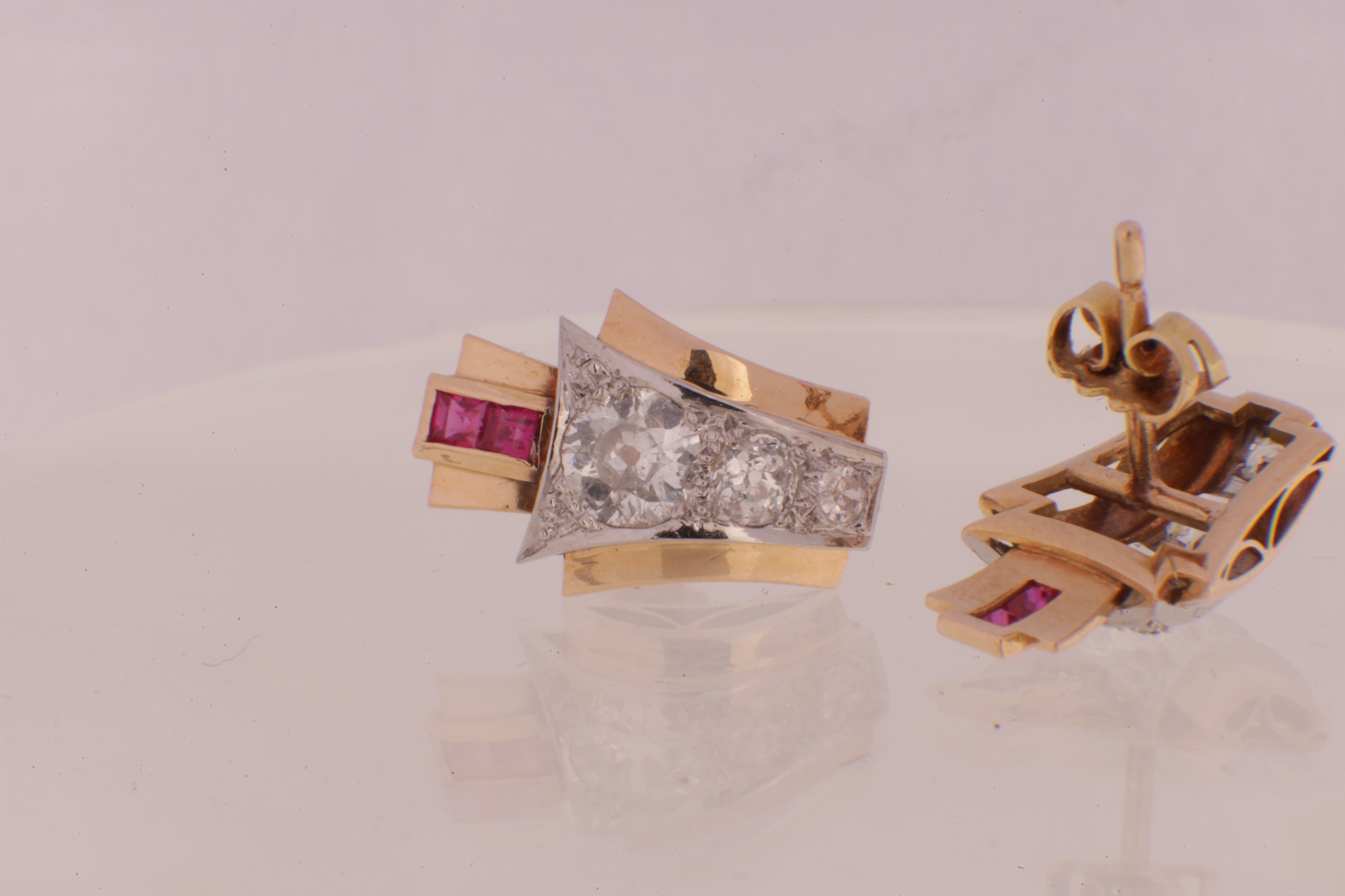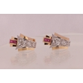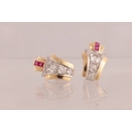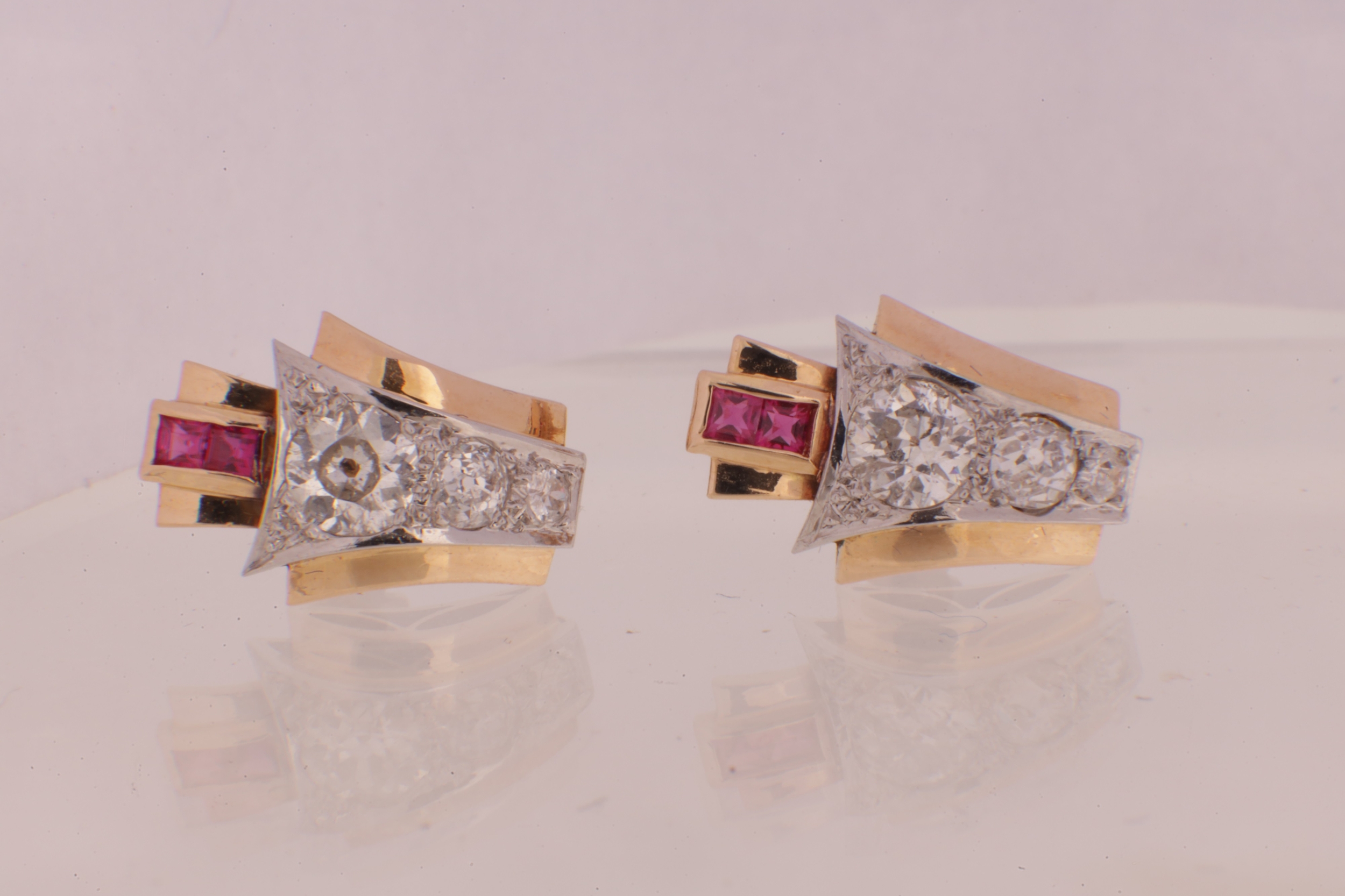 A PAIR OF ART DECO 18CT GOLD RUBY AND DIAMOND STUD EARRINGS, each having a chevron-shaped curved body with a white gold setting set with graduated Victorian cut diamonds below two square cut rubies, 1.7ct of diamonds. Total weight app. 4.8g. - comes with insurance valuation. (18mm high )