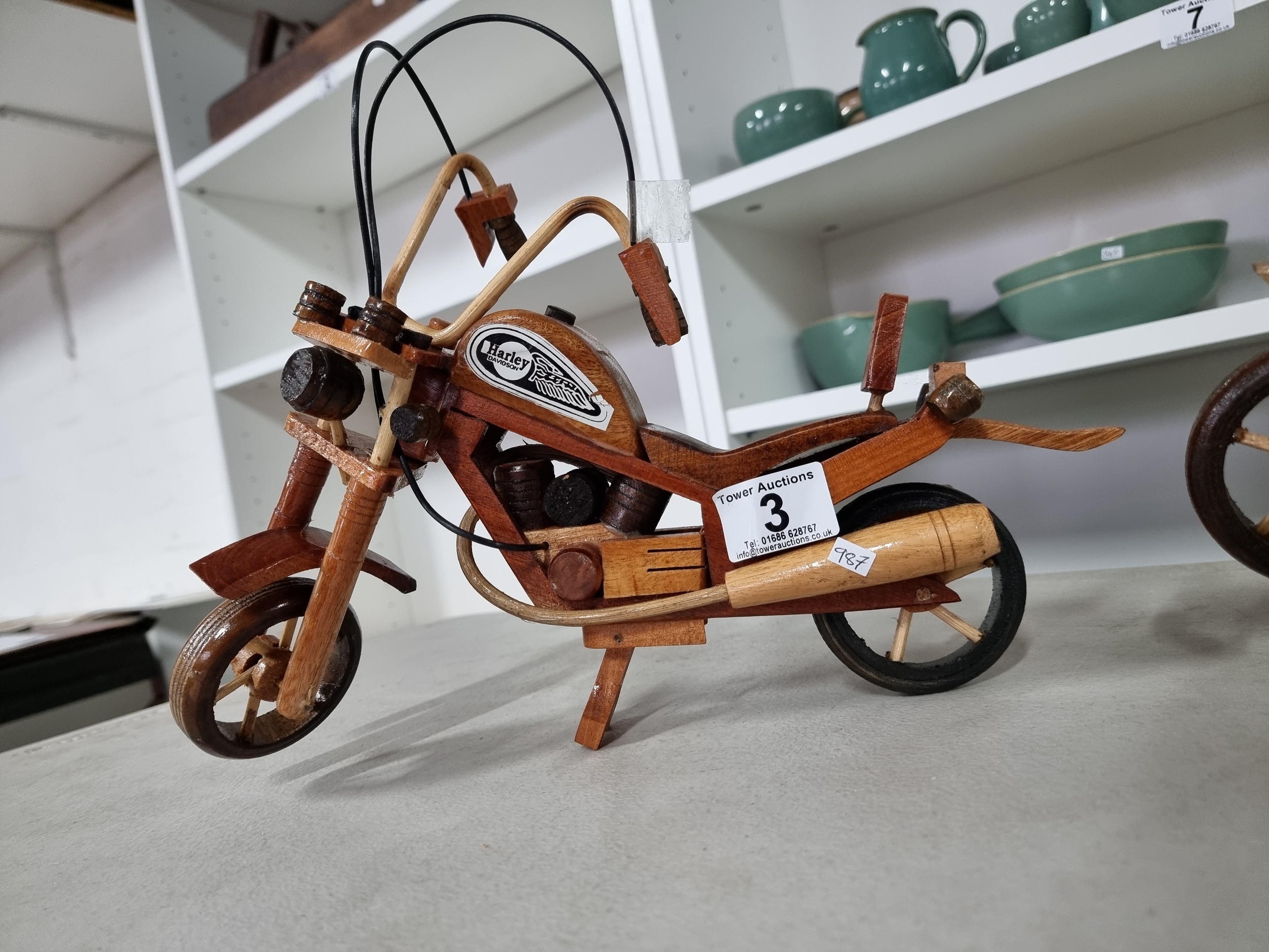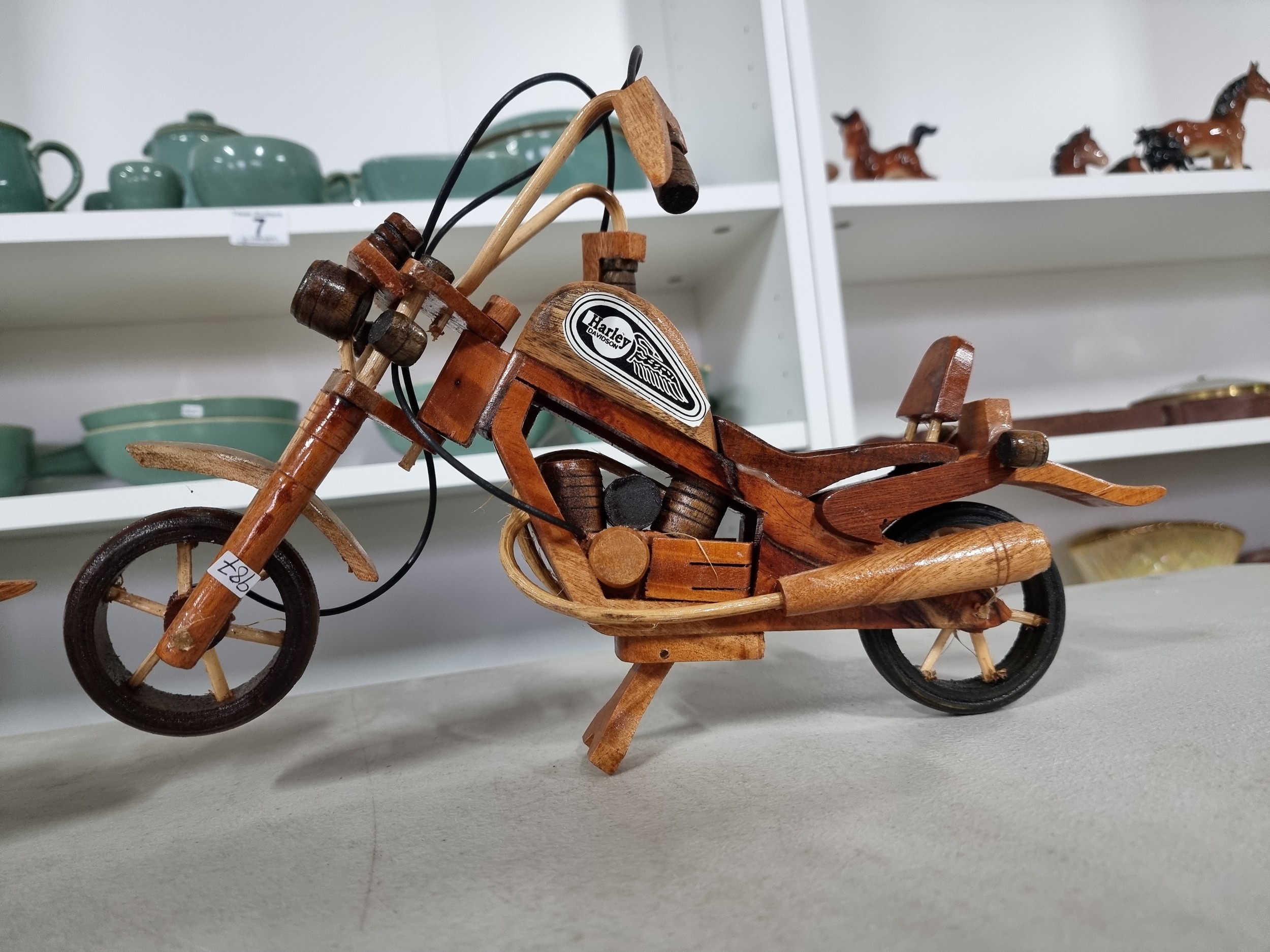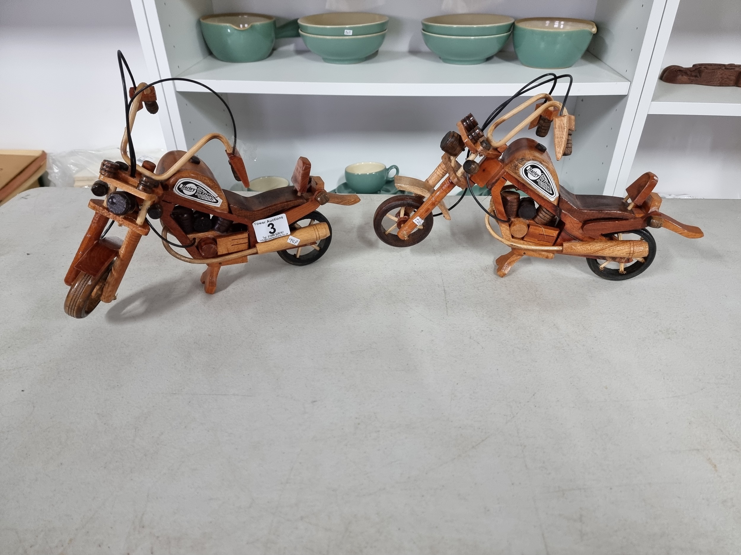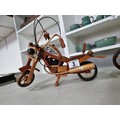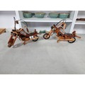 2 well made wooden Harley Davidson motorbike figures both in good order. Have a height of 22cm and a length of 36cm.