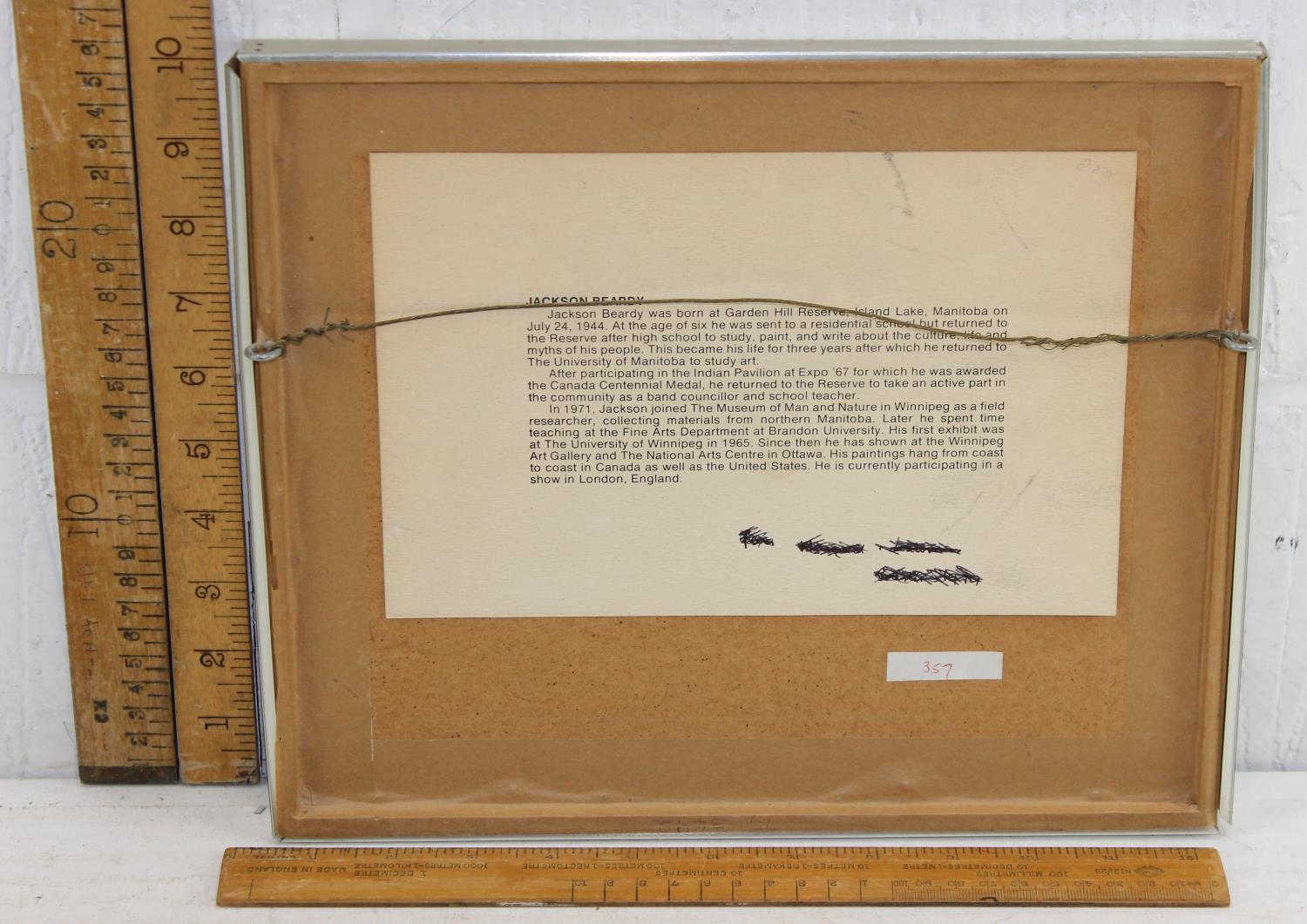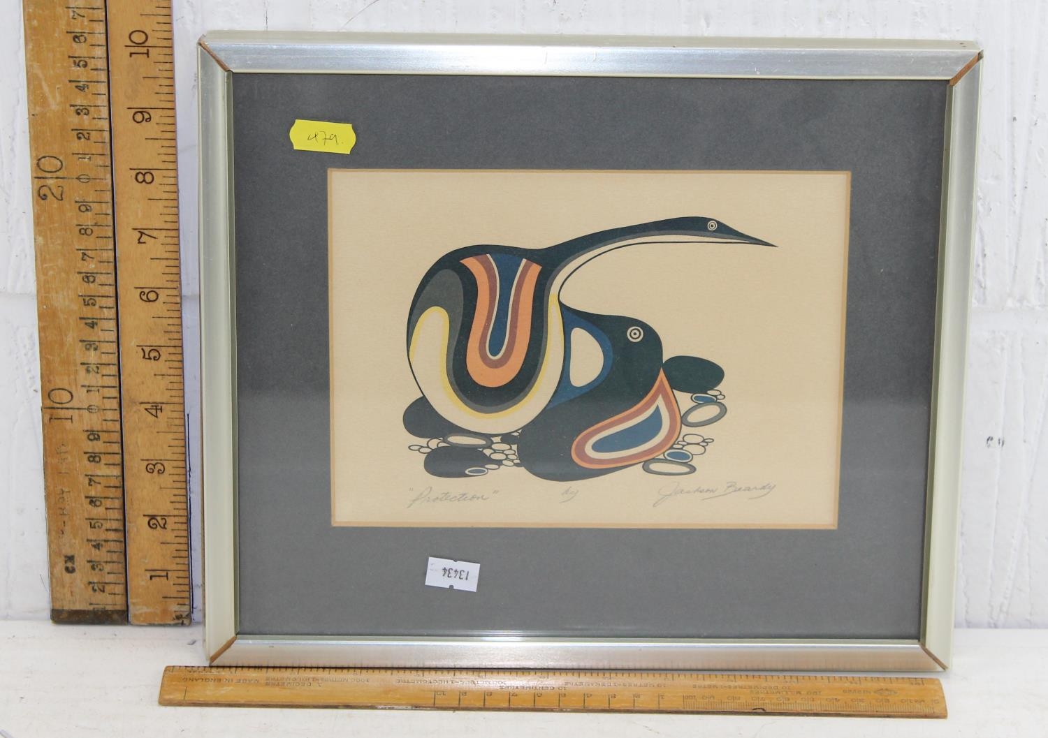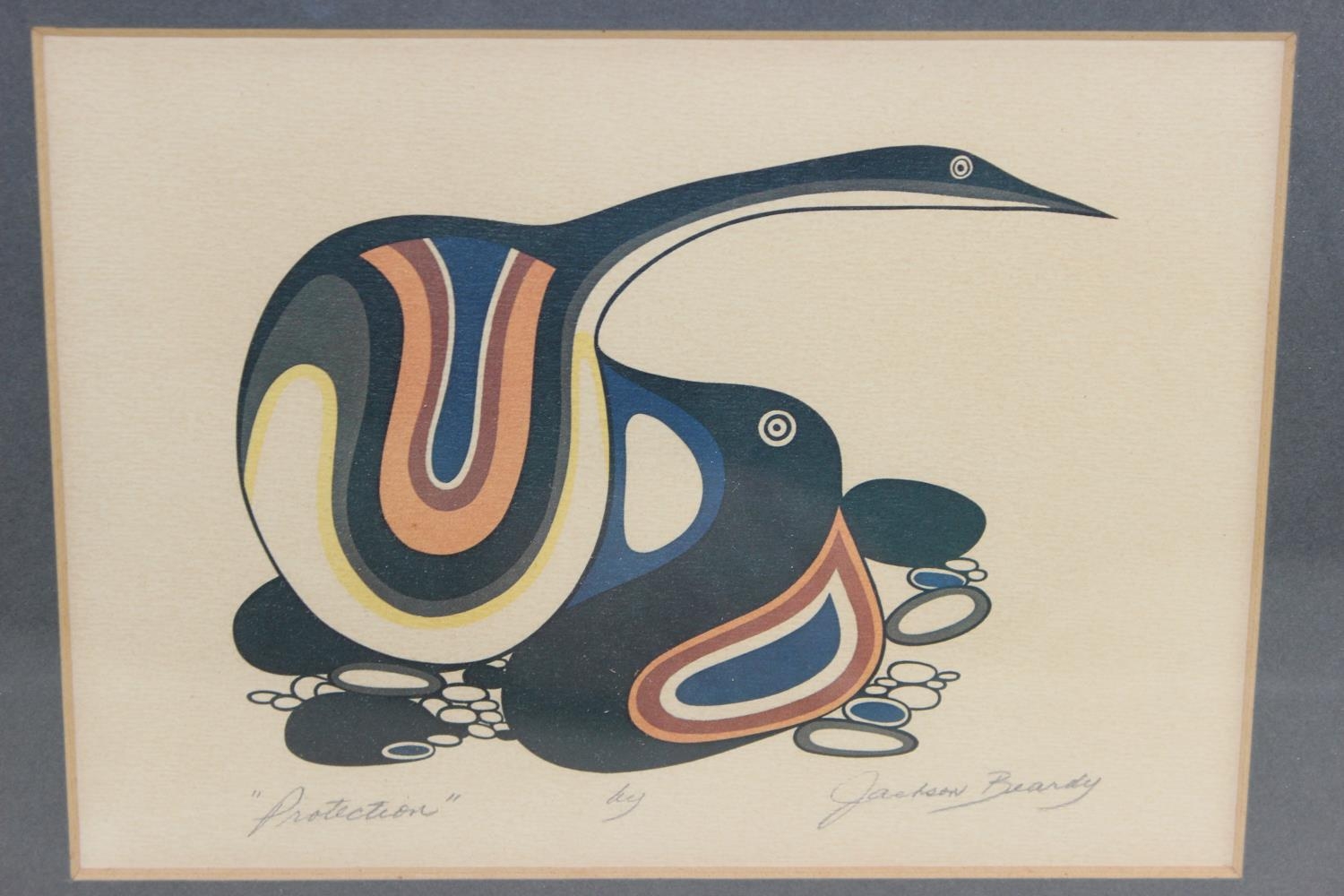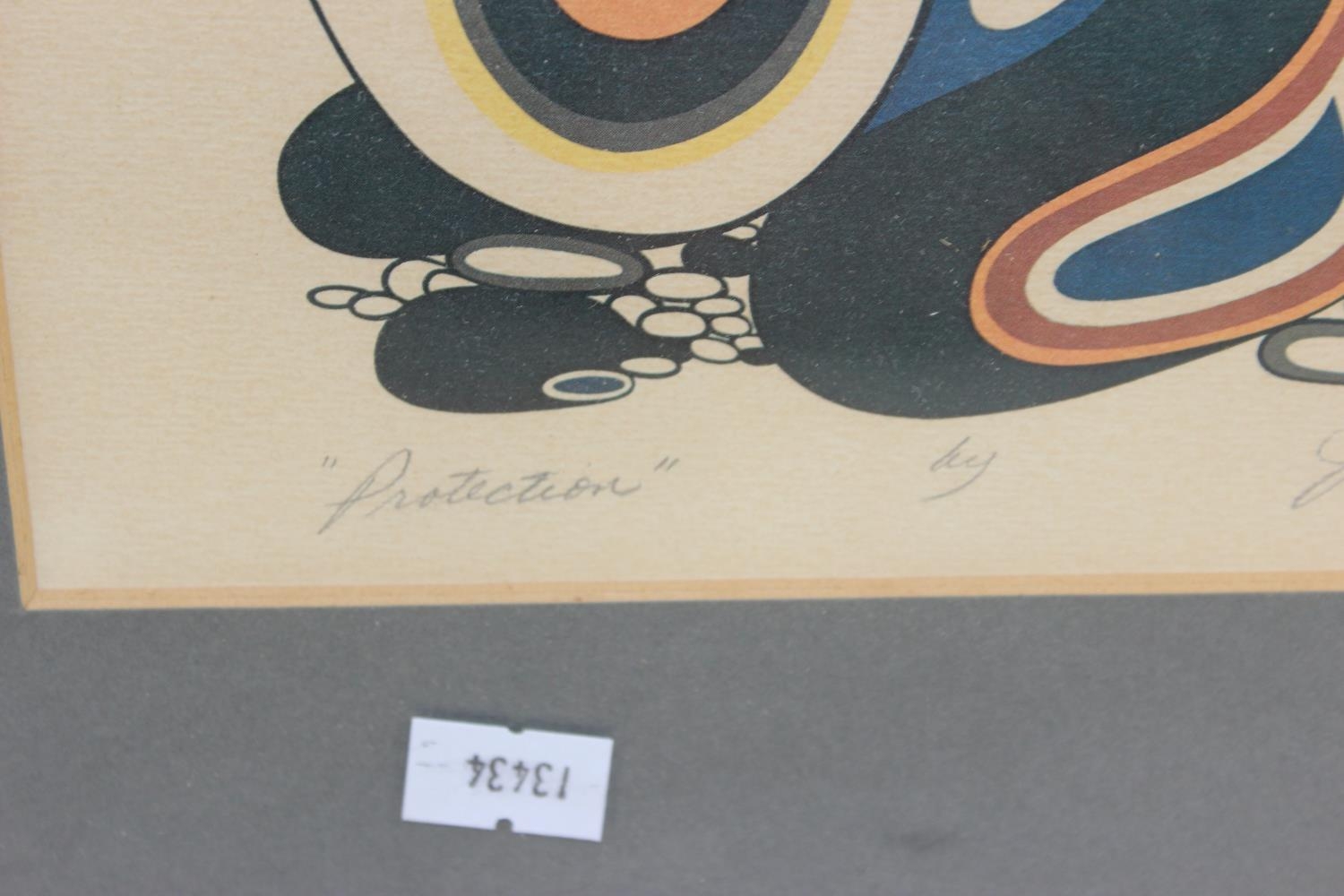 An interesting screenprint titled 'Protection' bearing the signature of Indigenous Canadian artist Jackson Beardie, signed lower right with information label to the back.