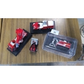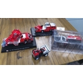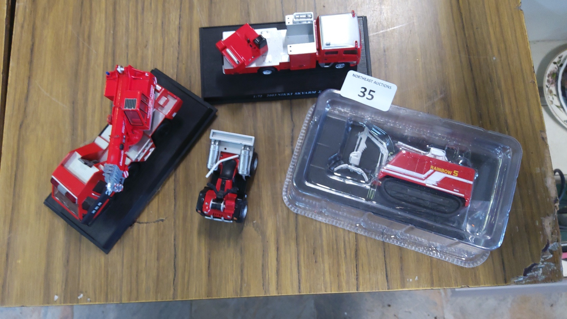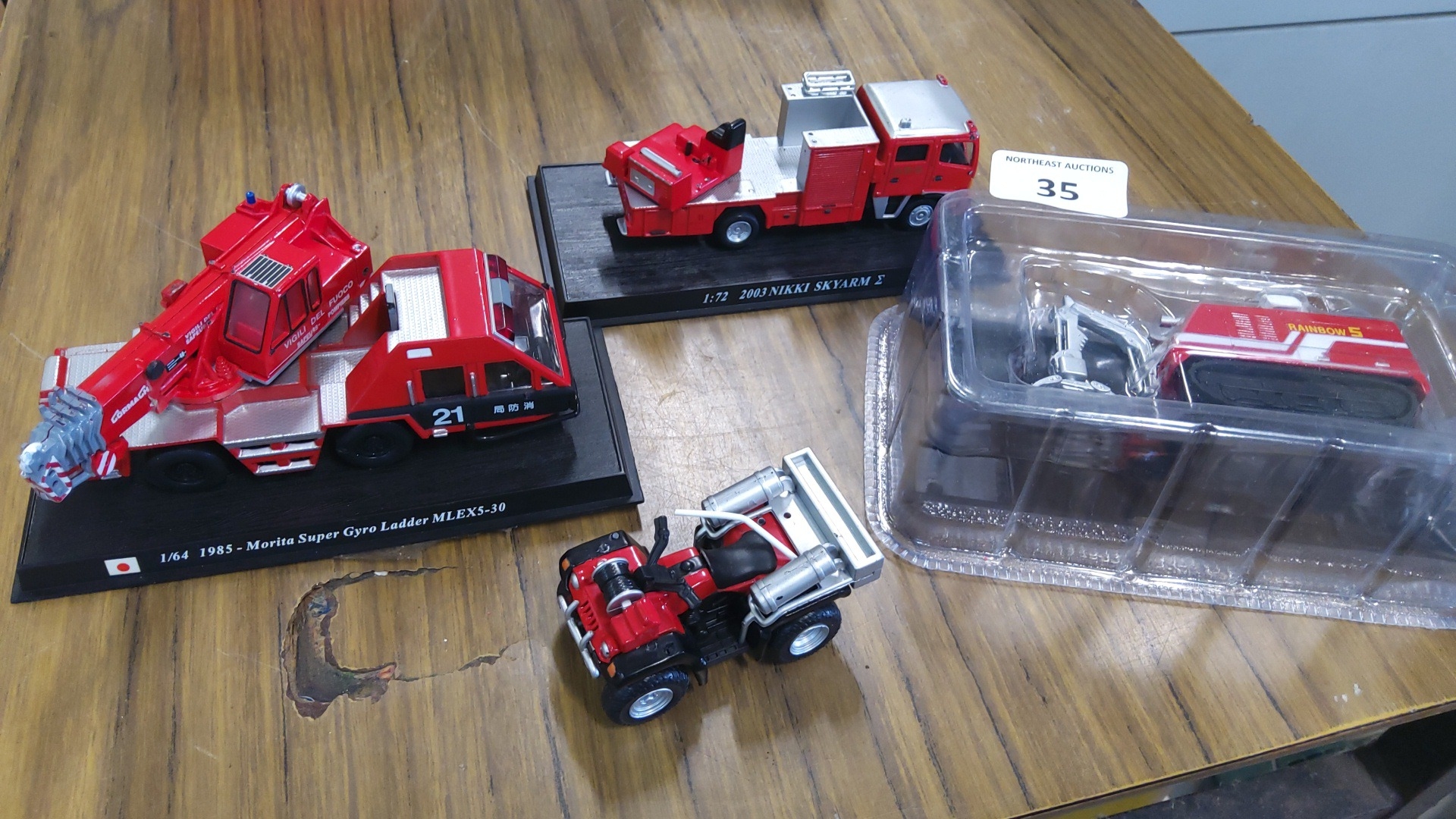 A group of die-cast scale models including a Morita Super Gyro Ladder MLEX5-30 fire appliance on display plinth, a Nikkei Skyarm vehicle on plinth, a small utility vehicle, and a Rainbow 5 tracked machine in blister pack.